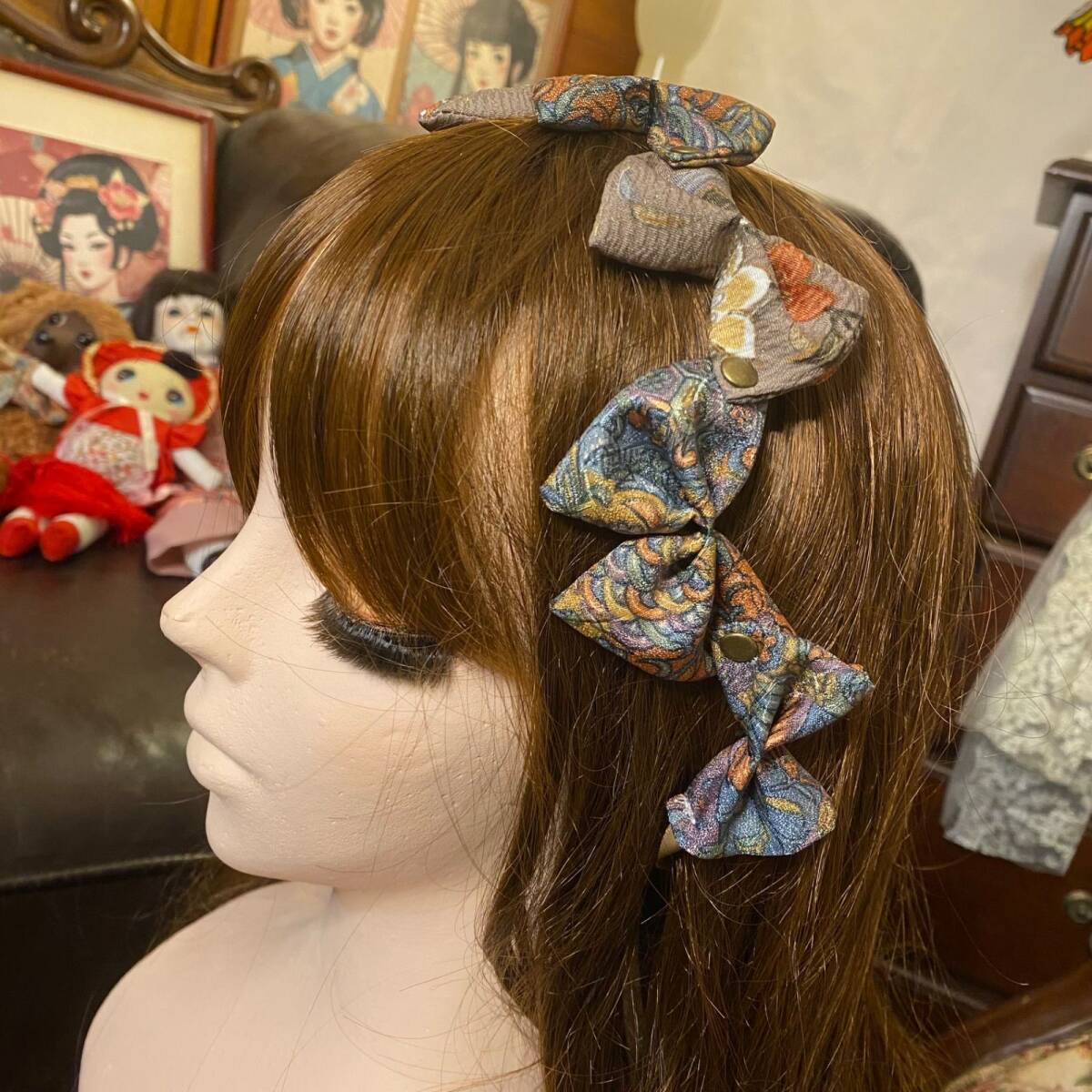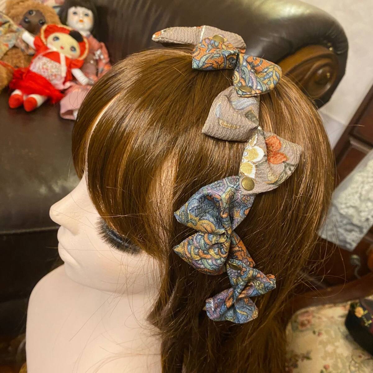 【着物リメイク 帯締め 帯飾り おりぼん ティアラ ヘッドドレス カチューム 2wayヘアアクセサリー 和洋折衷 レトロ 和ロリータ シックな灰みブラウンをベース K-7】