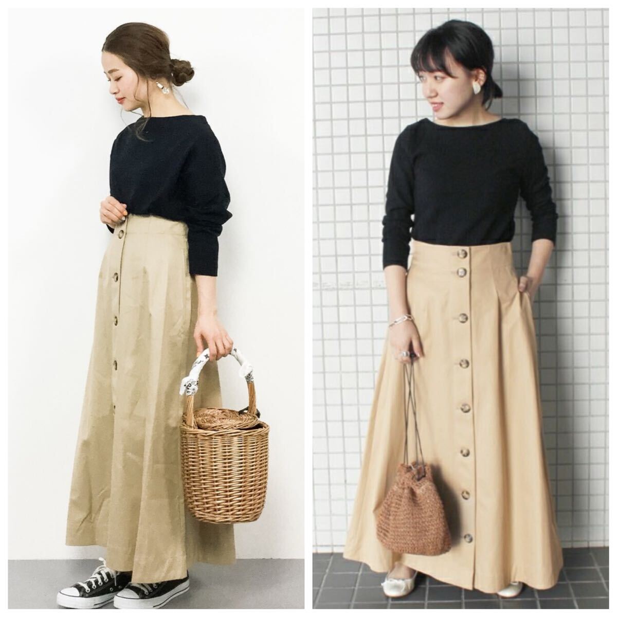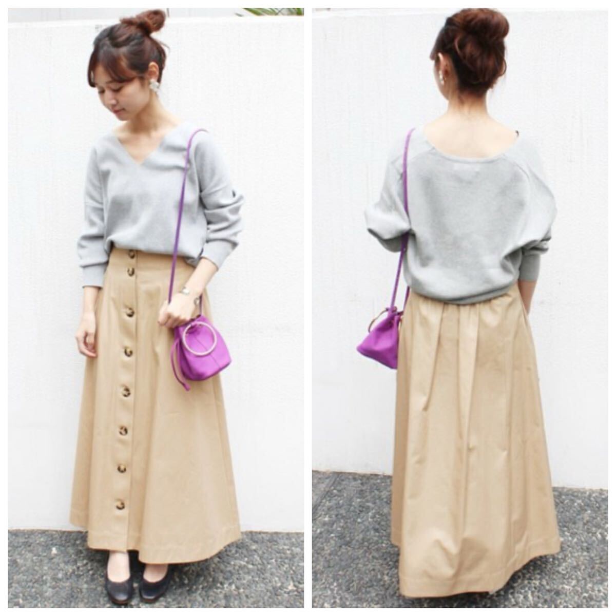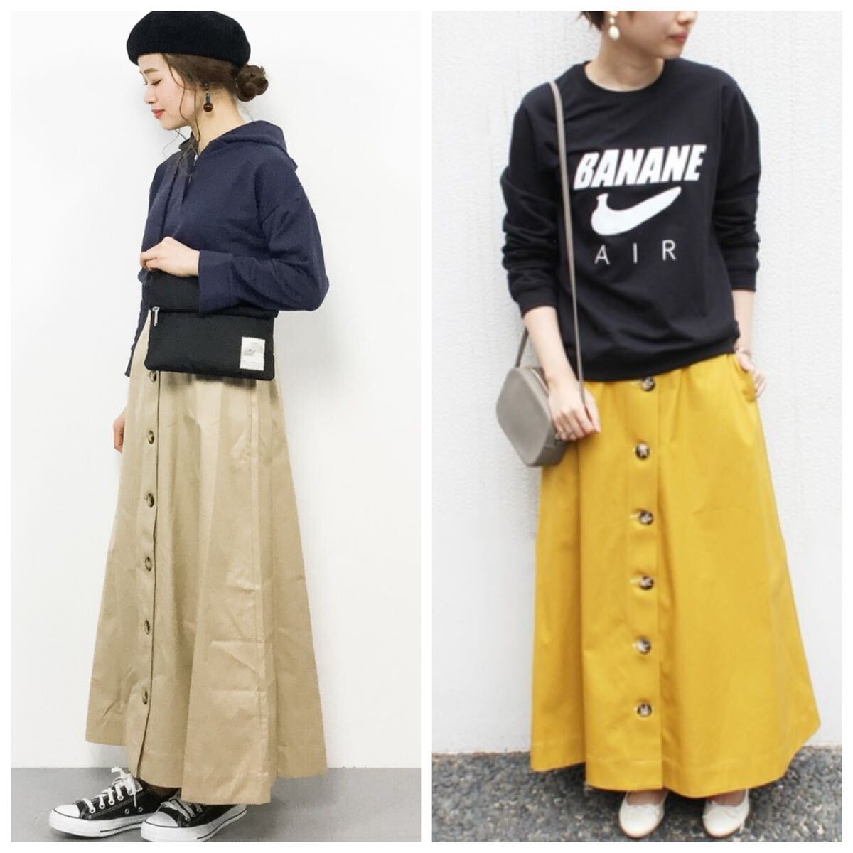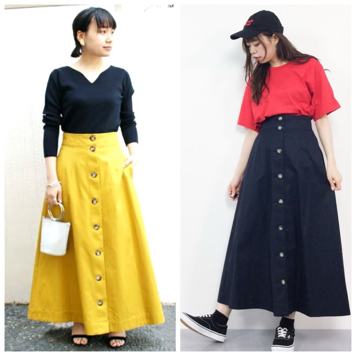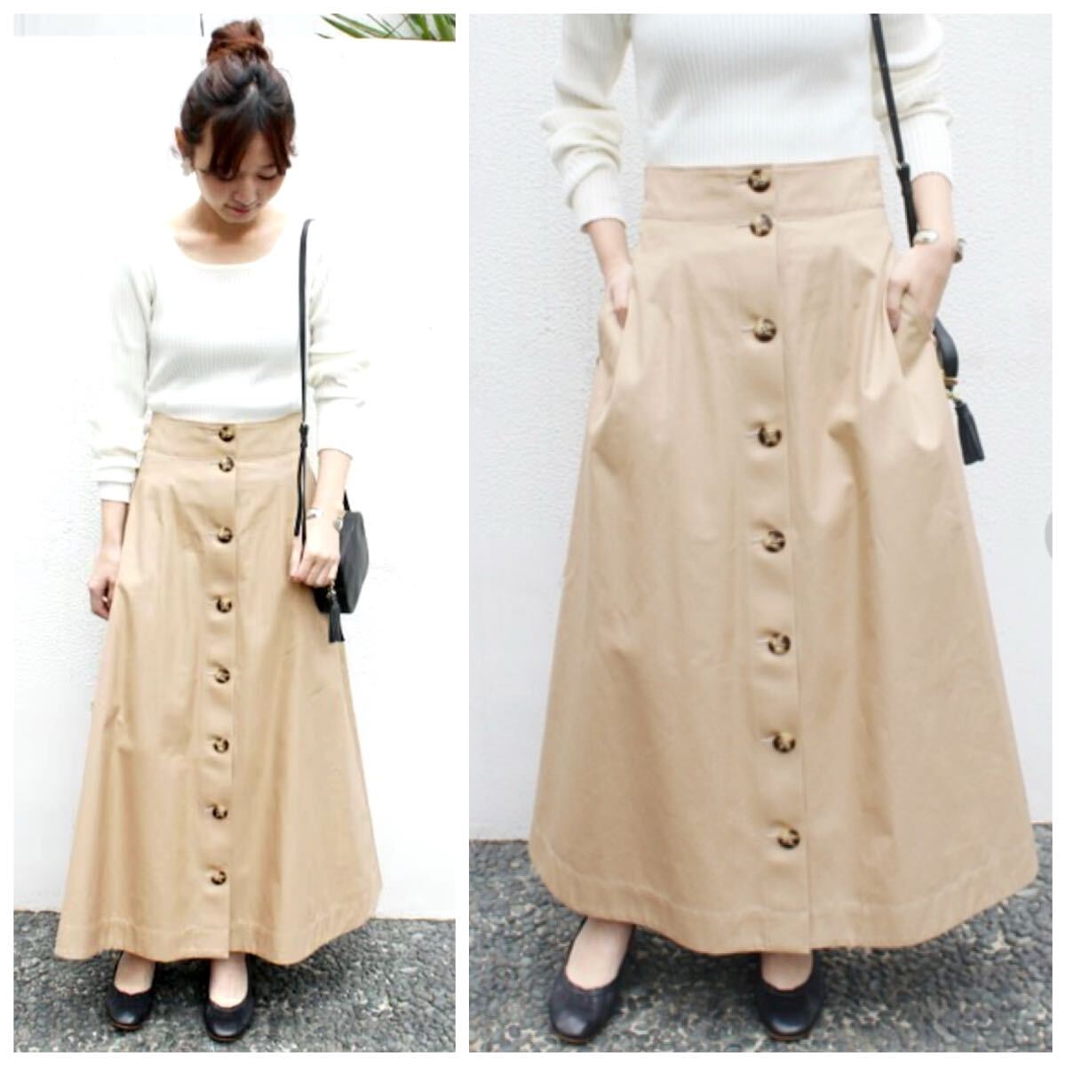 大きめのフロントボタンがトレンドライクなロングスカート。