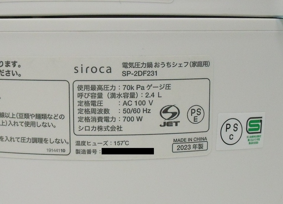 未使用!シロカ 2.4L電気圧力鍋 おうちシェフ SP-2DF231囗T巛 | ||||||||||||||||||||||