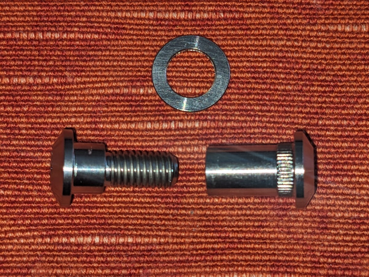チタン製シートピンです。カンパニョーロ製は締めすぎると良く折れますので、軽量で丈夫なスペシャルパーツを入手しました。太さ8㎜、フランジ部12.4㎜、取付部の幅19(最大23㎜位まで)、ワッシャー厚み1㎜、重量6g。カンパニョーロ製シートピンと置き換えOKですが、特殊なフレームやシートラグでは使用出来ない場合もあります。1個のお値段です。