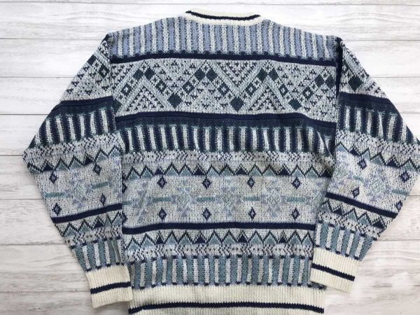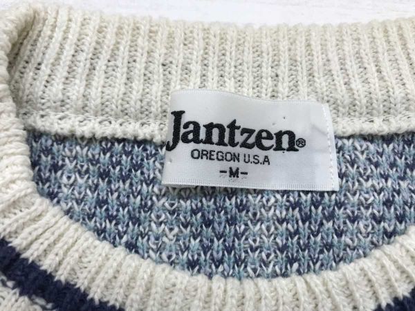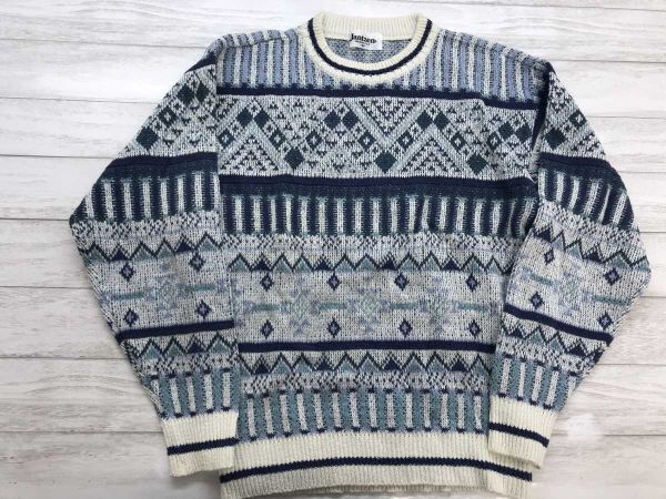 ジャンセン Jantzen オールド レトロ アメカジ古着 ノルディック ジャガード 総柄 ジャガード コットン ニット セーター メンズ M 白 青です。