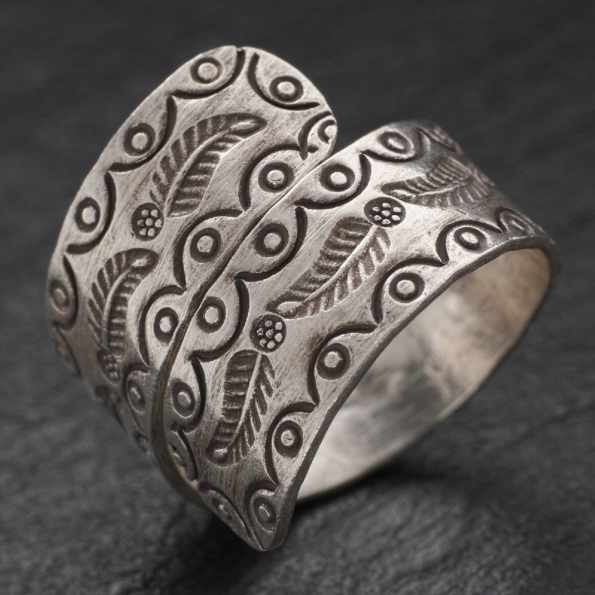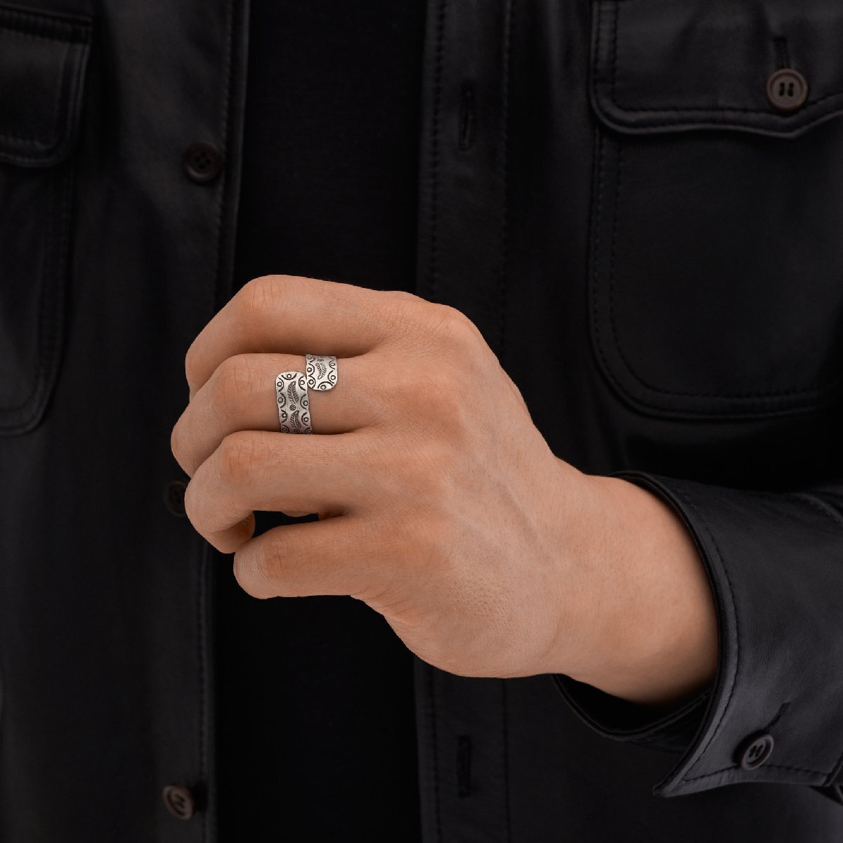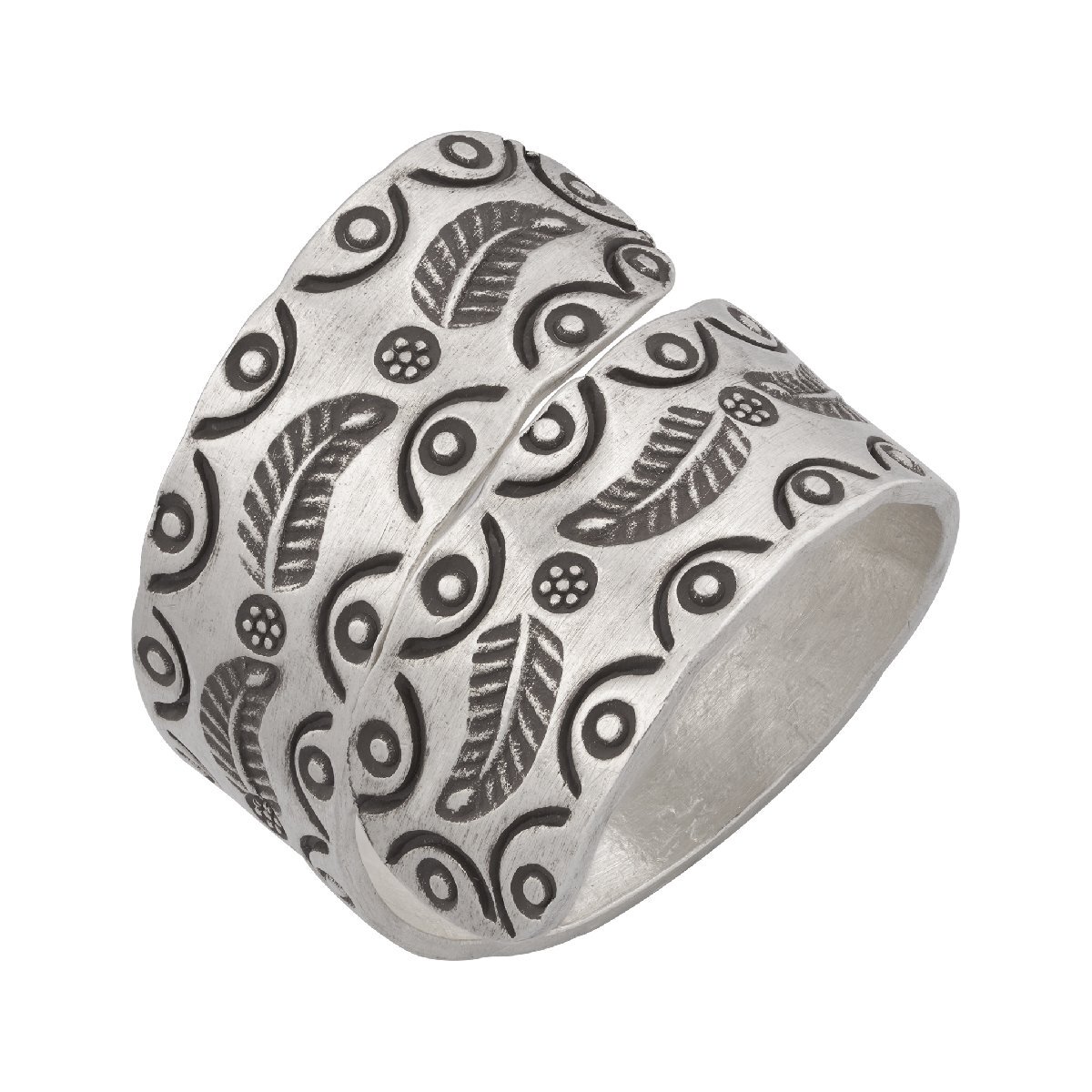 端から端まで施された羽根文様 羽根の文様が端から端まで一面ぐるりと取り囲む、平打ちのカレンシルバーリングです。 自然との調和を重んじるカレン族の美意識が感じられるデザインです。 指を包み込みような幅のあるリングながらも、しなやかで柔軟性のあるスパイラルは指に優しく馴染みます。 メンズ/レディース兼用。フリーサイズ。純度の高い銀を使用しているので柔らかく、サイズを自由に変えられるのが特長です。 カレン族の手仕事によるシルバーリング カレンシルバーはタイの山岳民族カレン族の手仕事により、伝統的手法で丹念に作られます。 マットな質感が特徴で、刻印一つ一つが異なる表情を持ち、素朴な温かみが心に響きます。 自然と共存する彼らの作るものには、身近に暮らす動植物や生活道具などを象ったものが多くあります。 そこには自然を畏れ敬うアニミズムの思想が流れています。 カレンシルバーの銀純度 シルバーはやわらかい金属です。 純銀では傷がつきやすく装飾品に向かないため、耐久性や強度を補う目的で銅などの金属を混ぜ合わせます。 一般的な装飾品は銀92.5%+銅7.5%の合金が用いられます。 これはスターリングシルバー(Sterling Silver)、SV925と呼ばれます。 カレンシルバーは銀95%+銅5%のSV950が用いられます。 SV925は昔ながらの手仕事には固すぎるためです。 ※入荷時期によって色味、形状、表情に個体差があったり、若干の違いが生じる場合があります。 ※色はできる限り正確に表現するよう努めていますが、モニターやモバイル機器の設定、撮影時の照明、写真の拡大などの違いにより、実物よりも大きく太く、実際の色と異なって見える場合があります。 キーワード リング 羽根 【素材】 SV950(銀純度95%) 【寸法】 直径約21mm×幅約17mm×厚さ約1mm 約5g 【サイズ】 フリーサイズ 11号~29号で調整可 掲載写真は17号 【生産国】 タイ ![]() サイズガイド