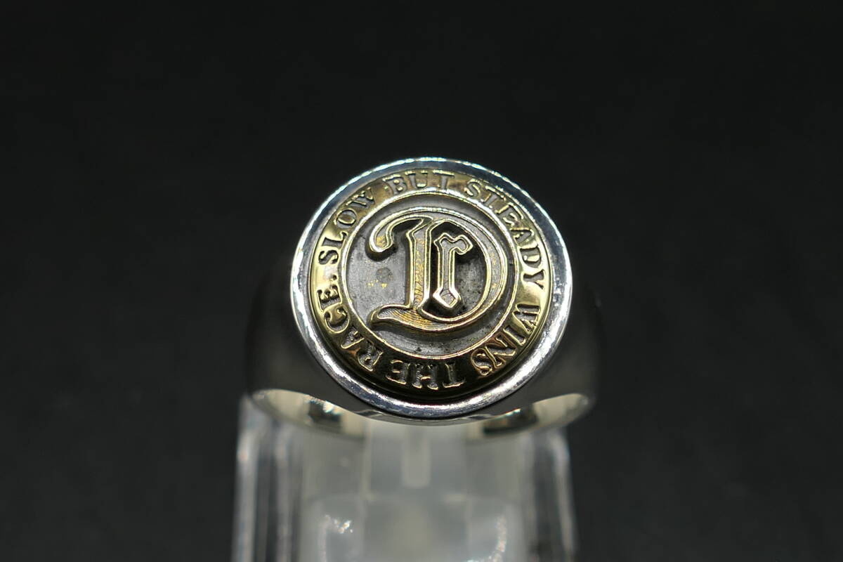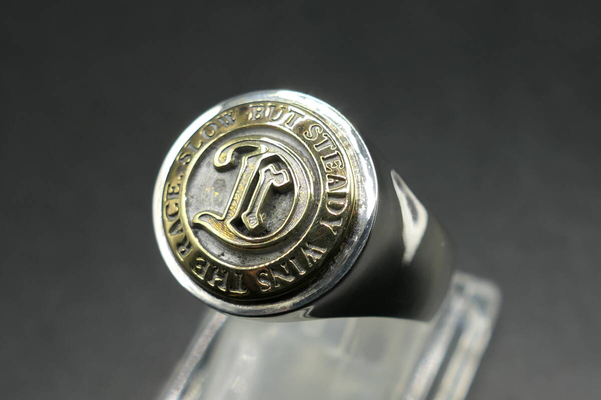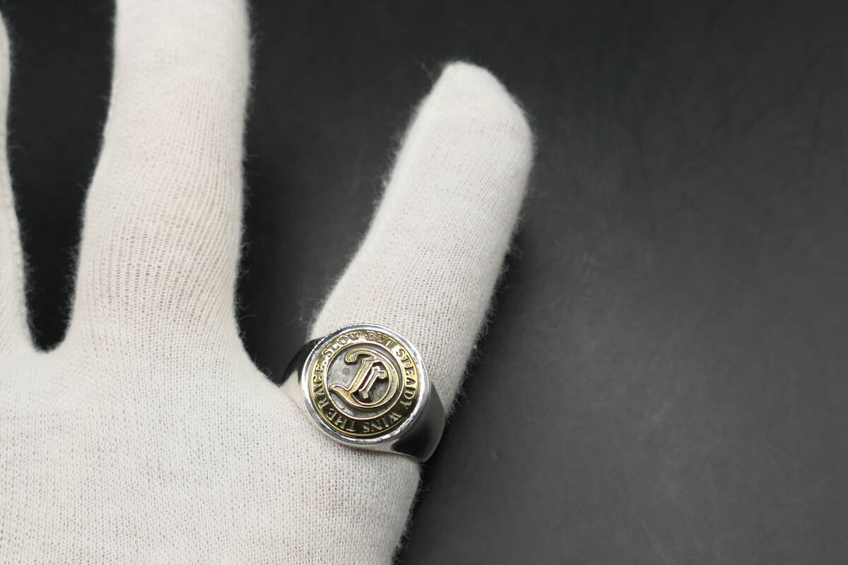 ドクターモンローのロゴが入ったコンチョパーツを主役にした、カレッジリング風のデザインのリングです。