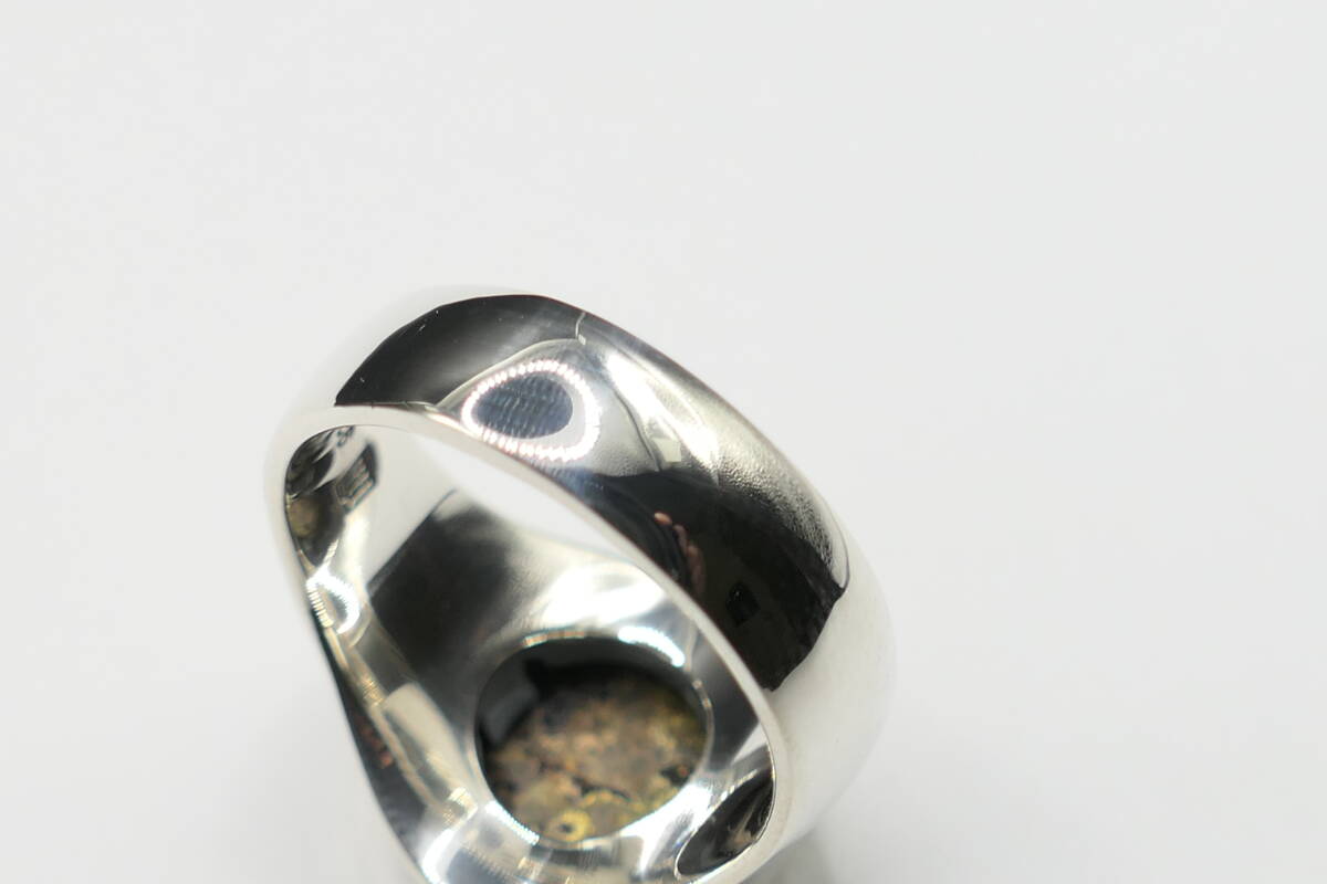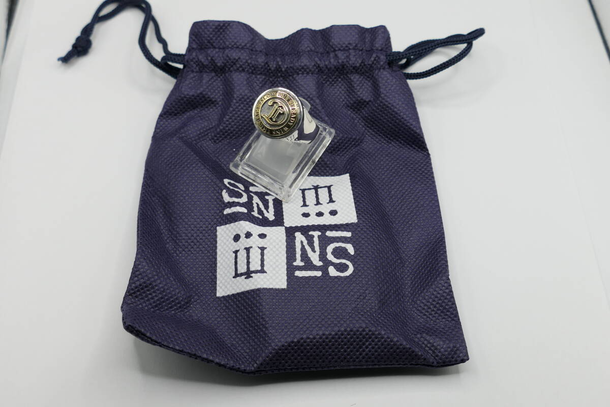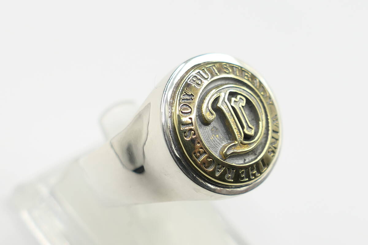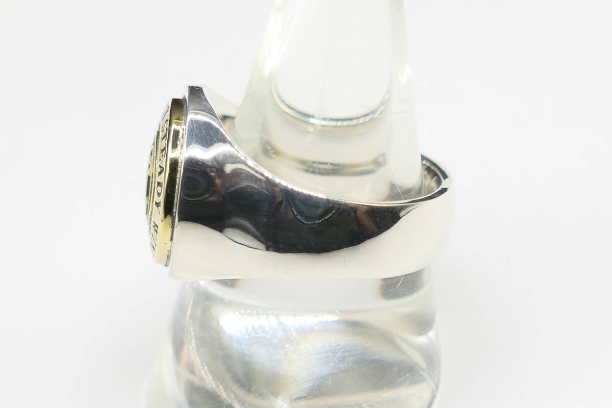 ドクターモンローのロゴが入ったコンチョパーツを主役にした、カレッジリング風のデザインのリングです。