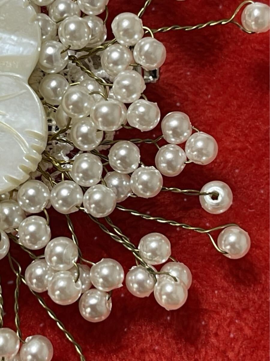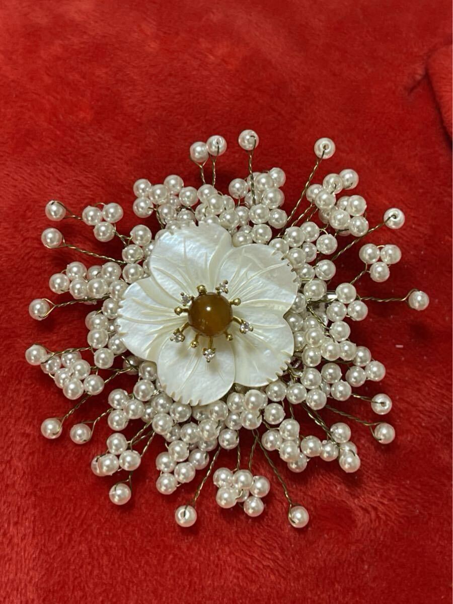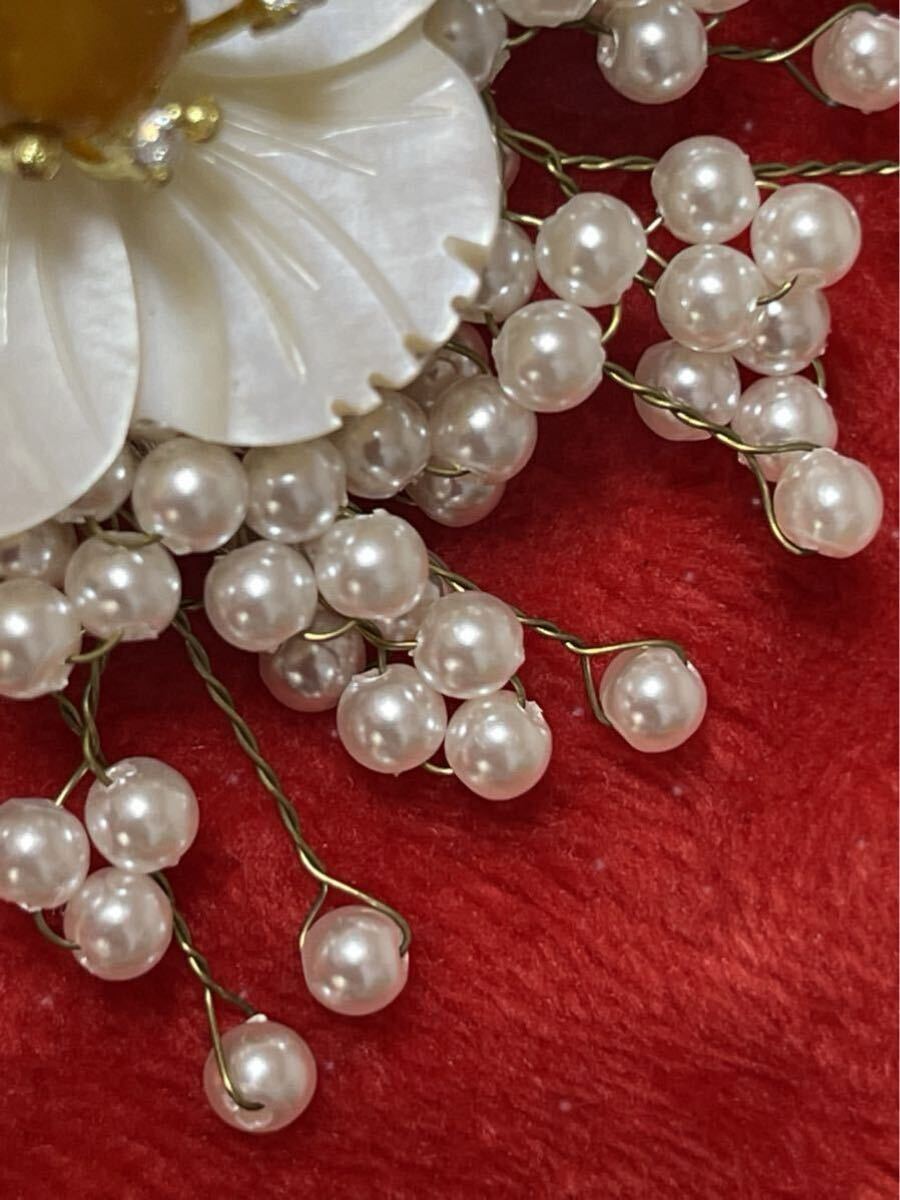 【商品説明】:天然シエル、淡水パール、黄色玉髄使用、桜モチーフしたブローチです。裏にはピンとクリップがついてるので、ブローチとヘアアクセサリー両用です^_^