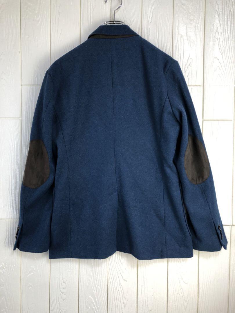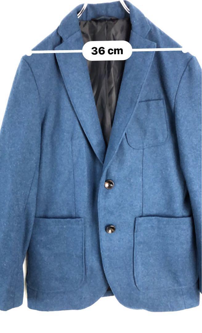 青色のテーラードジャケット、肩幅36cm、着丈61cmでスタイリッシュなデザイン。