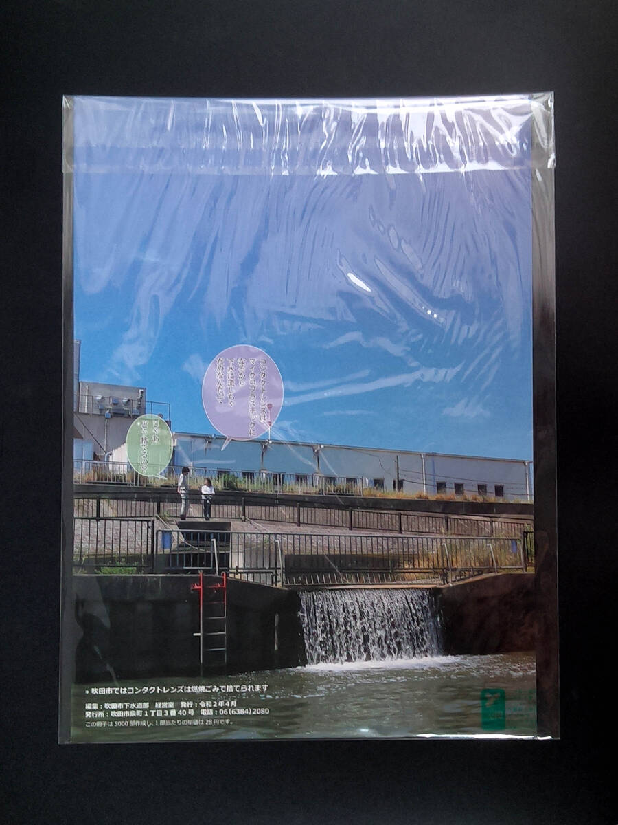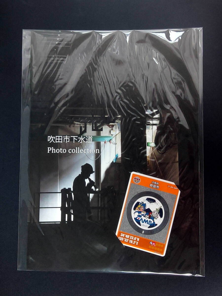 ガンバ大阪のキャラクター「ガンバボーイ」と吹田市のゆるキャラ「すいたん」がデザインされたマンホールカード。吹田市下水道部のリーフレット付。