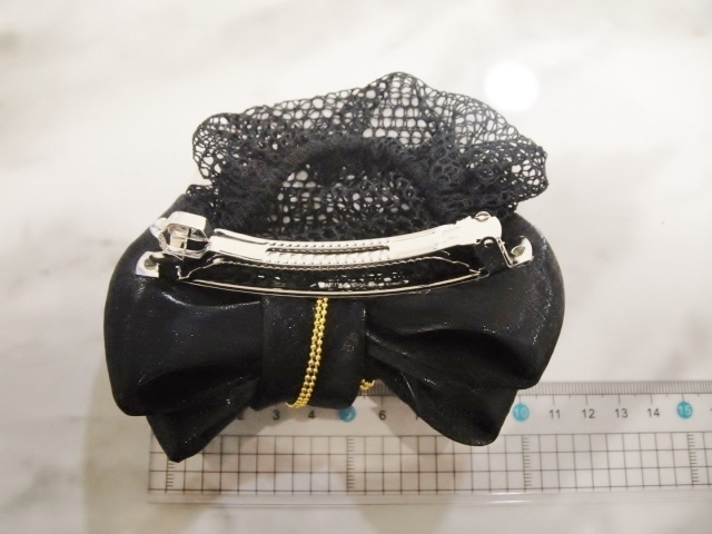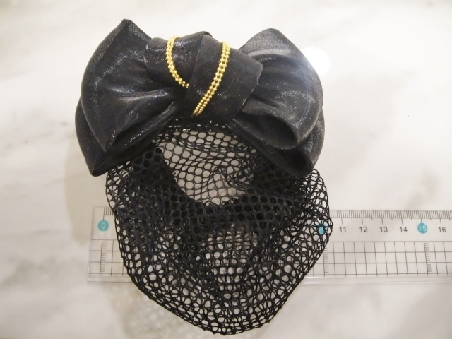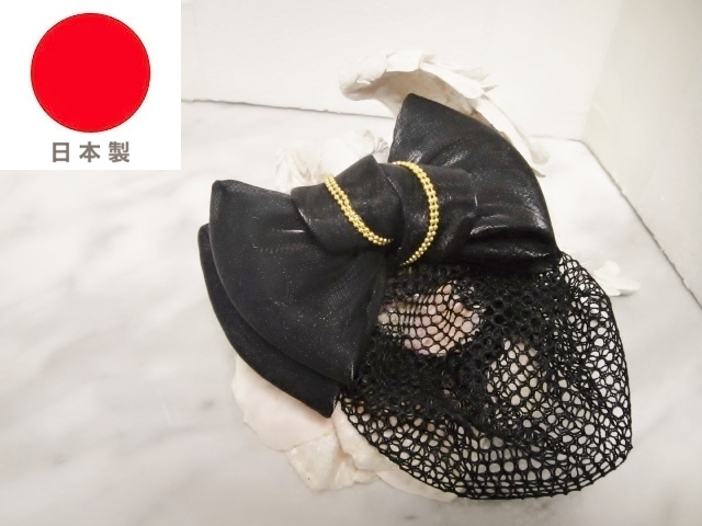♪ 新品 日本製 Made in Japan バレッタ/ネット付き『高品質/ラメオーガンジー/GOLDボールチェーン巻き/ダブルリボン/パールブラック/黒』