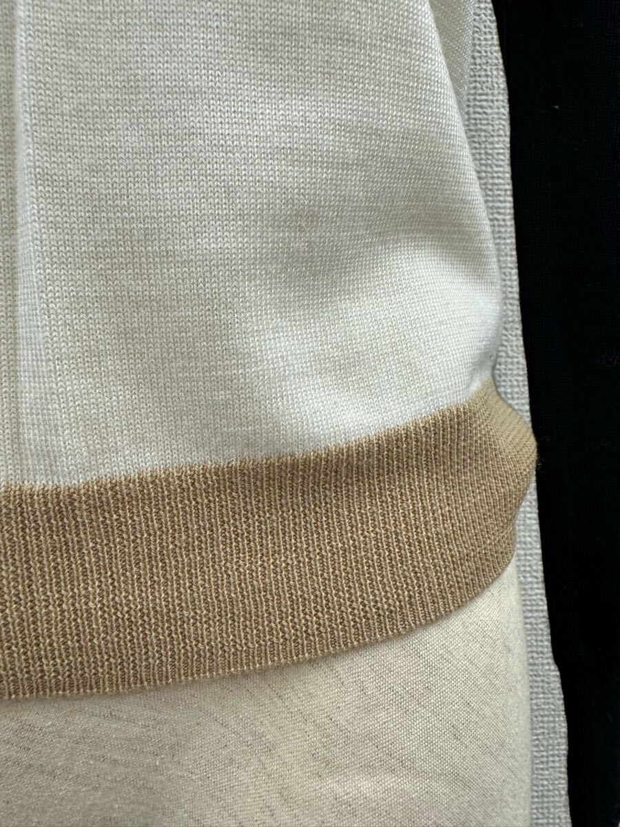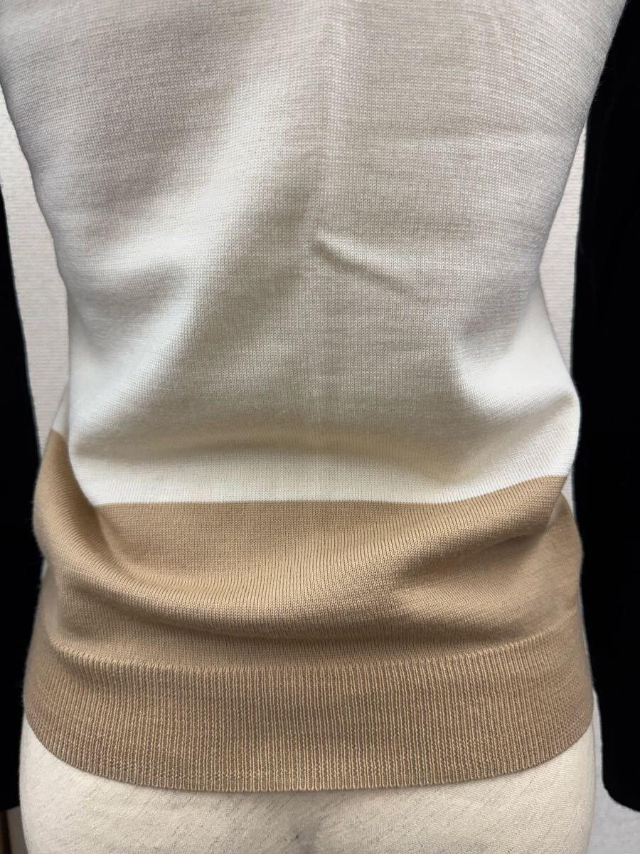 ホワイトとブラックのVネックセーター、カジュアルなスタイルでゴルフにも最適。