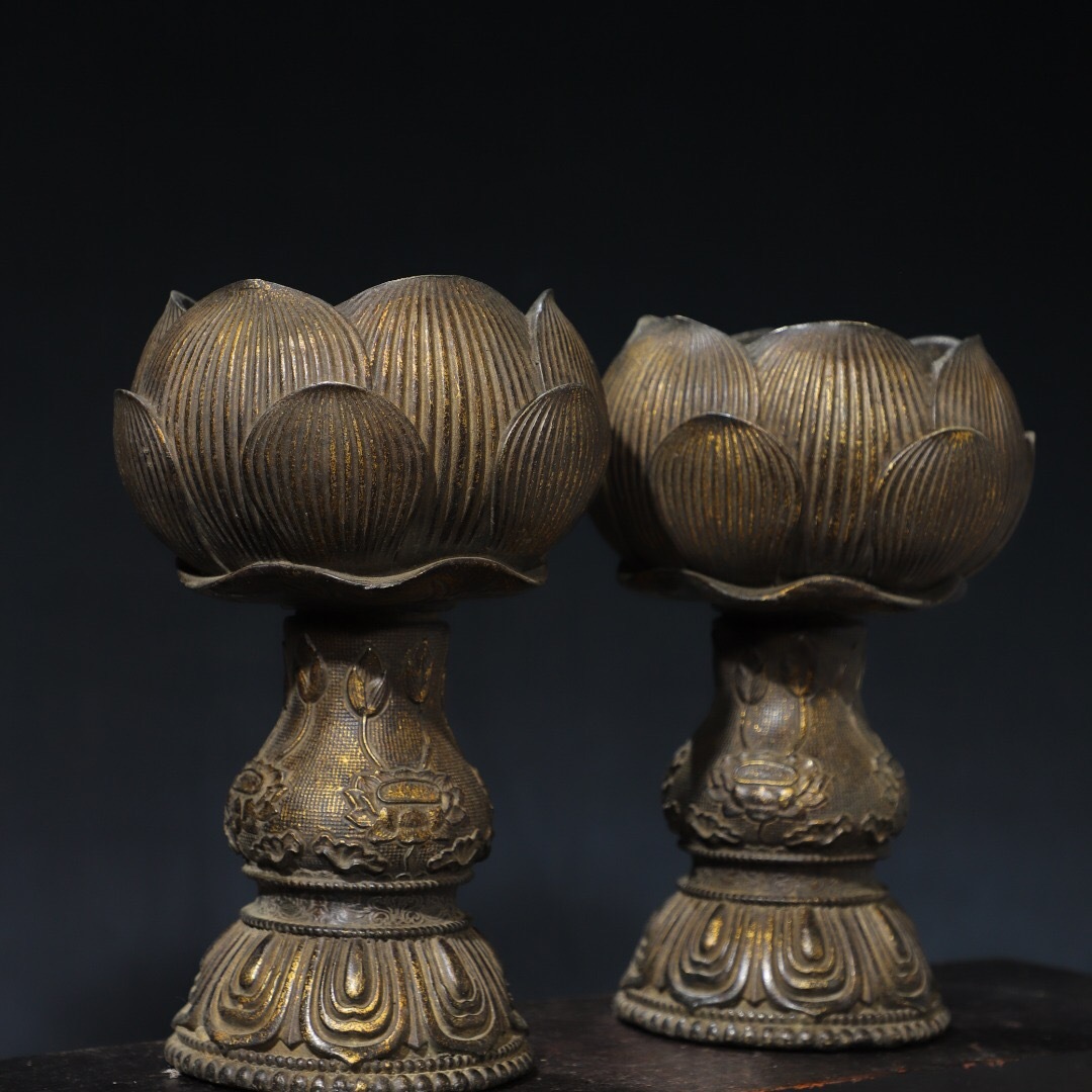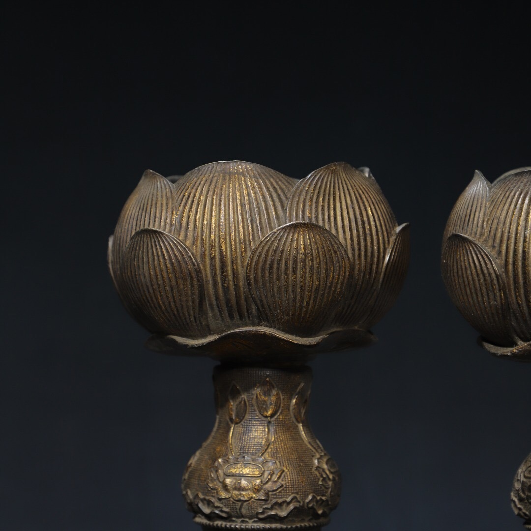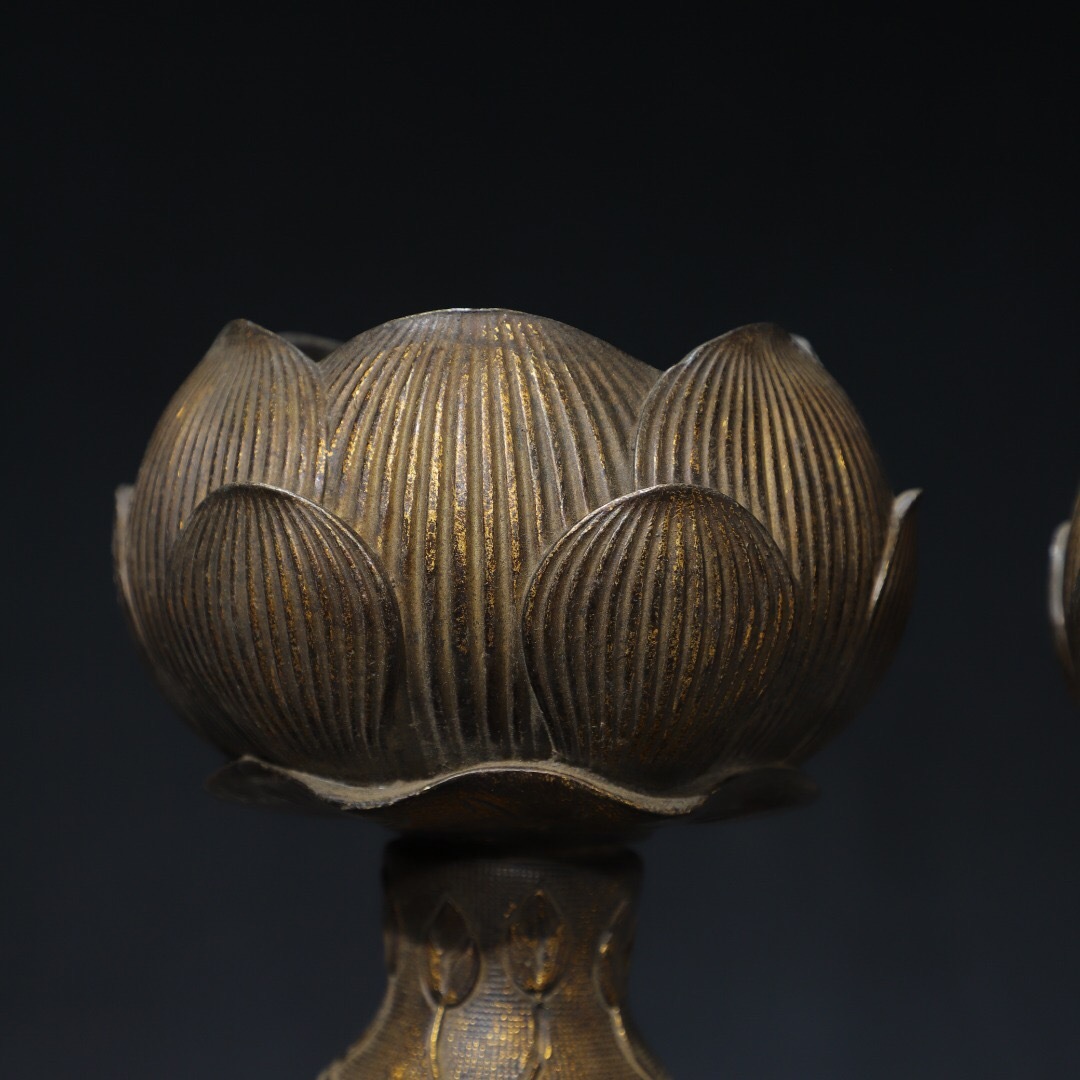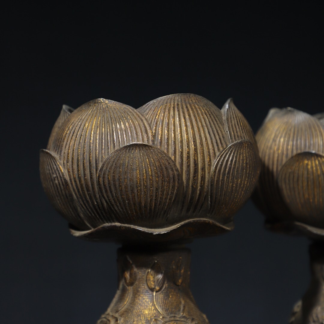 | 【蔵友館蔵品・銅製・拓金・蓮花燈台一對・置物・賞物】・古董品・中国古玩・時代物・希少珍品・中国時代美術 |