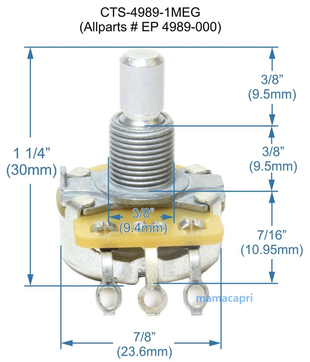 ・1MΩ(高い抵抗値により、明るくクリアなトーンを維持) ・Aカーブ(オーディオカーブ) ・ソリッドシャフト(セットスクリュー固定式のノブに対応) ・ソリッドシャフト径: 1/4″ (約6.35mm) ・インチサイズ ・ネジ切り部の径: 3/8″ (約9.5mm) ・ネジ切り部の長さ: 3/8″ (約9.5mm) |