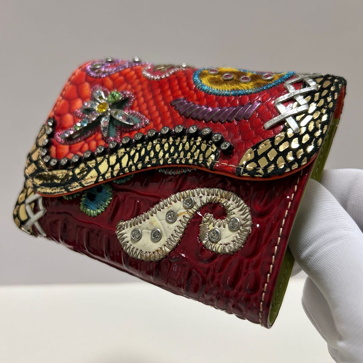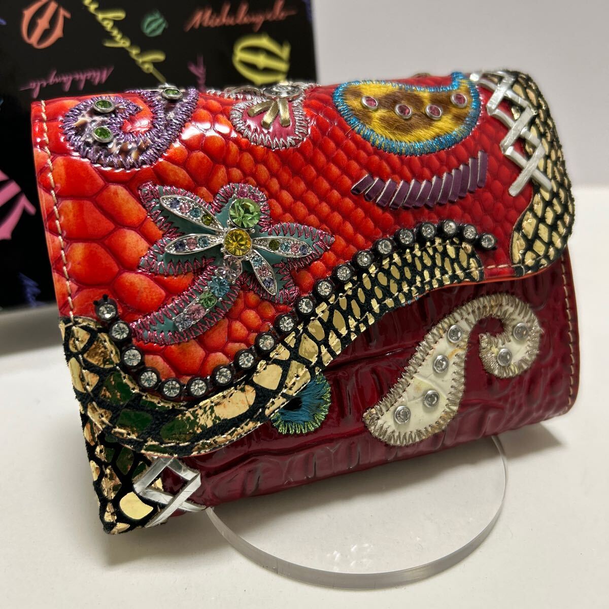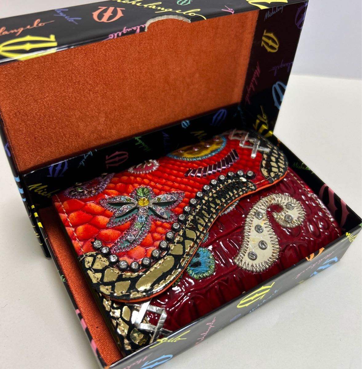 ☆良品-箱付き☆ ★MICHELANGELO ミケランジェロ 三つ折り財布 レッド系★ ビジュー 型押し イタリアンレザー 【送料無料】0606-L1