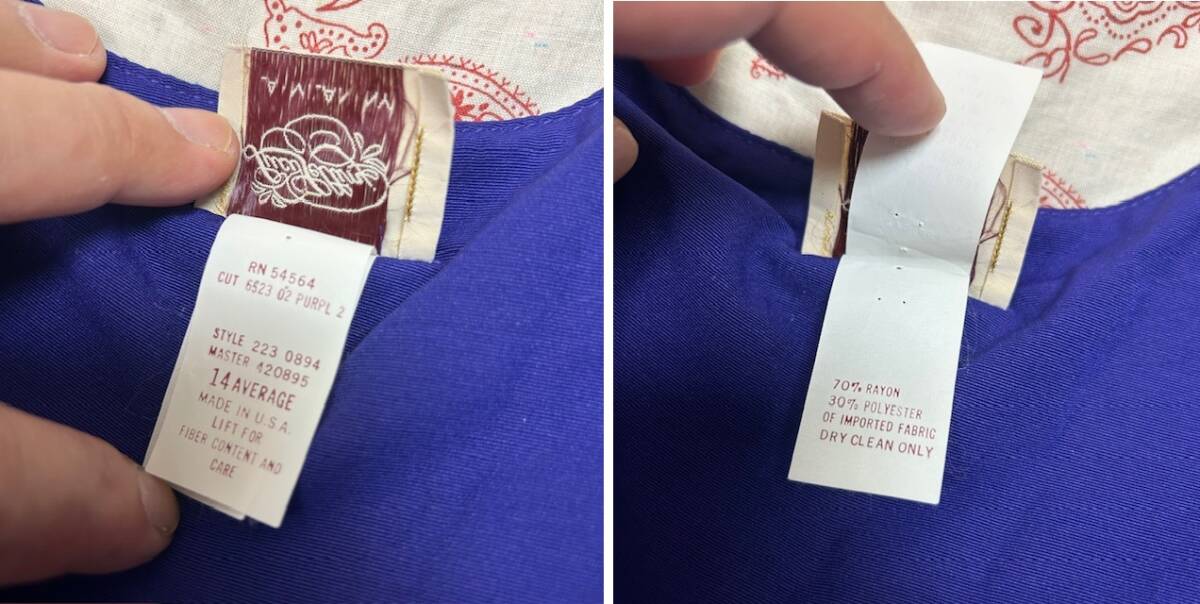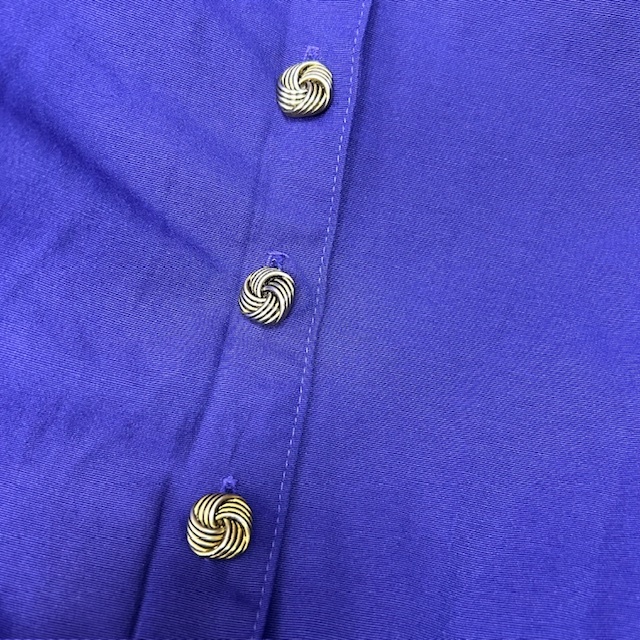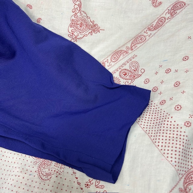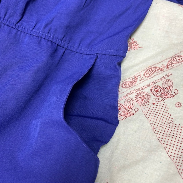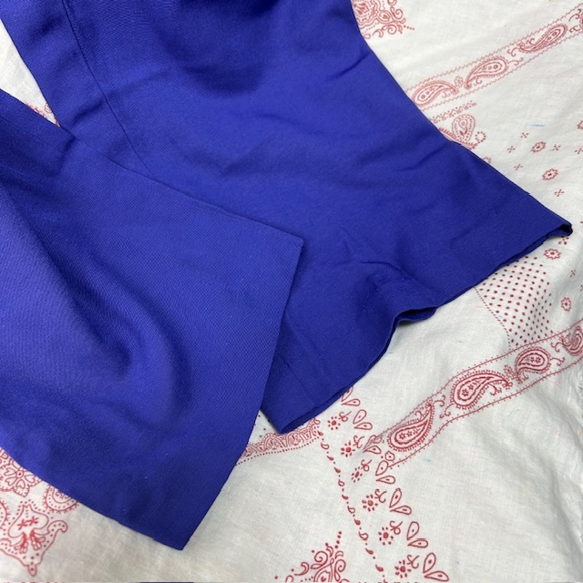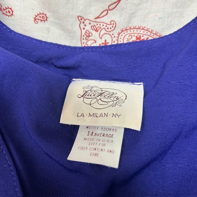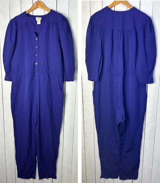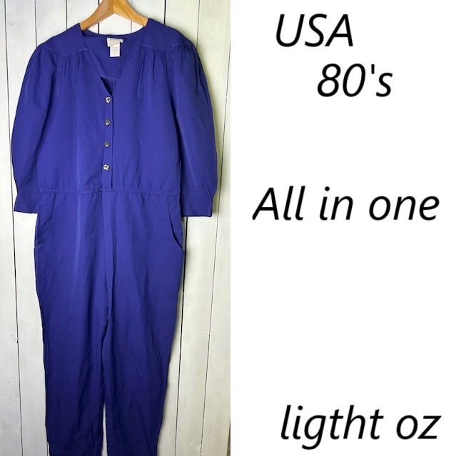 ●商品説明・・・アメリカ古着になります。80年代頃のオールド・ヴィンテージの春夏秋口向けのレーヨンメイン素材のゆったりしたワイドな太腿周りから裾にかけてテーパードしたオールドのレディース物らしいレトロで可愛いシルエット感の5~7分袖程度のオールインワン・ツナギです。メタルメッシュボタンやヨーク周りのギャザーもいいアクセントになっています。。made in USA (アメリカ製)で、素材はレーヨン70%ポリエステル30%の一枚生地で、やや艶感のあるレーヨンのテロっとした質感ながら強度もあるライトオンス(薄手)な生地感です。色は紫(やや青紫寄りのパープル)です。USAの14表記でゆったりしたL~XL程度のサイズ感かと思います。(オールド物ですので、肩パット付きの物は取り外してあります)