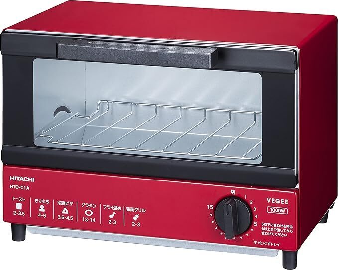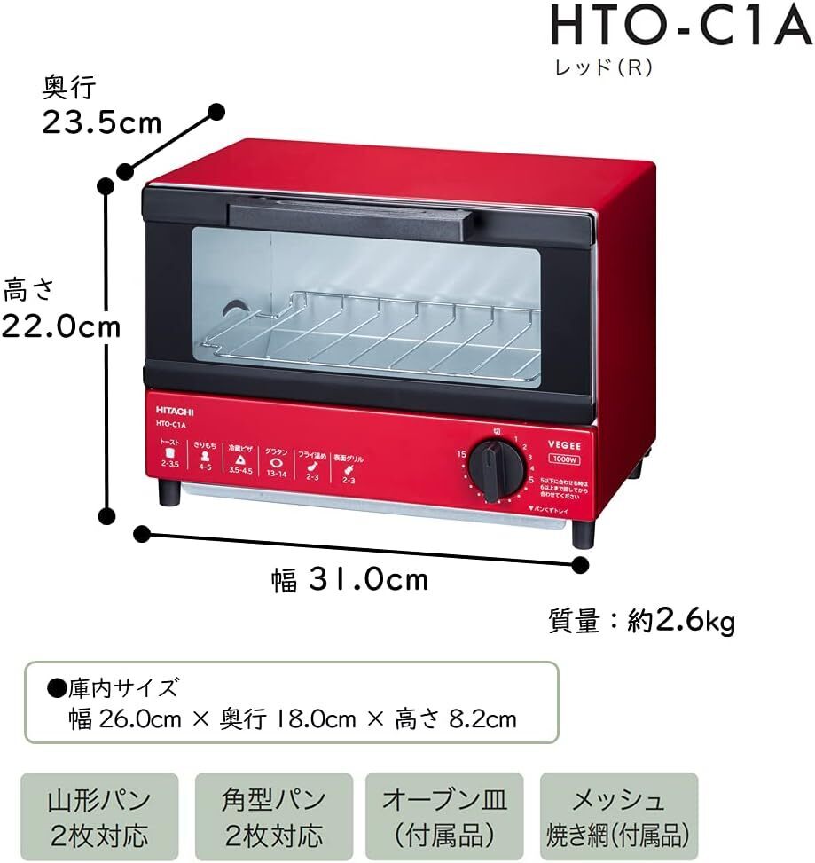 新品日立 オーブントースター 1,000W 一人暮らし 山形/角型パン2枚焼き HTO-C1A R レッド23年製