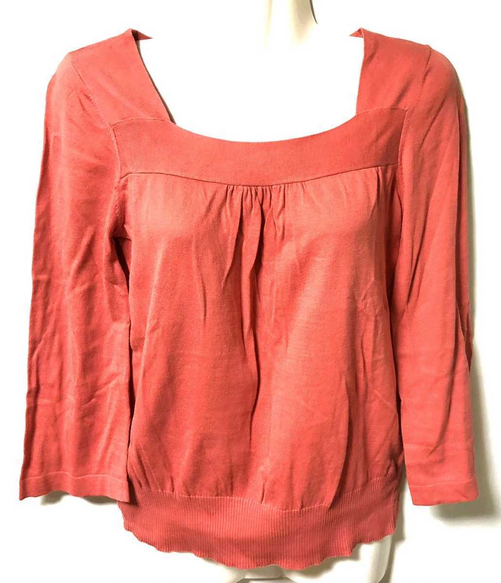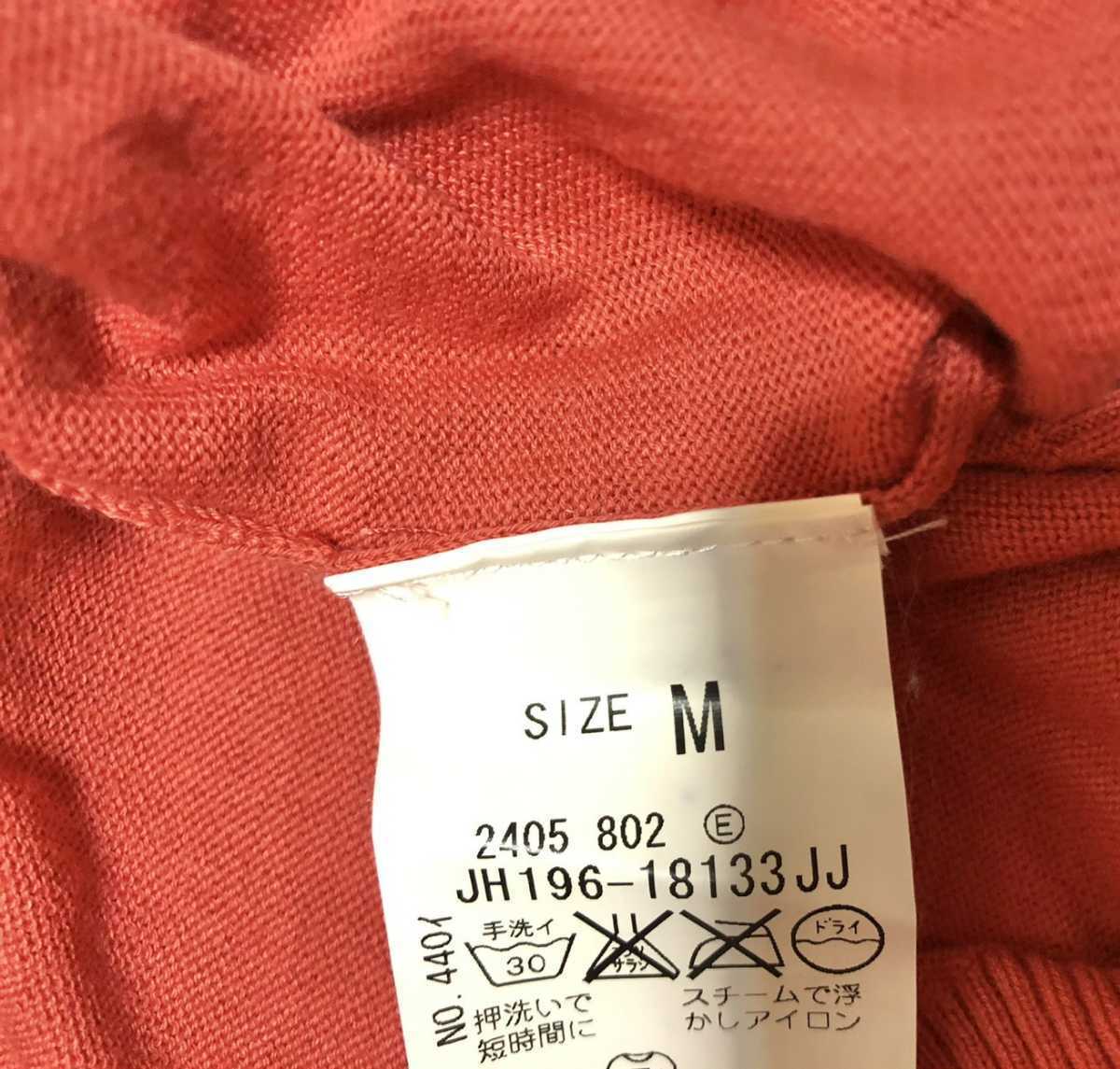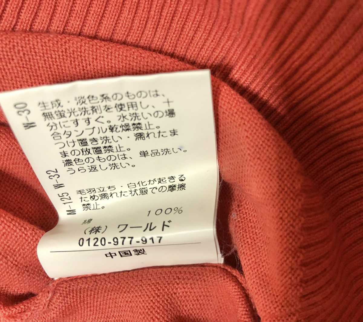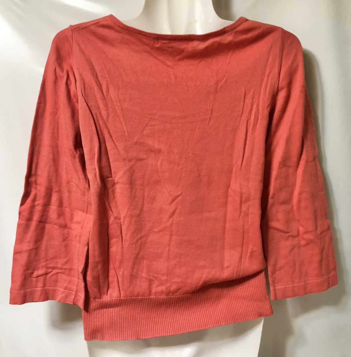 美品 七分袖 カットソー 朱色 ワールド製品 Mサイズ 綿100% 華やか サーモンピンク お出かけ ㈱ワールド 食事会 参観日 PTA総会 ママさん