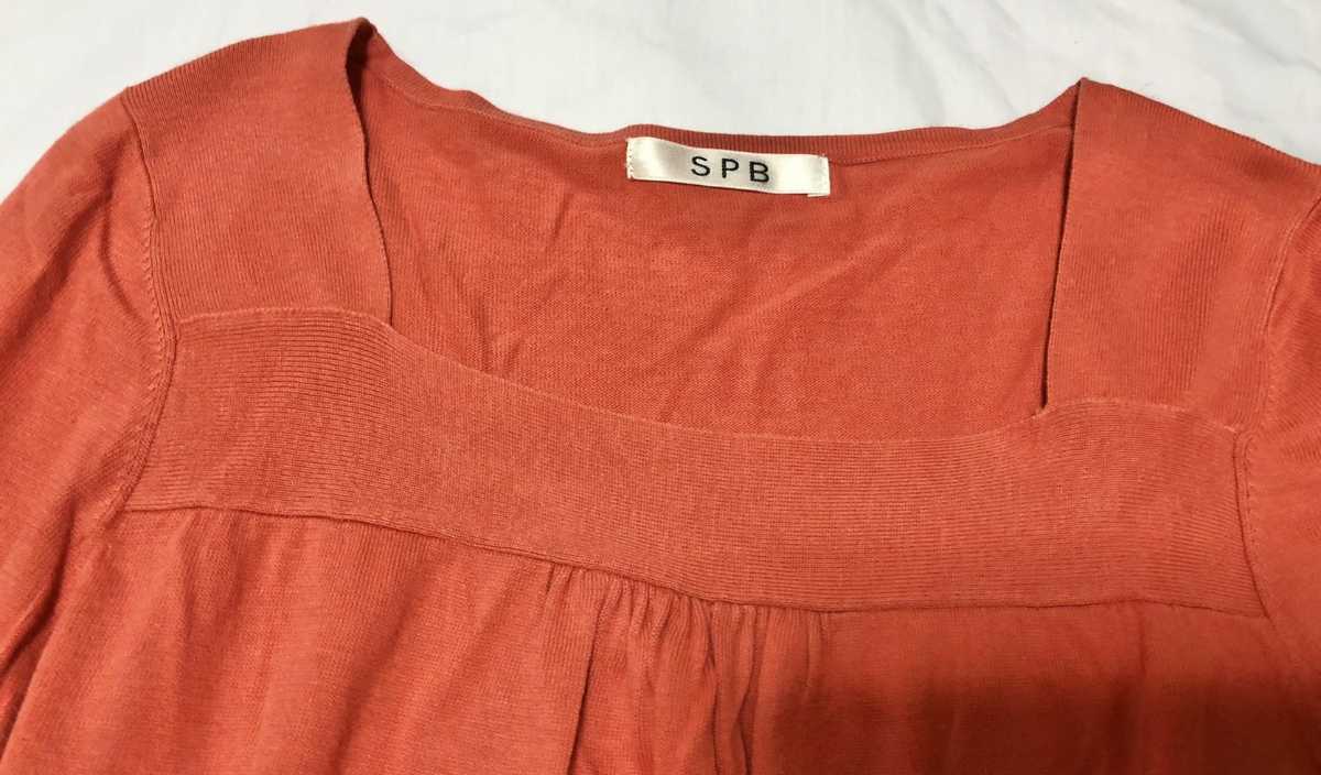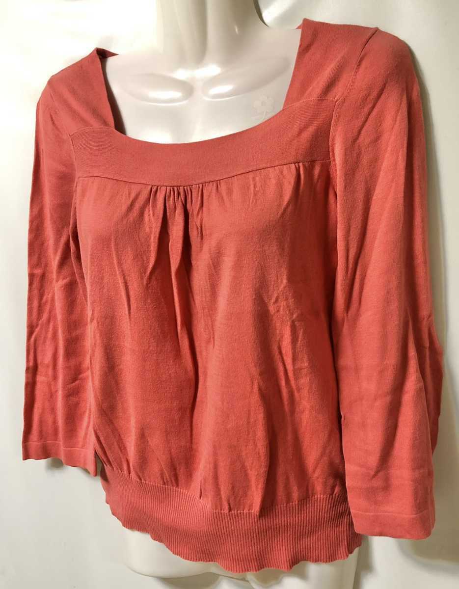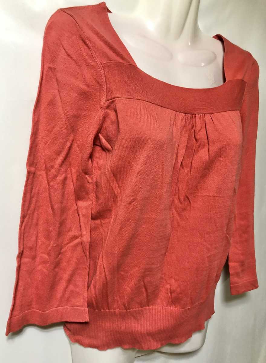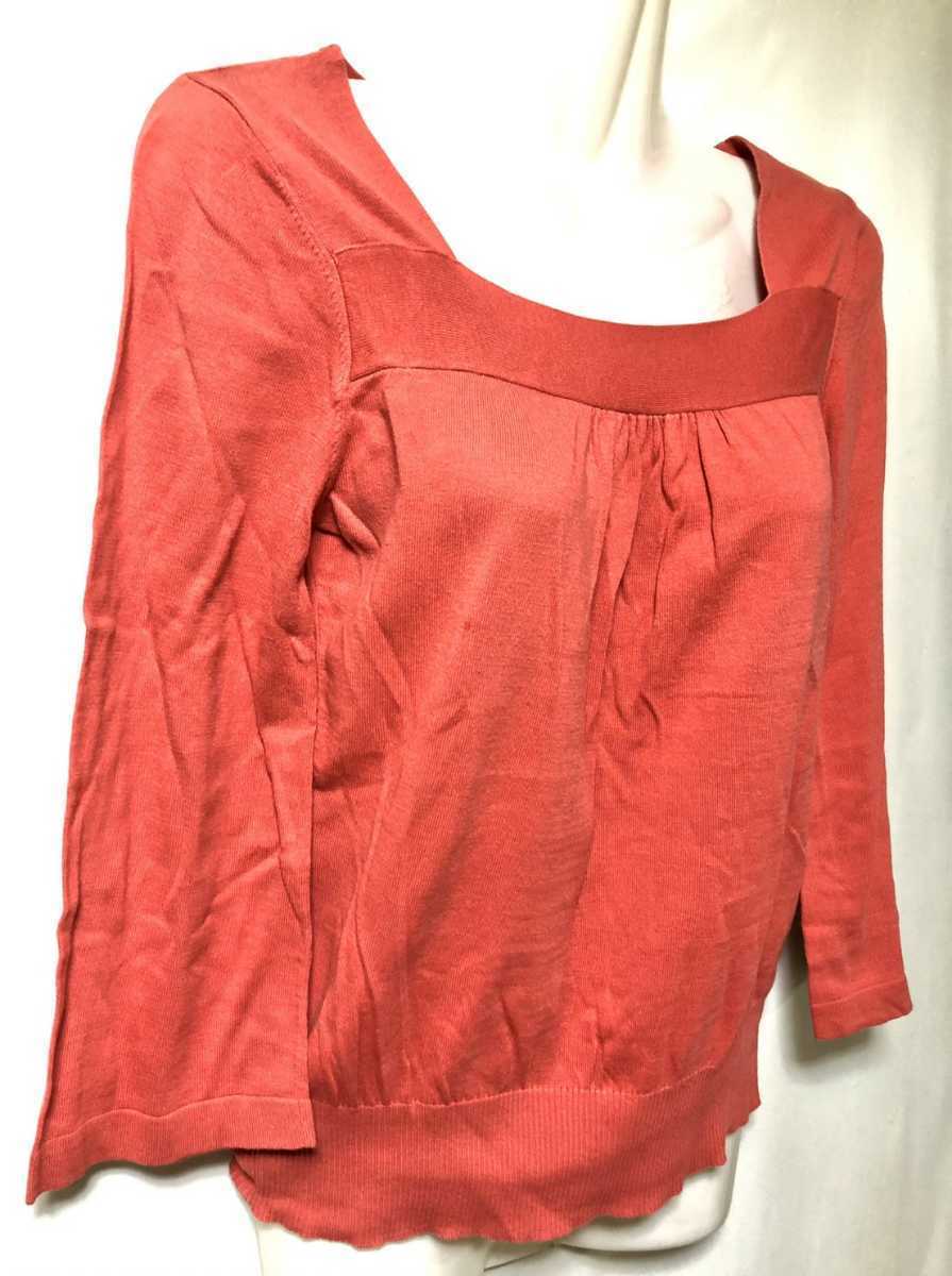 美品 七分袖 カットソー 朱色 ワールド製品 Mサイズ 綿100% 華やか サーモンピンク お出かけ ㈱ワールド 食事会 参観日 PTA総会 ママさん