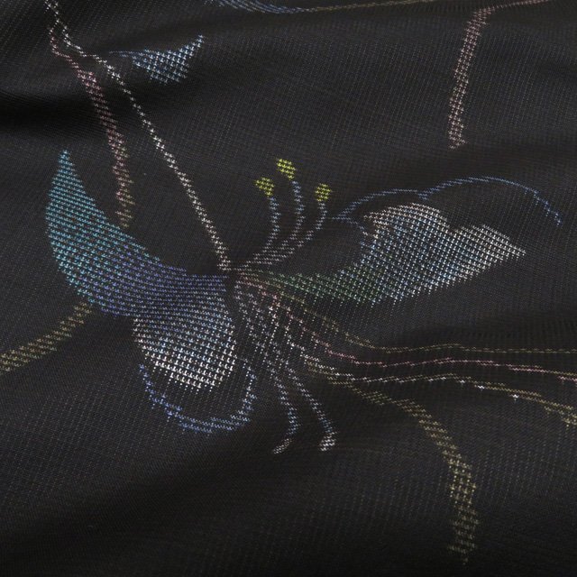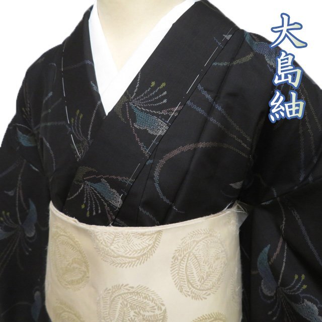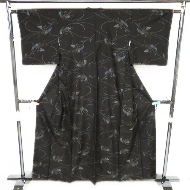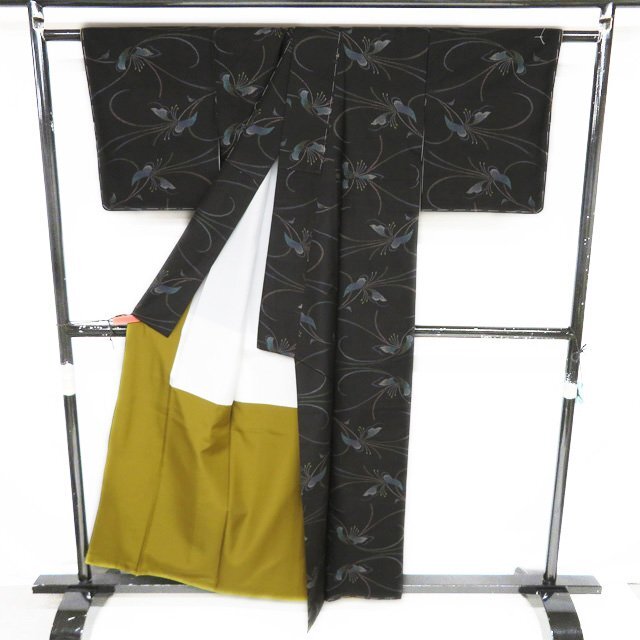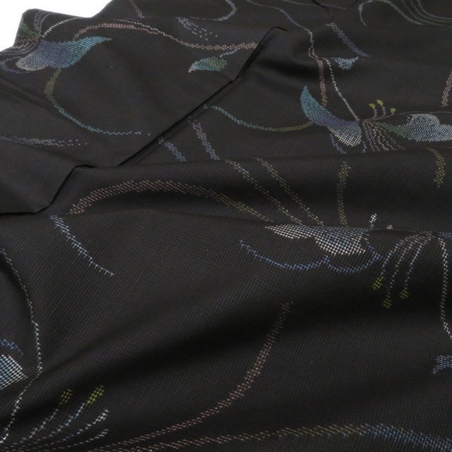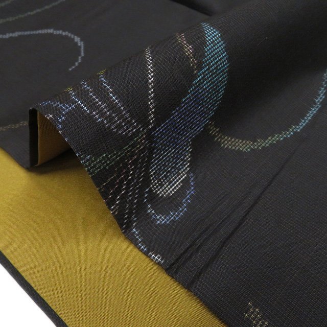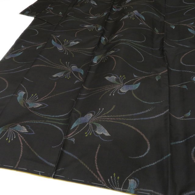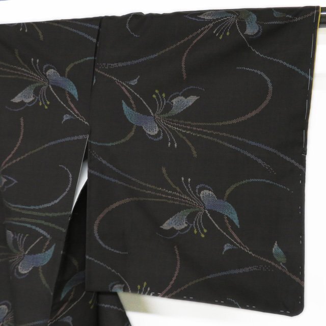 丈157.5cm(+9) 裄63cm(+7) 袖丈45cm(+6) 前幅24cm 後幅28.5cm ※サイズのお直し、承ります。 ※身丈は肩から測っております。 ※()内は※()内の数字はお直しで直せる長さを示しています。お仕立て直しの場合は胴裏を付け替えるため、さらに長く直せる場合があります。詳しくはお問い合わせください。 単位:cm 素材 正絹 商品ランク A ●着用時期 10月~5月(+-2週間) ●着用シーン お食事、お出かけ、観劇、お買い物など ●お色 黒色 多色 ハリがある生地、シュッシュッと耳心地良い衣擦れの音… 軽やかでさらりとした手触りの、たいへん軽く肌心地の良いこの織りあがりを、是非お手元でもご堪能いただきたく思います。 未使用の美しいお品物です。 写真に写っている着物のみの販売で帯等の付属品はついておりません。 一部商品は実店舗・他サイトでも並行して販売しておりますので売り切れの際はご了承ください。 その他多数販売中 ki | ||||||