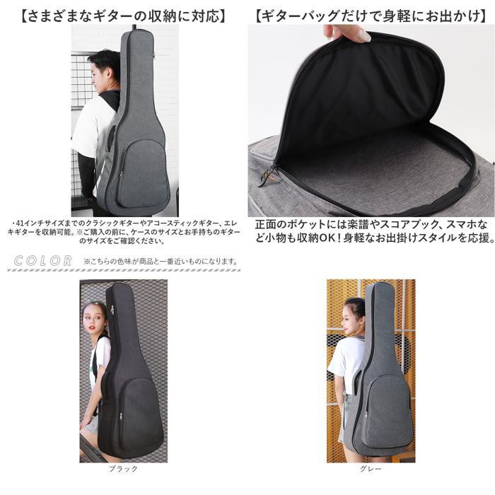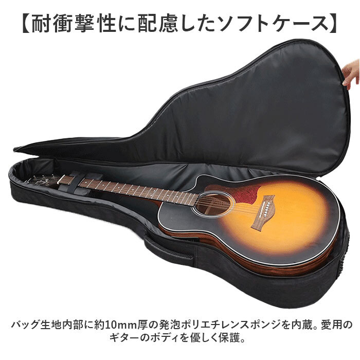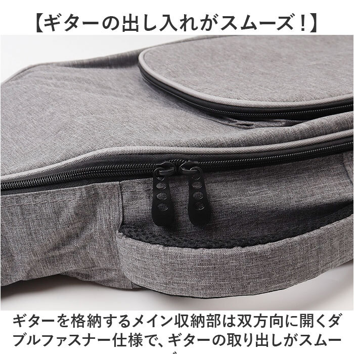商品説明 | ・・【大切なギターを傷つきから守る!】 ・ライブ演奏などで頻繁に持ち歩くギターを、衝撃からしっかりガード!「41インチギターバッグ」 ・【耐衝撃性に配慮したソフトケース】 ・バッグ生地内部に約10mm厚の発泡ポリエチレンスポンジを内蔵。愛用のギターのボディを優しく保護。 ・【ギターの出し入れがスムーズ!】 ・ギターを格納するメイン収納部は双方向に開くダブルファスナー仕様で、ギターの取り出しがスムーズ。 ・【クッションピローでネックが安定】 ・ギターネックに巻き付けて装着し、バッグの中でギターがガタつかない専用クッションポーチが付属。 ・【クッションピローの使用方法】 ・1.予めバッグ内側のネック収納部の面ファスナー貼り付け部に、ファスナーを上にしてピローポーチを貼り付ける。 ・2.ギターネックを、ピローポーチ内部のクッションくぼみに沿わせるようにしてギター本体を収納する。 ・3.ポーチサイドから伸びる面ファスナーテープをギター前面のフレット部で貼り合わせたら完了! ・【ギター小物ポーチにも活用OK!】 ・内部のウレタンクッションを取り外せば、カポタストやチューナー用の小物ポーチとしても大活躍! ・【ダブルショルダーでハンズフリー】 ・リュックのように両肩で背負えるダブルショルダーベルト付きなので、両手が空いて楽々持ち運び。 ・【短距離の移動は側面ハンドルで!】 ・電車やバスに乗る時は、側面のサイドハンドルで周囲に配慮しながらスマートに移動が可能。 ・【長時間の持ち歩きでも快適に】 ・ショルダーとハンドル内側はソフトなメッシュクッションで仕上げ、長時間の移動もサラッと快適。 ・【床置き時の衝撃も軽減】 ・底面の滑り止めパッドが、床置き時のギターへの衝撃を軽減。立て掛ける時のケースの滑りも防ぐ! ・【さまざまなギターの収納に対応】 ・・41インチサイズまでのクラシックギターやアコースティックギター、エレキギターを収納可能。 ・※ご購入の前に、ケースのサイズとお手持ちのギターのサイズをご確認ください。 |