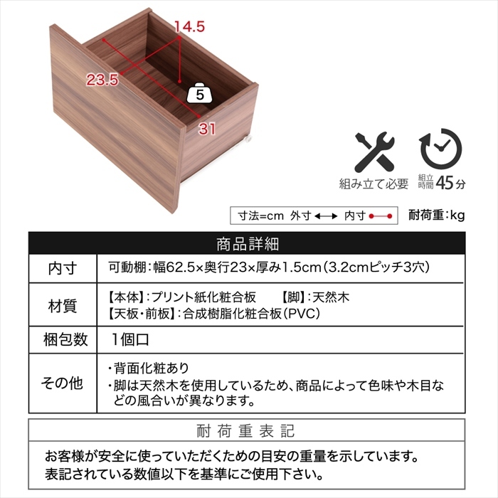 | [本体]プリント紙化粧合板 [天板・前板]合成樹脂化粧合板(PVC) [脚]天然木 |