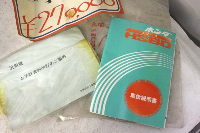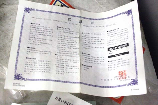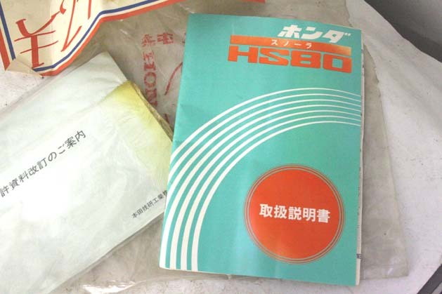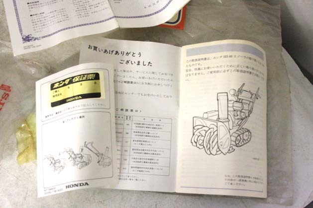 80sホンダ純正、デット未使用、新品未開封の新品未使用のままの、スノーラHS801の新車販売時の取扱説明書、保証書等、未使用非売品の画像の一式セットです。
