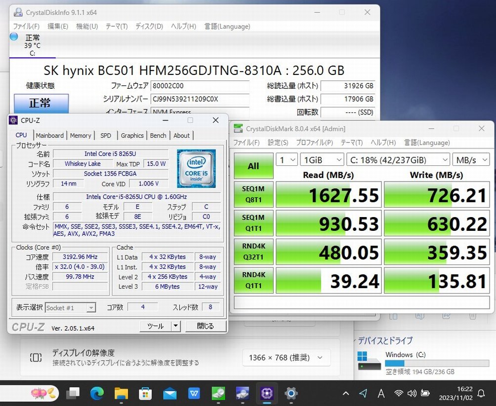CPU: 超高速 Intel 高性能 八世代Core i5-8265u 1.6Ghz、 4コア8スレッド (ターボ・ブースト利用時の最大周波数 3.9GHz) |