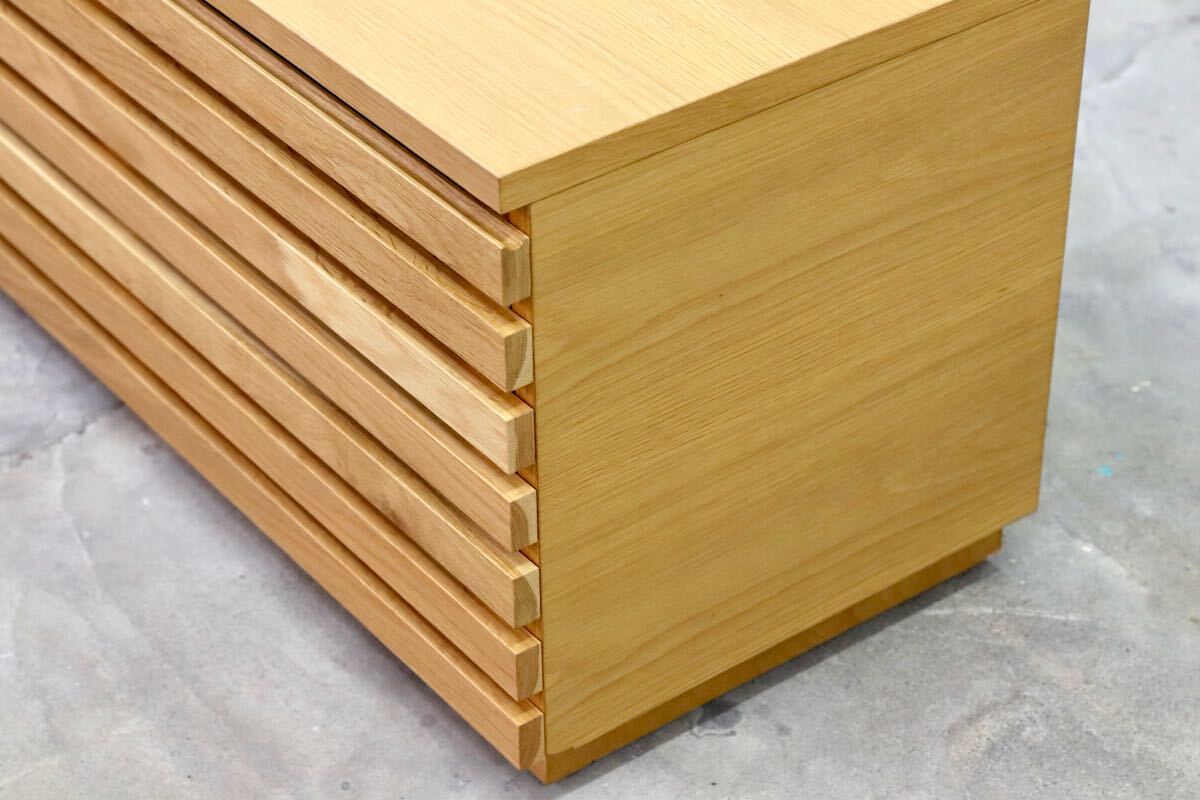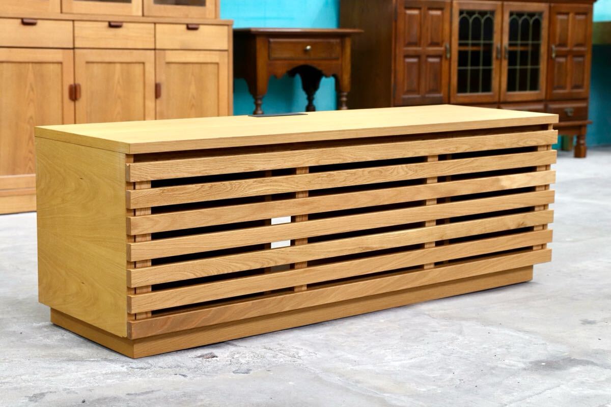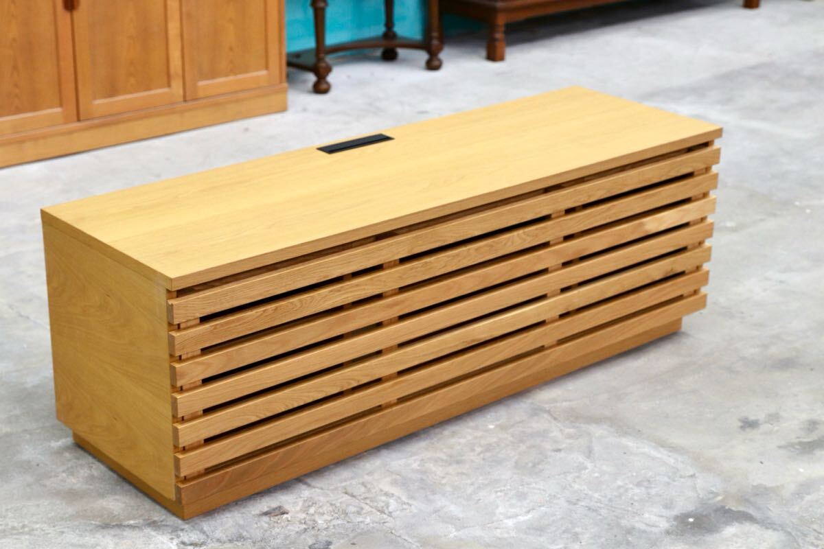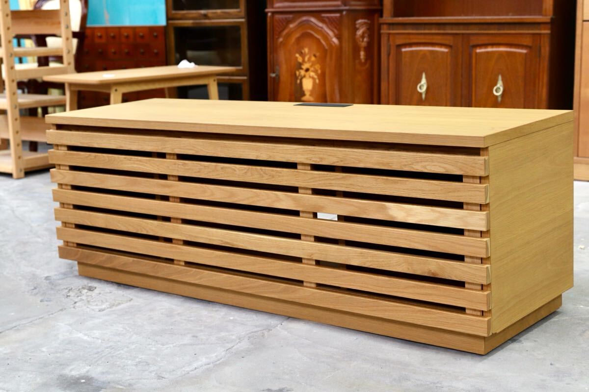 前面にオーク無垢材を使用したスラットデザインが美しいテレビボード。北欧スタイルな家具とも良い相性です。