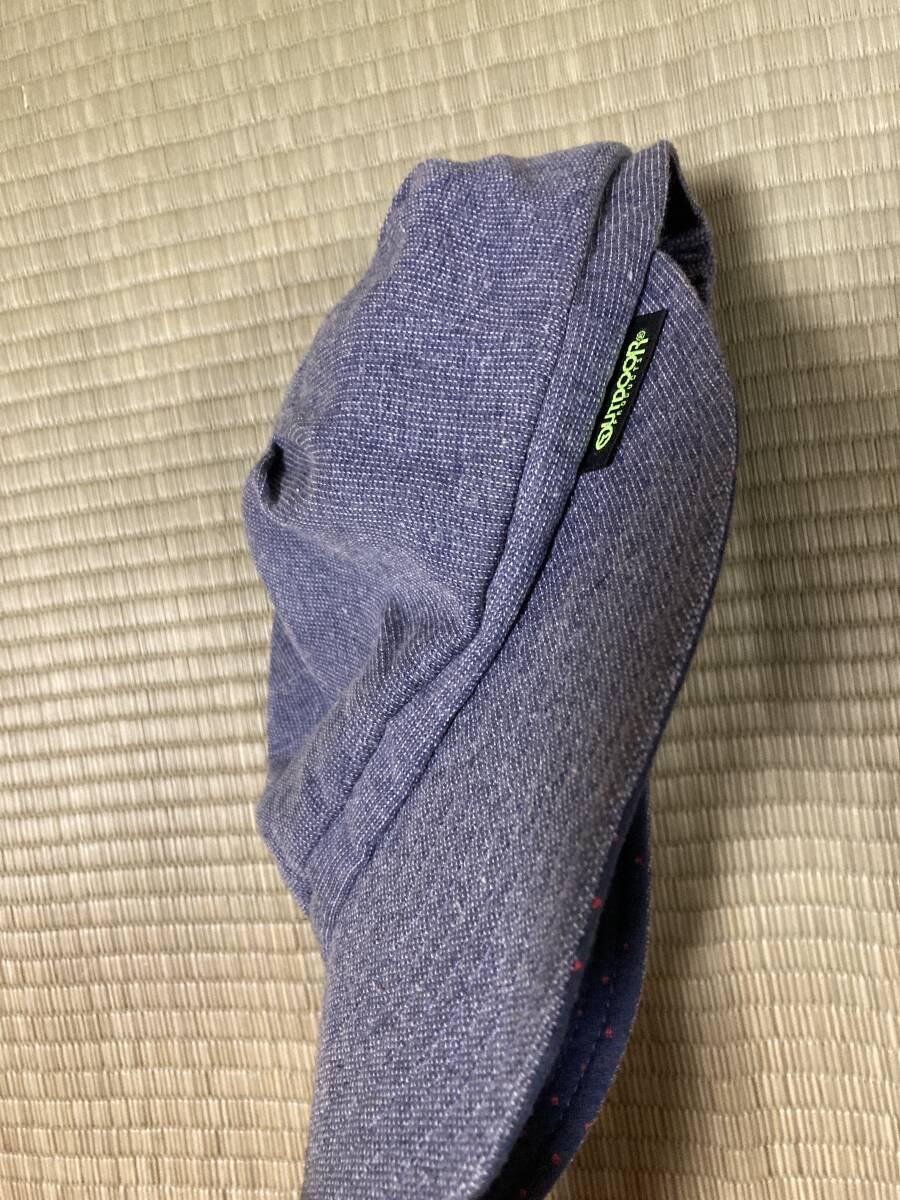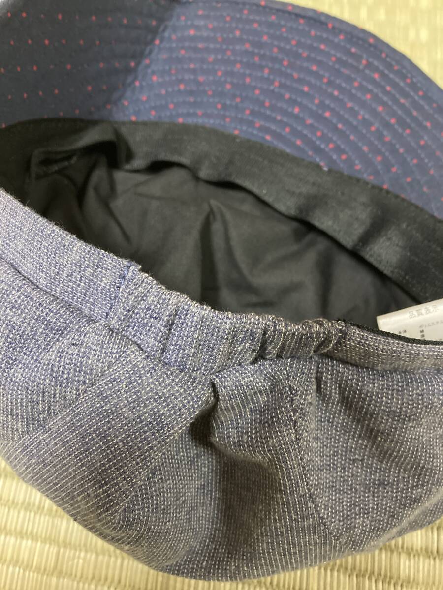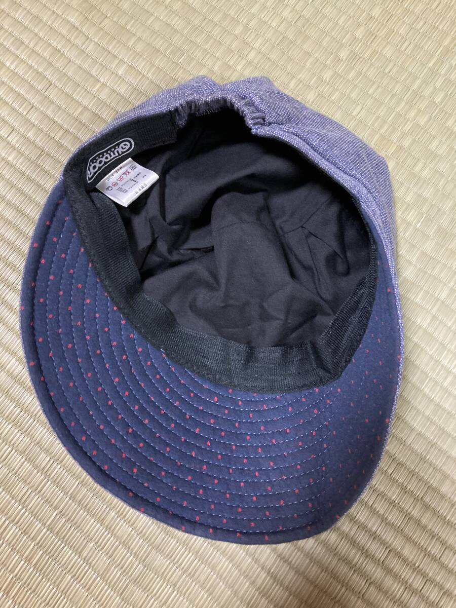 ツバの裏地は紺色にピンクの水玉柄になります。