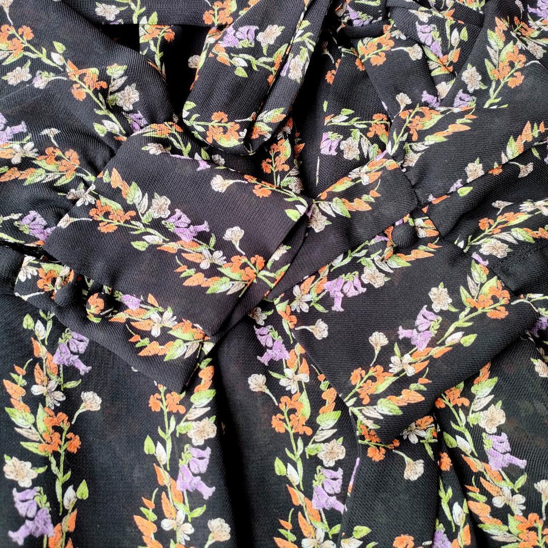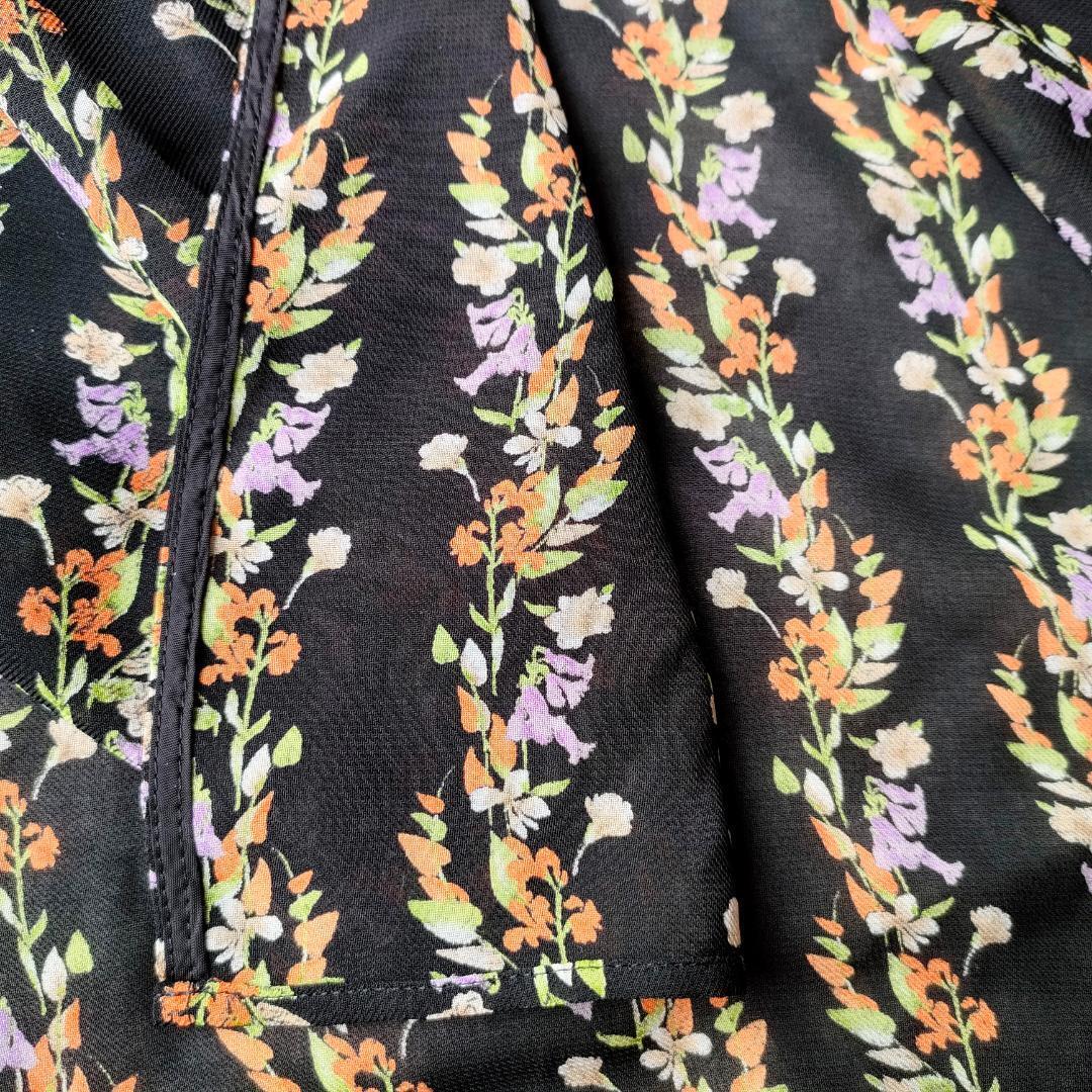 黒地にストライプのように縦に植物柄がプリントされたデザインです。