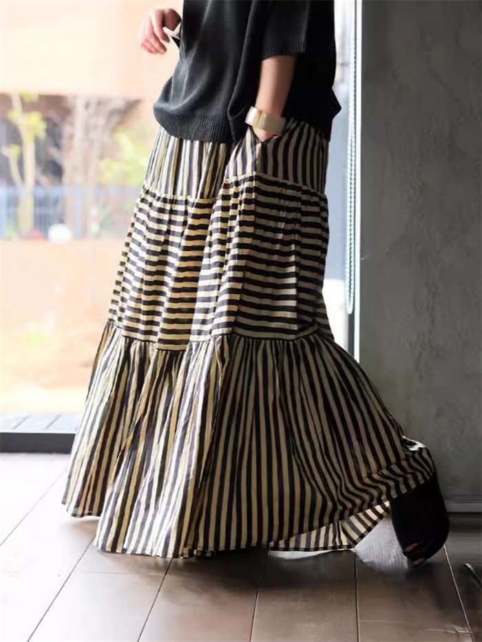 綺麗な黒ストライプがおしゃれなマキシ丈スカート★新品★大きいサイズ★ティアードがおしゃれな裏地つきスカート