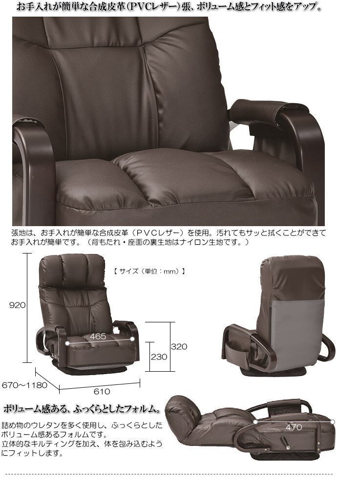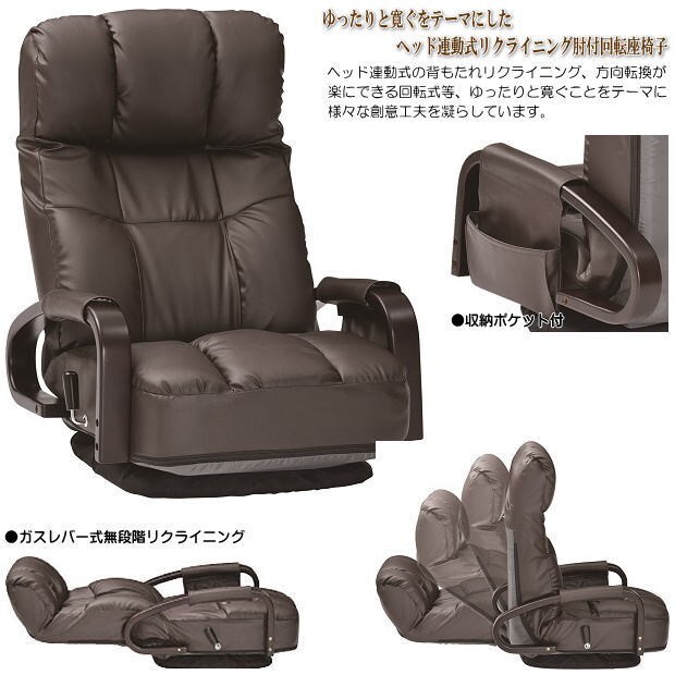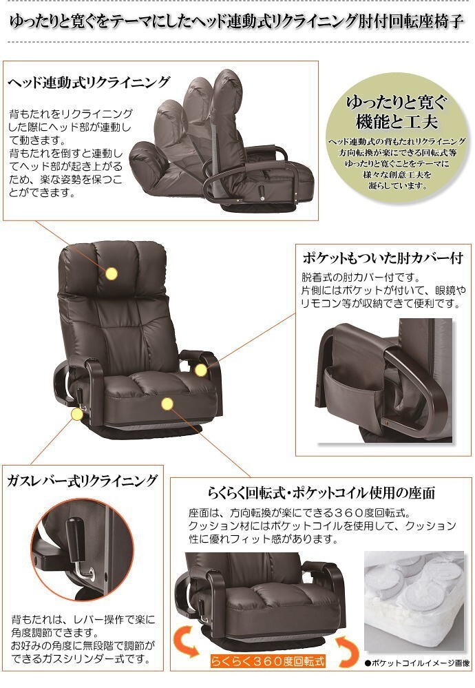 | 【商品特徴】 | ・背もたれをリクライニングした際にヘッド部が連動して動きます。背もたれを倒すと連動してヘッド部が起き上がるため、楽な姿勢を保つことができます。 ・背もたれは、レバー操作で楽に角度調節できます。お好みの角度に無段階で調節ができるガスシリンダー式です。 ・座面は、方向転換が楽にできる360度回転式。クッション材にはポケットコイルを使用して、クッション性に優れフィット感があります。 ・脱着式の肘カバー付です。片側にはポケットが付いて、眼鏡やリモコン等が収納できて便利です。 ・張地は、お手入れが簡単な合成皮革(PVCレザー)を使用。汚れてもサッと拭くことができて、お手入れが簡単です。(背もたれ・座面の裏生地はナイロン生地です。) ・詰め物のウレタンを多く使用し、ふっくらとしたボリューム感あるフォルムです。立体的なキルティングを加え、体を包み込むようにフィットします。 ・お客様で、肘のお取り付けが必要です。 | |