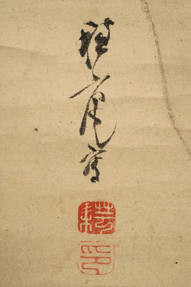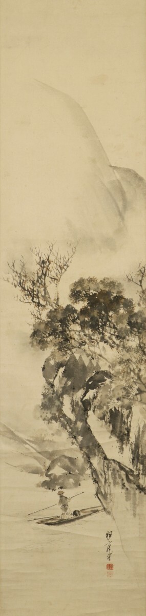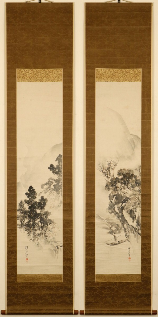 総丈サイズ…各 横 43 × 縦 196.5 cm 紙本水墨淡彩・箱入 状態…表具微少オレ 本紙少オレ 【印刷ではありません】 【真作】 平福穂庵 明治時代の日本画家。羽後国角館(秋田県)生。平福百穂の父。名は芸。通称は順蔵。別号に文池。はじめ父文浪に絵を習い、その後円山四条派の武村文海に学んだ。若くして京都に遊学し、師につかず風景写生や古画の模写に専念した。明治維新後は各種博覧会で受賞を重ね、アイヌの絵も多く描いた。代表作に「乞食図」「乳虎図」など。門下に寺崎広業がいる。明治23年(1890)歿、47歳。 |