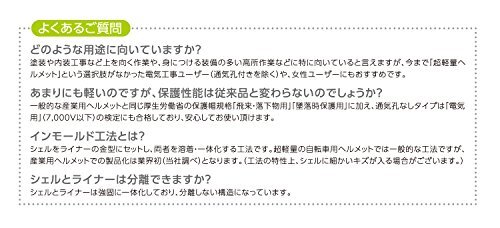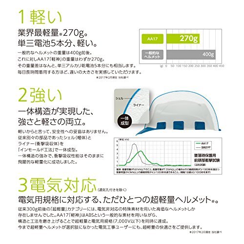 商品紹介圧倒的な軽さで、働く人の毎日を変えるヘルメット。働く人を守る安全保護具。とても大切なものですが、頭からつま先まで多くの装備は身につける人の負担になります。全ての働く人の負担を軽くするため、AA17「軽神」は圧倒的な軽さと強さを兼ね備えた新世代のヘルメットとして誕生しました。一般的なヘルメットの重量は400g前後。これに対しAA17「軽神」はわずか270g。その重量差はなんと、単三アルカリ乾電池5本分にも相当します。毎日長時間着用する方ほど、違いの大きさを実感していただけます。軽いからと言って、安全性への妥協はありません。従来別々の部品であったシェル(帽体)とライナー(衝撃吸収体)を「インモールド工法」で一体成型。一体構造の強みで、衝撃吸収性能はそのままに飛躍的な軽量化に成功しました。ご注意(免責)>必ずお読みください保護帽を使用する前に必ず「保護帽の取扱説明」を必ずお読み下さい。安全のため異常が認められなくても使用開始から3年以内の交換をおすすめしています。 ■ご注文からお届けまで ※トラブル防止のため入札、落札前に必ずご一読をお願い致します。 落札後のお客様都合でのキャンセルはお受けできませんので、予めご了承ください。 1.ご注文 : ご注文は24時間受け付けております。 2.注文確認 : ご注文時、オーダーフォーム等必要事項を入力お願い致します。 3.入金確認 : 前払い決済をご選択の場合、ご入金確認後、配送手配を致します。 4.出荷 : 配送準備が整い次第、出荷致します。配送業者、追跡番号等の詳細をご連絡致します。 5.到着 : 出荷後、1-3日で商品が到着します。 ※商品の到着までは、決済確認後、3-7営業日でお届けとなります。 ※離島、北海道、九州、沖縄は遅れる場合がございます。ご了承下さい。 ※代引の場合、手数料として660円頂きます。 商品管理、在庫管理は行っておりますが、商品の不具合等でお届け出来ない場合は、 銀行口座へ振込返金となりますので、予めご了承いただきますようお願い申し上げます。 手続き削減の為、こちらからは発送完了までご連絡を行なっておりません。 原則、電話対応はしておりませんので、ご質問等はお問い合わせ、またはメールにてお願い致します。 土日祝祭日はご質問や落札されても商品発送等の、対応ができない日もございます。 予めご了承ください。 | ||||