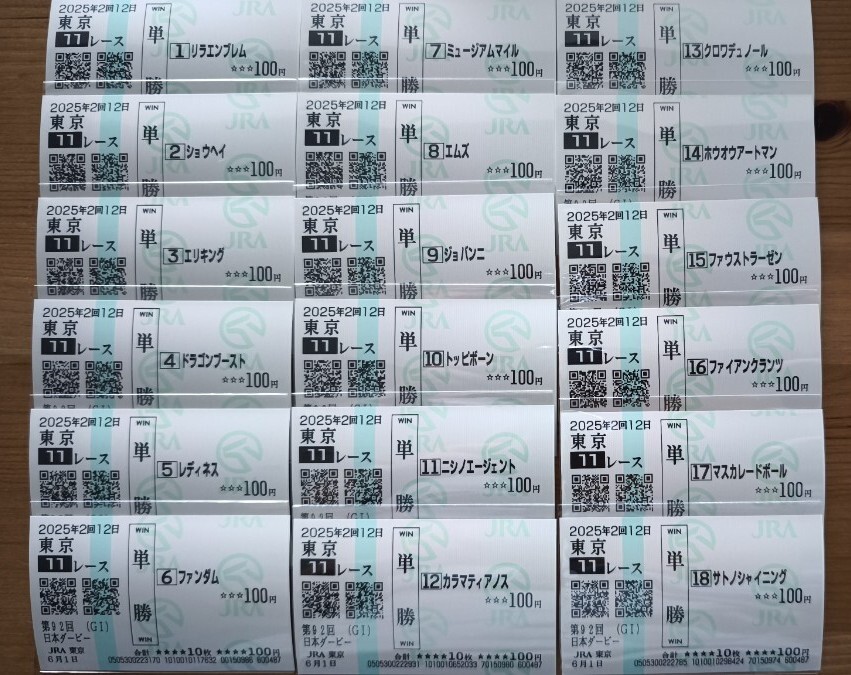2025.6.1 日本ダービー 出走全頭現地単勝馬券18枚です。