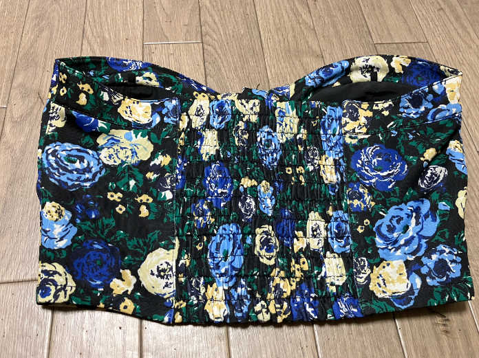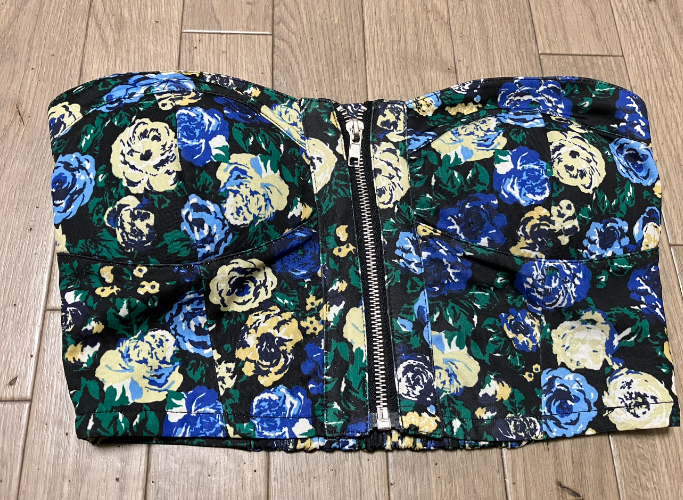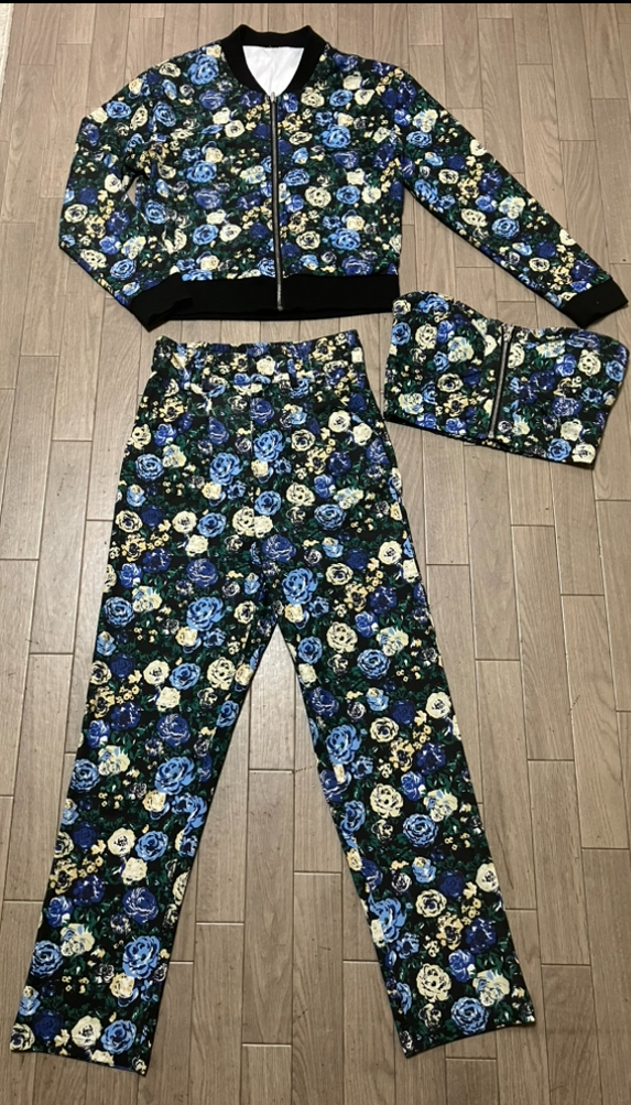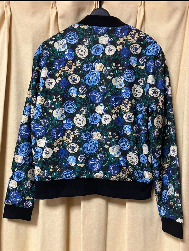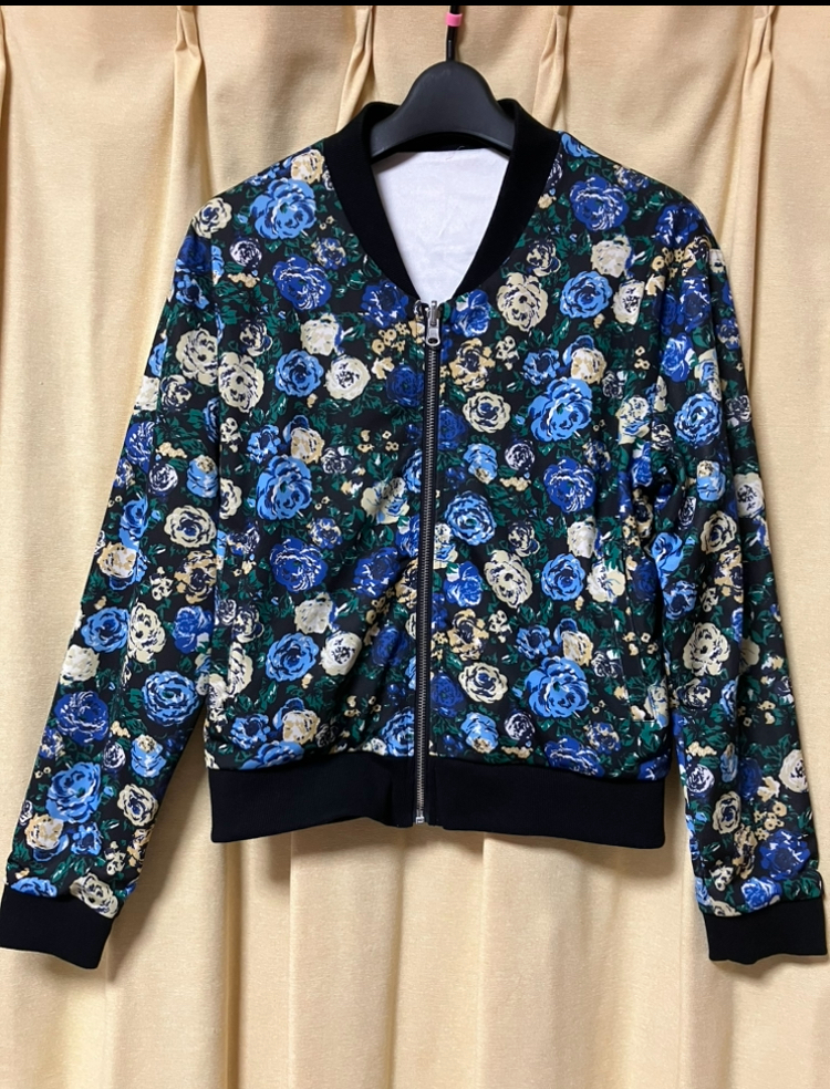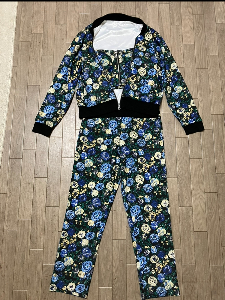 リバーシブルで着られる黒×ブルーの花柄のMA-1とビスチェ、パンツのセットアップの3点セットです。