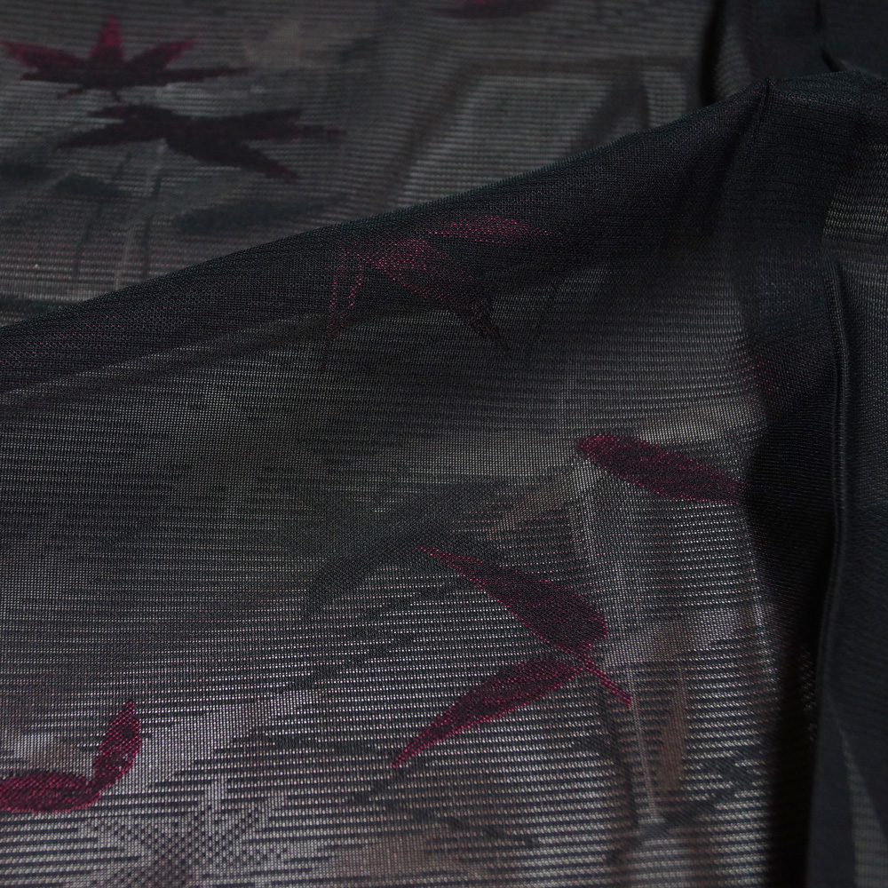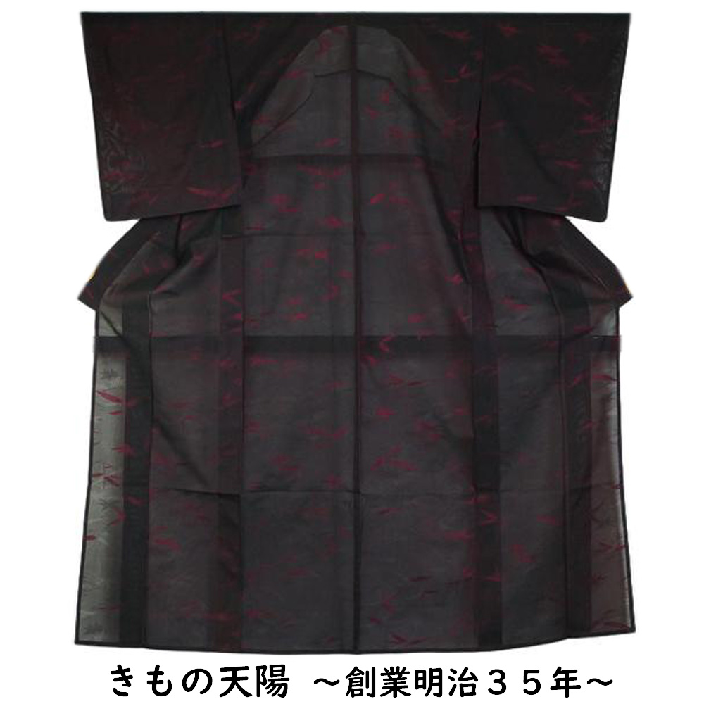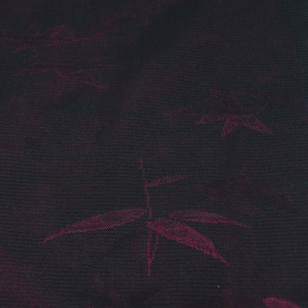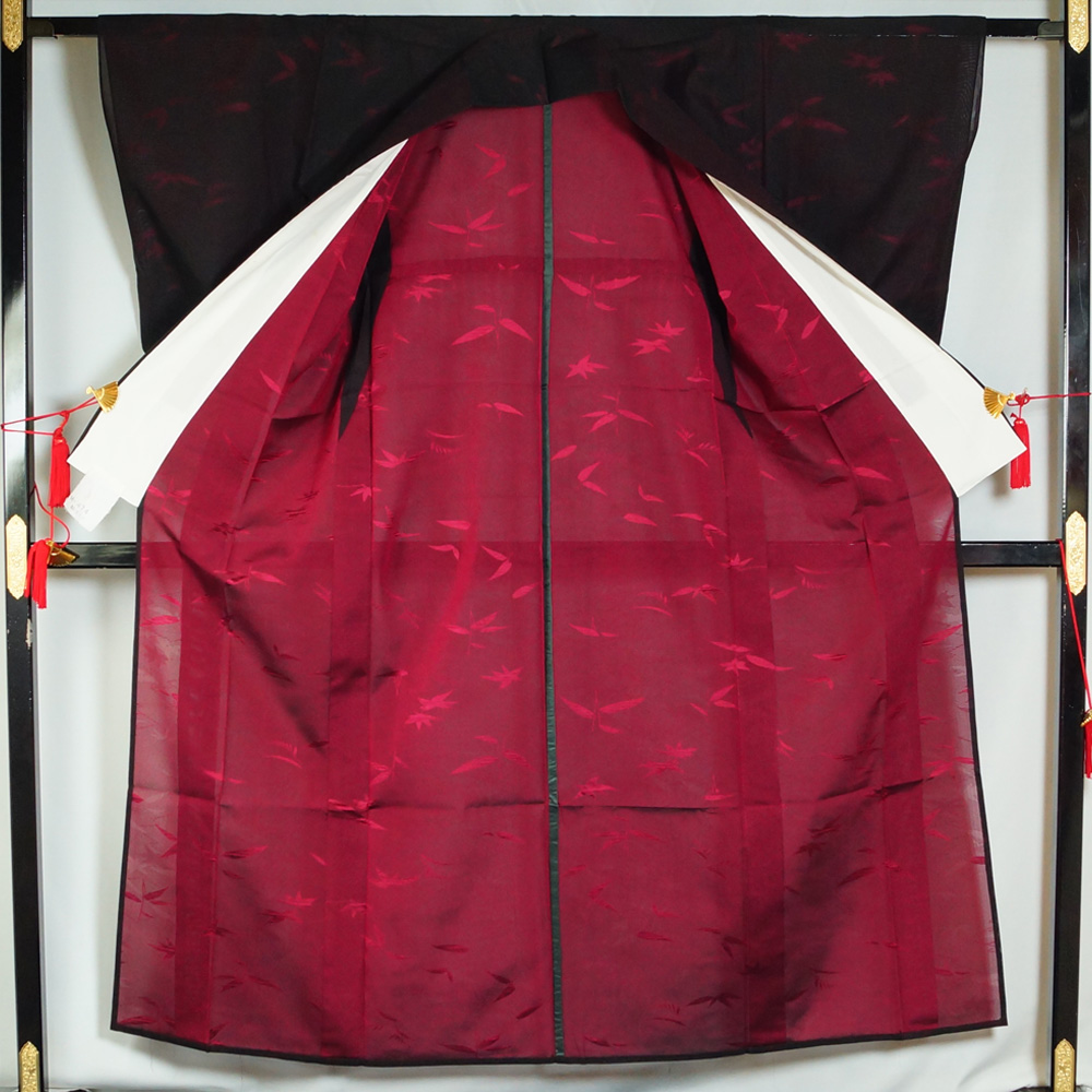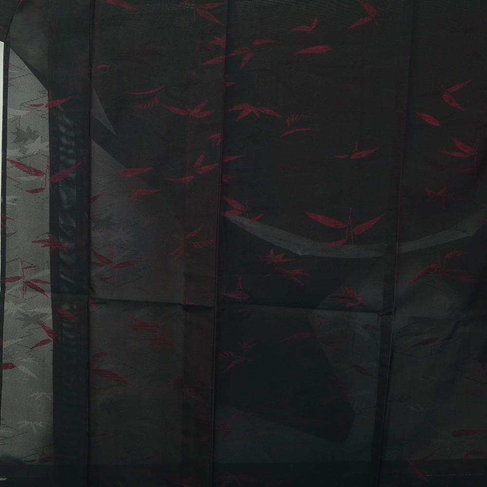 | 商品 説明 | 黒色系の紗地に枝葉模様が地織された夏物の小紋です。裏地は落ち着いた中紅色系となっており、表から薄っすらと透けて見えます。 |