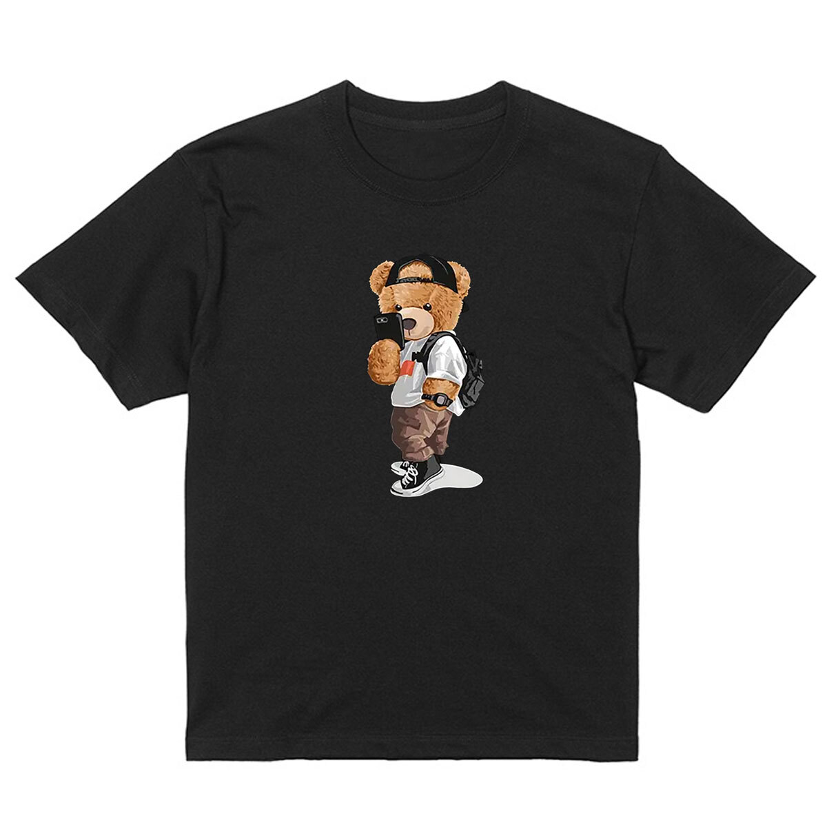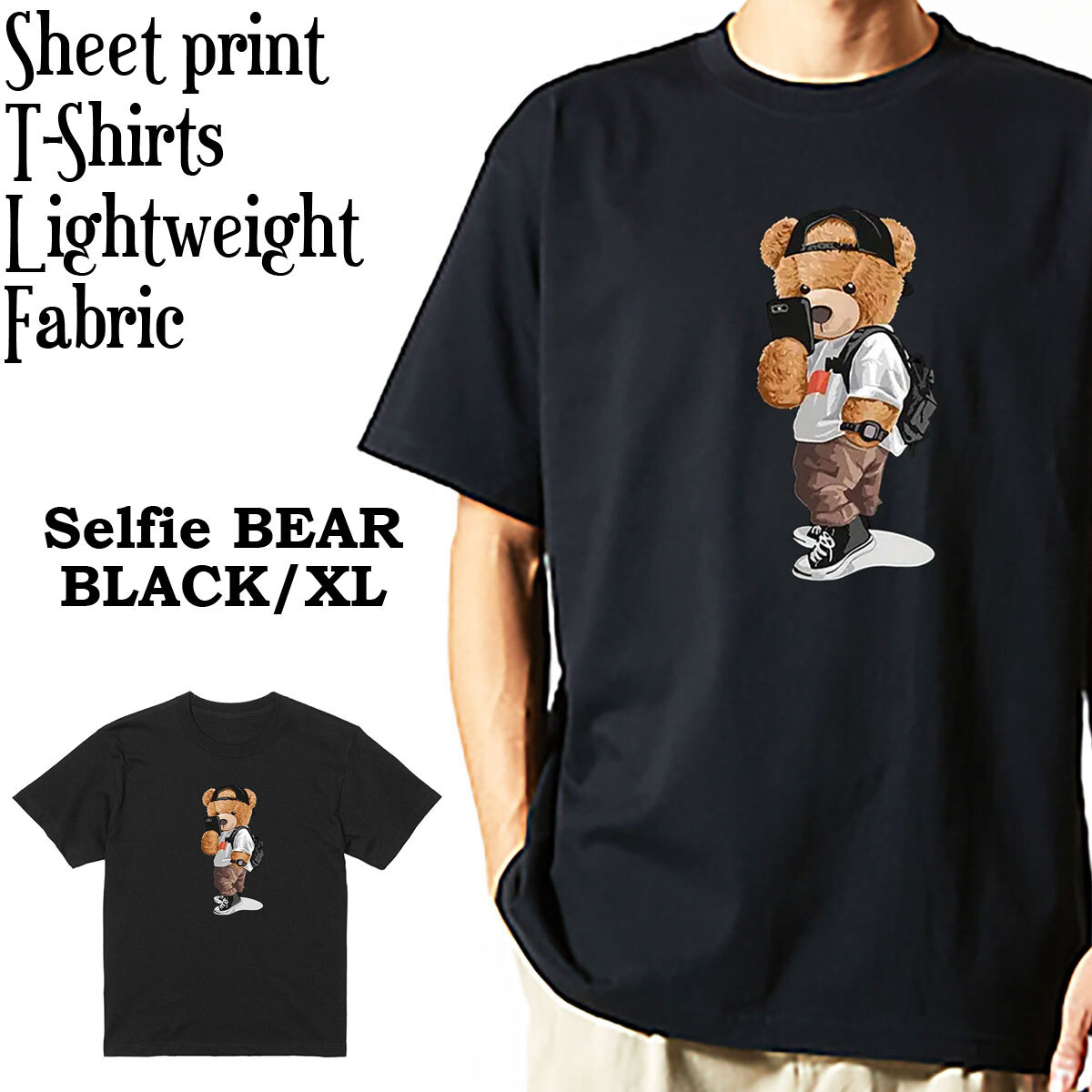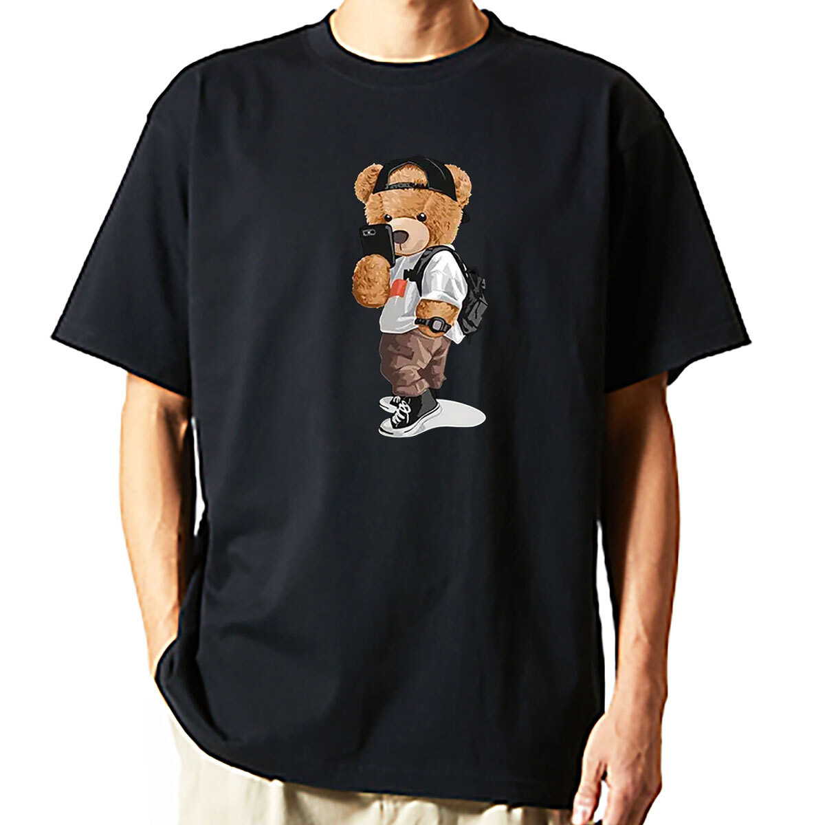 クマ プリント 半袖 Tシャツ シートプリント テディベア スマホ ストレッチ生地 ユニセックス 男女兼用 Y2K 軽量 ブラック XL