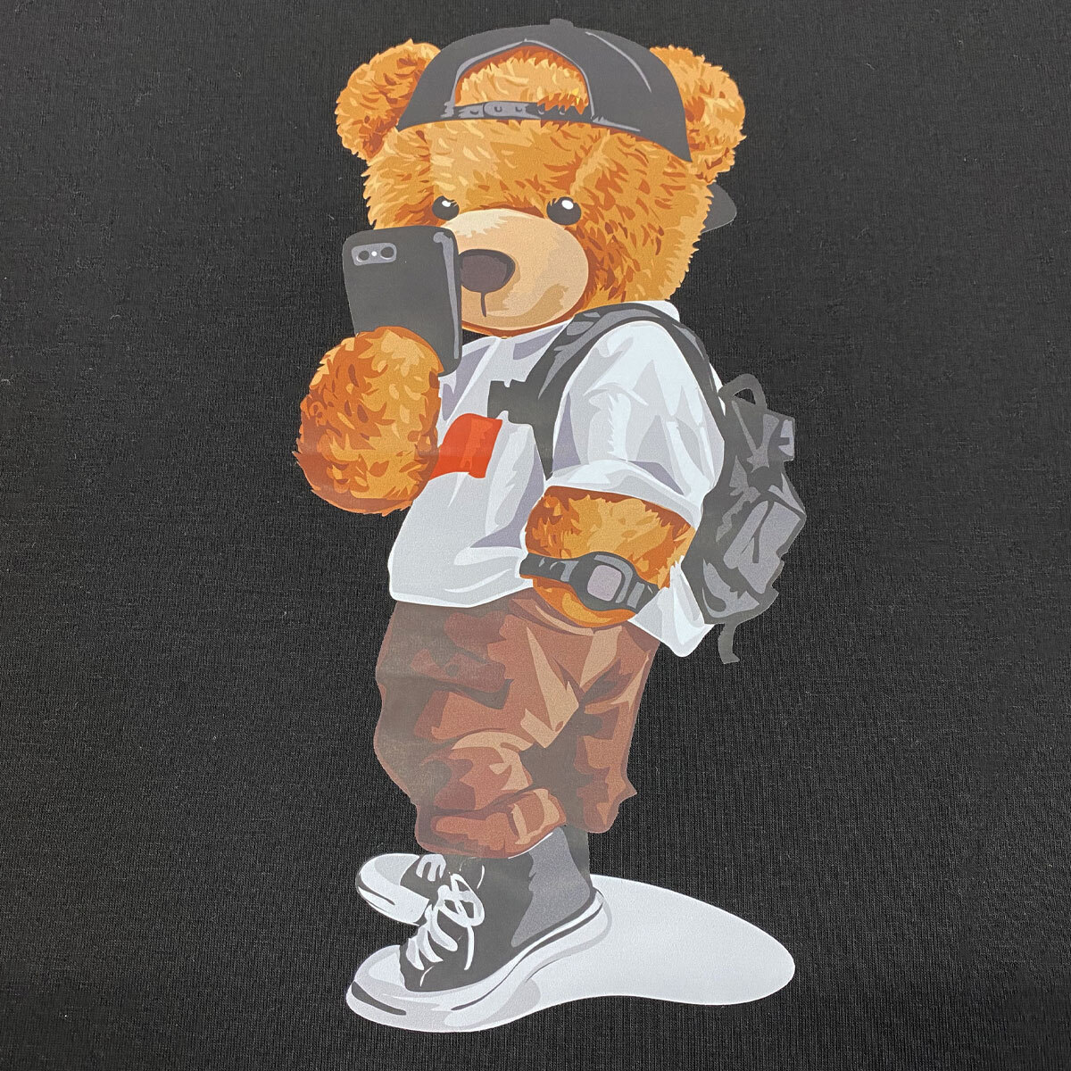 スマホを持ったテディベアがプリントされた