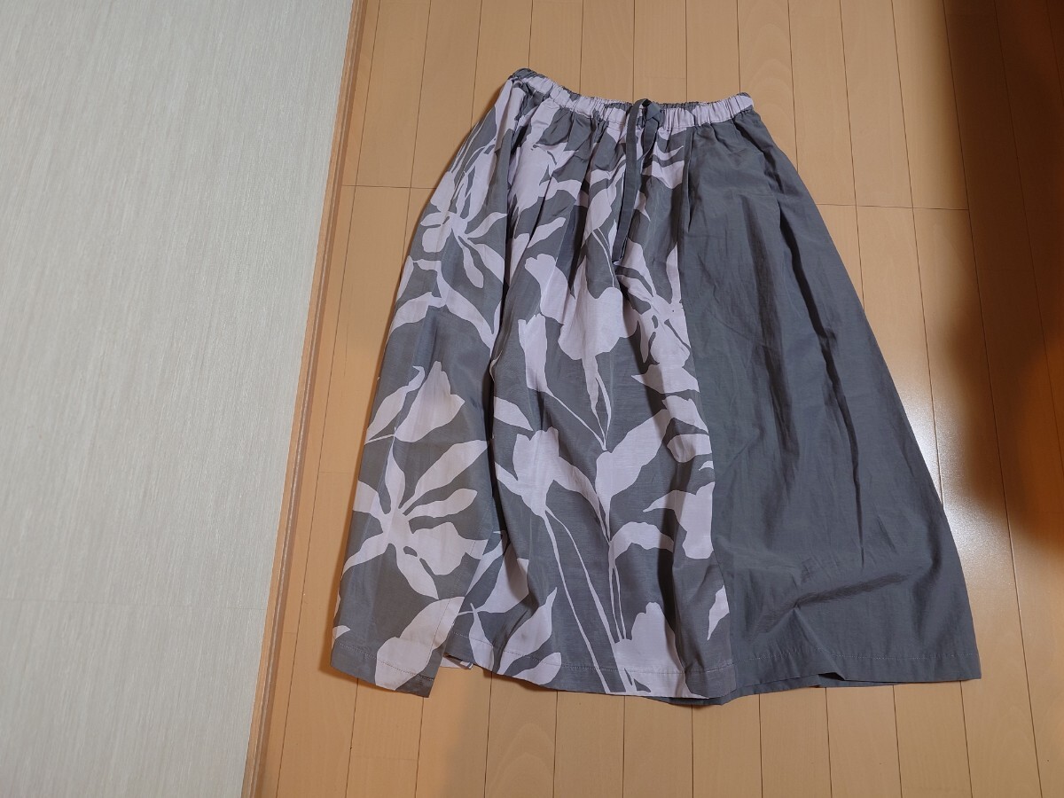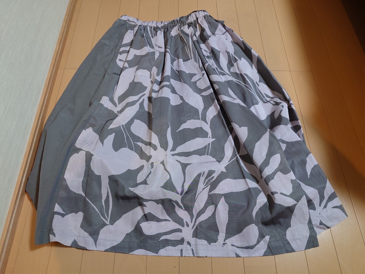 グレーを基調とした生地にピンク花柄が施されたフレアスカート。シンプルながらも華やかさを演出するデザインです。