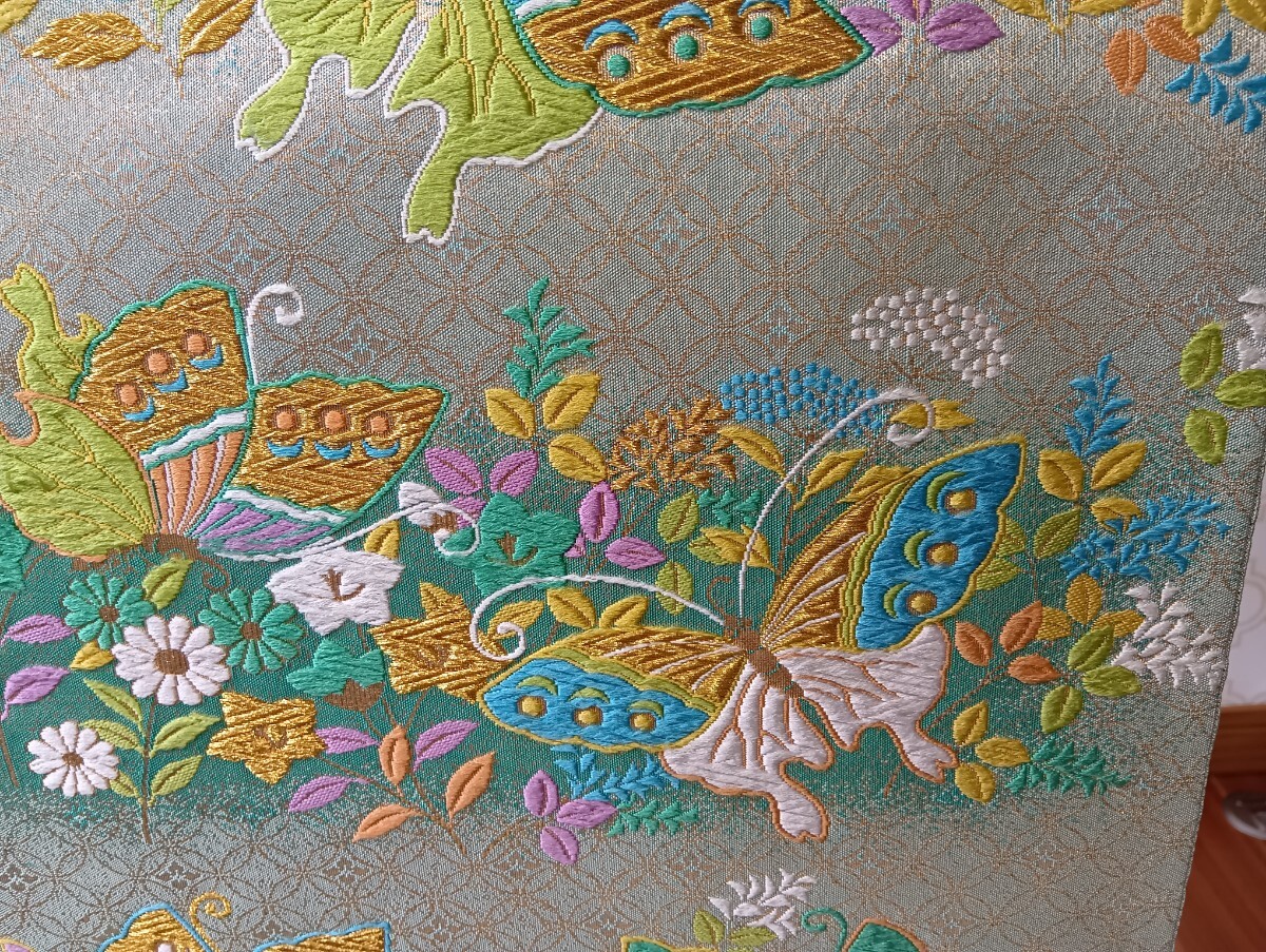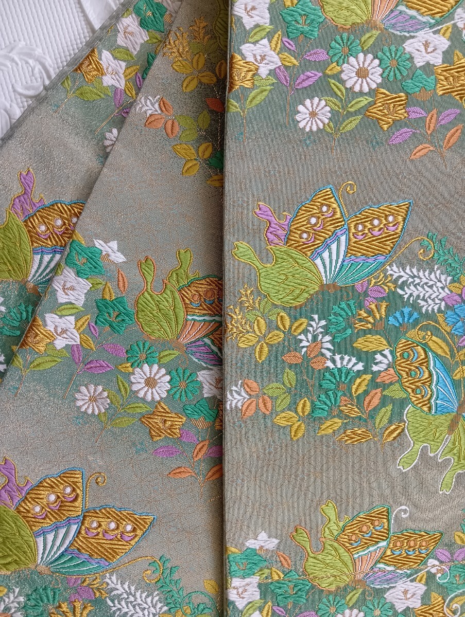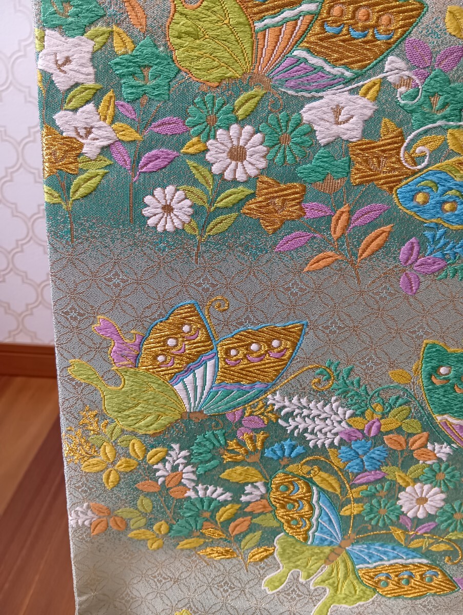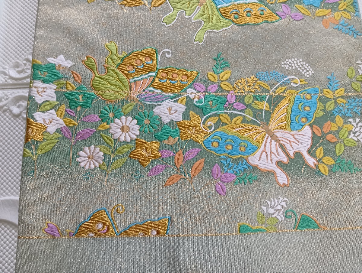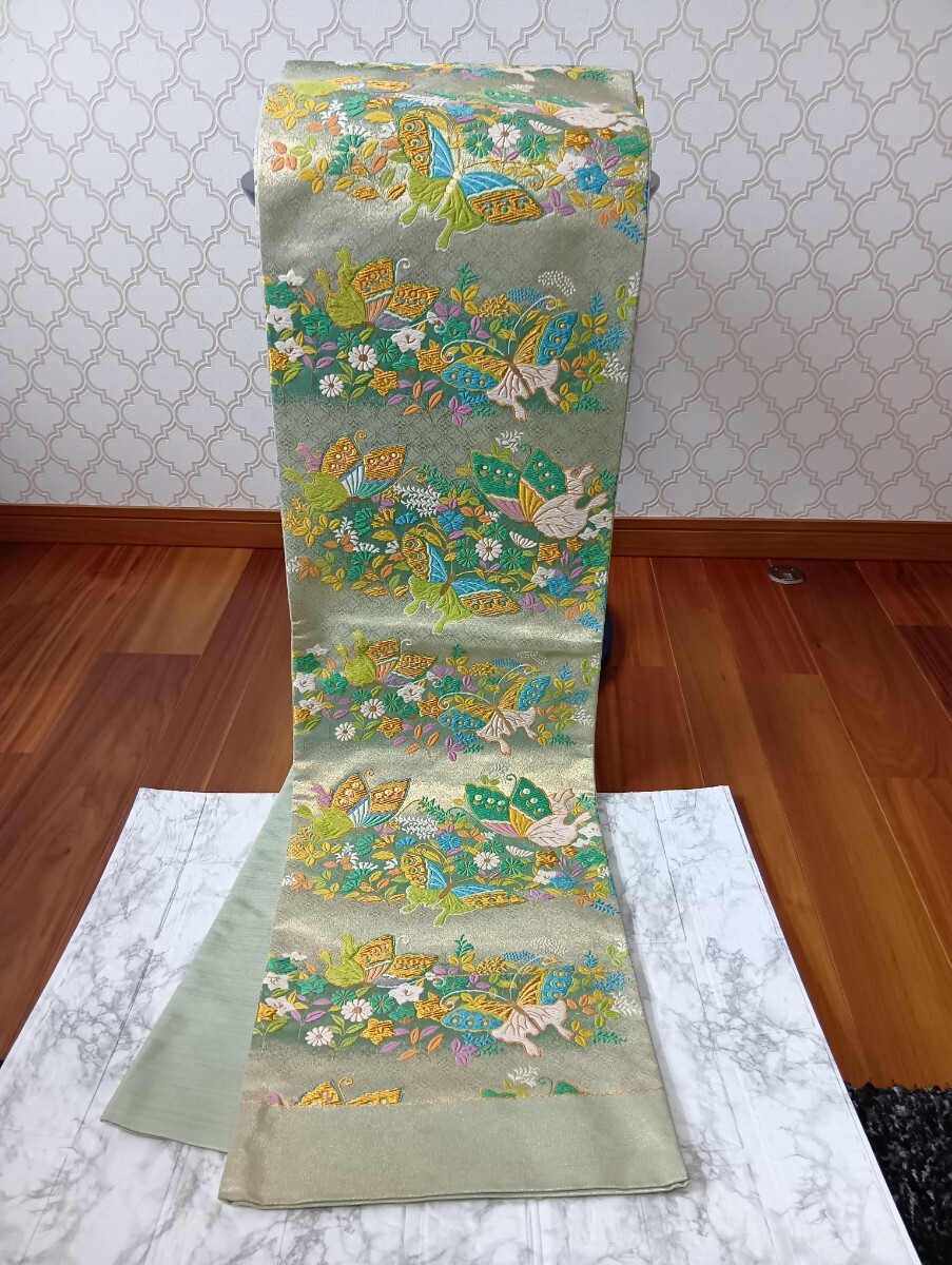 鮮やかなグリーン地に豪華金刺の華やかさが引き立つ袋帯です。