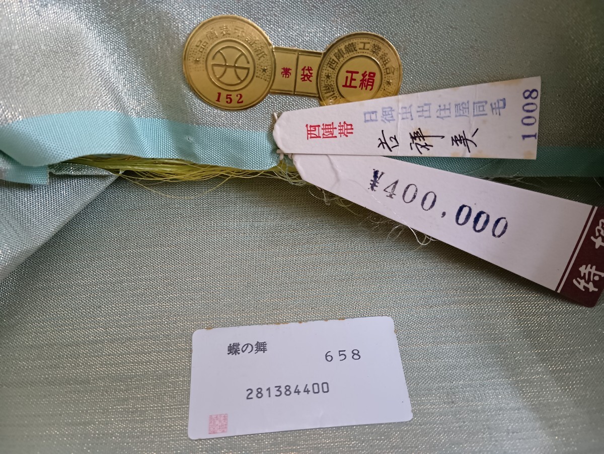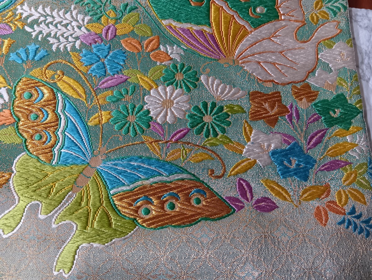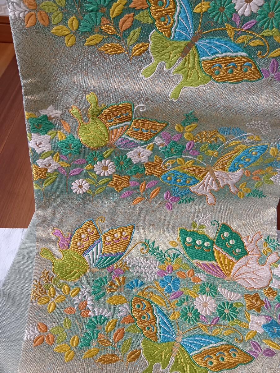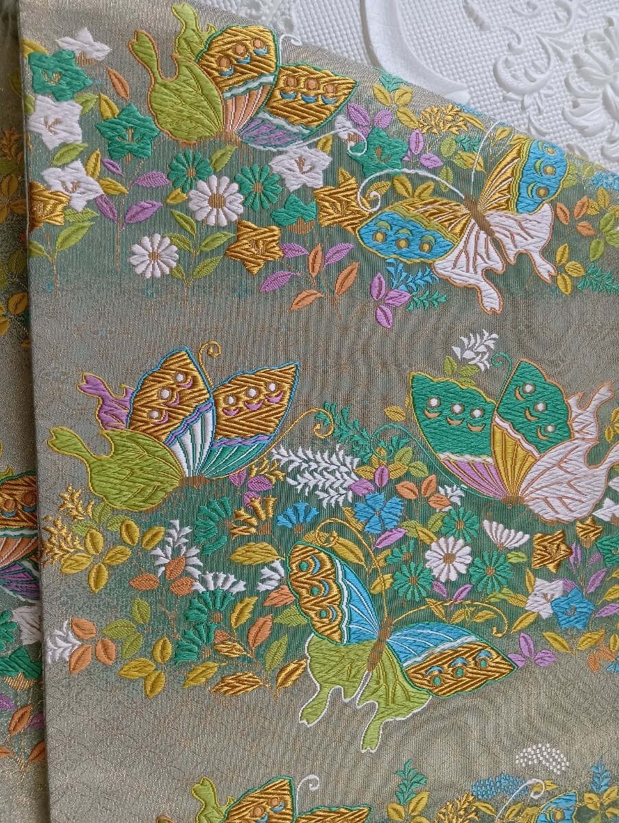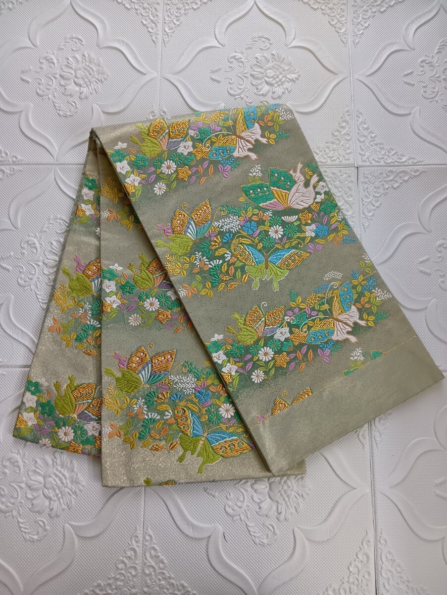 鮮やかなグリーン地に豪華金刺の華やかさが引き立つ袋帯です。