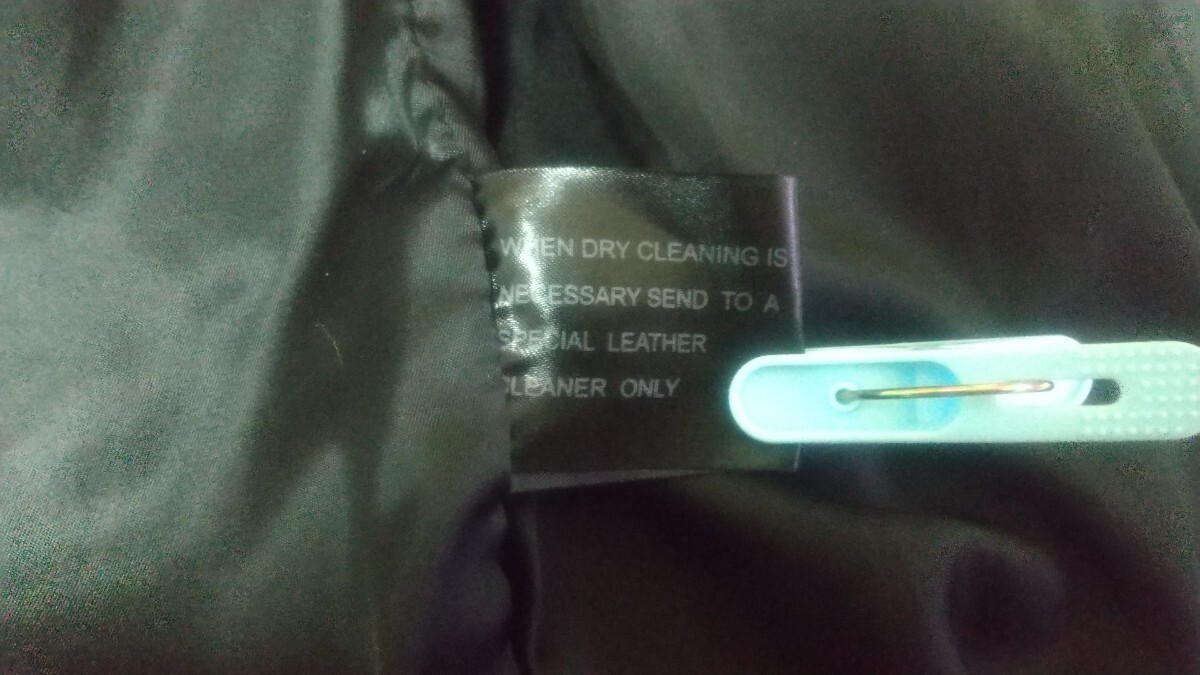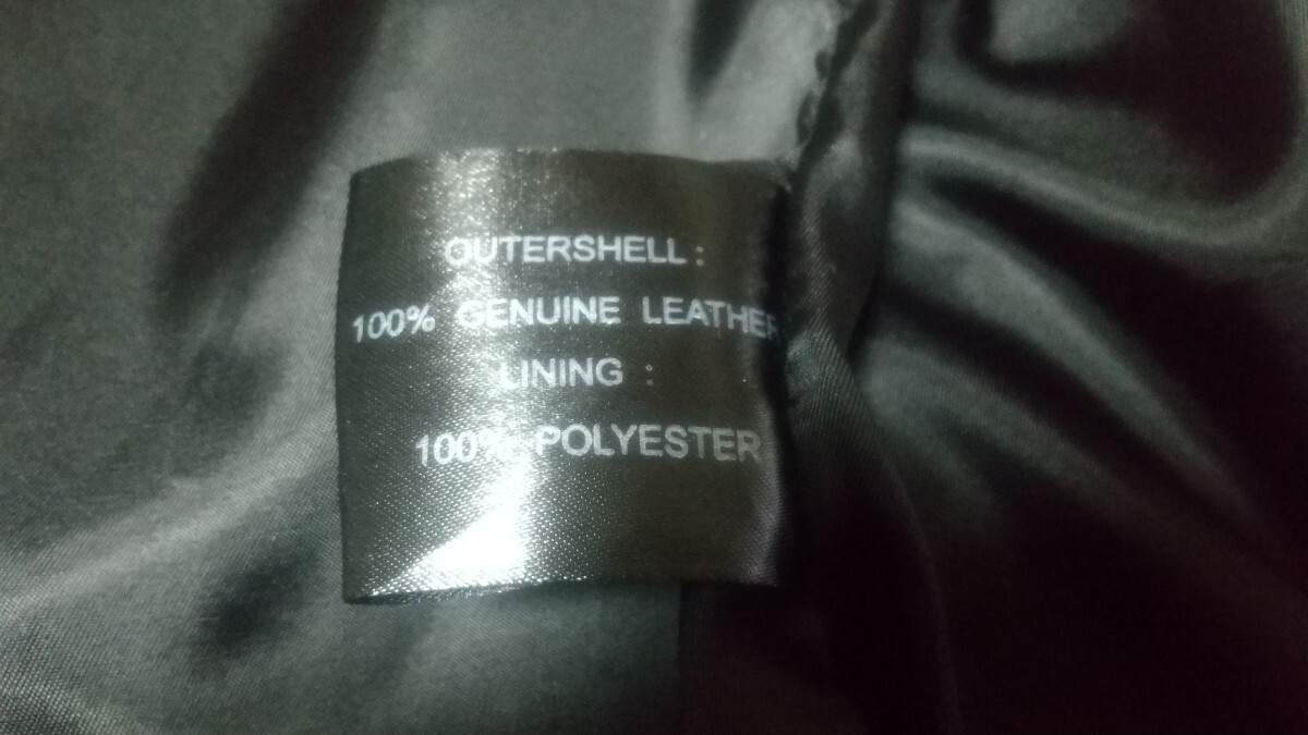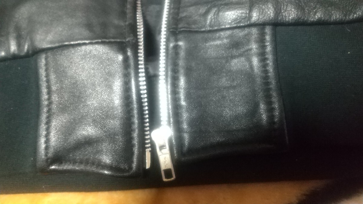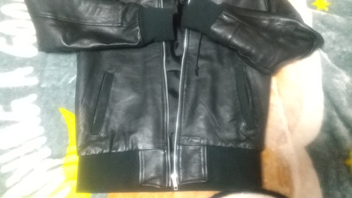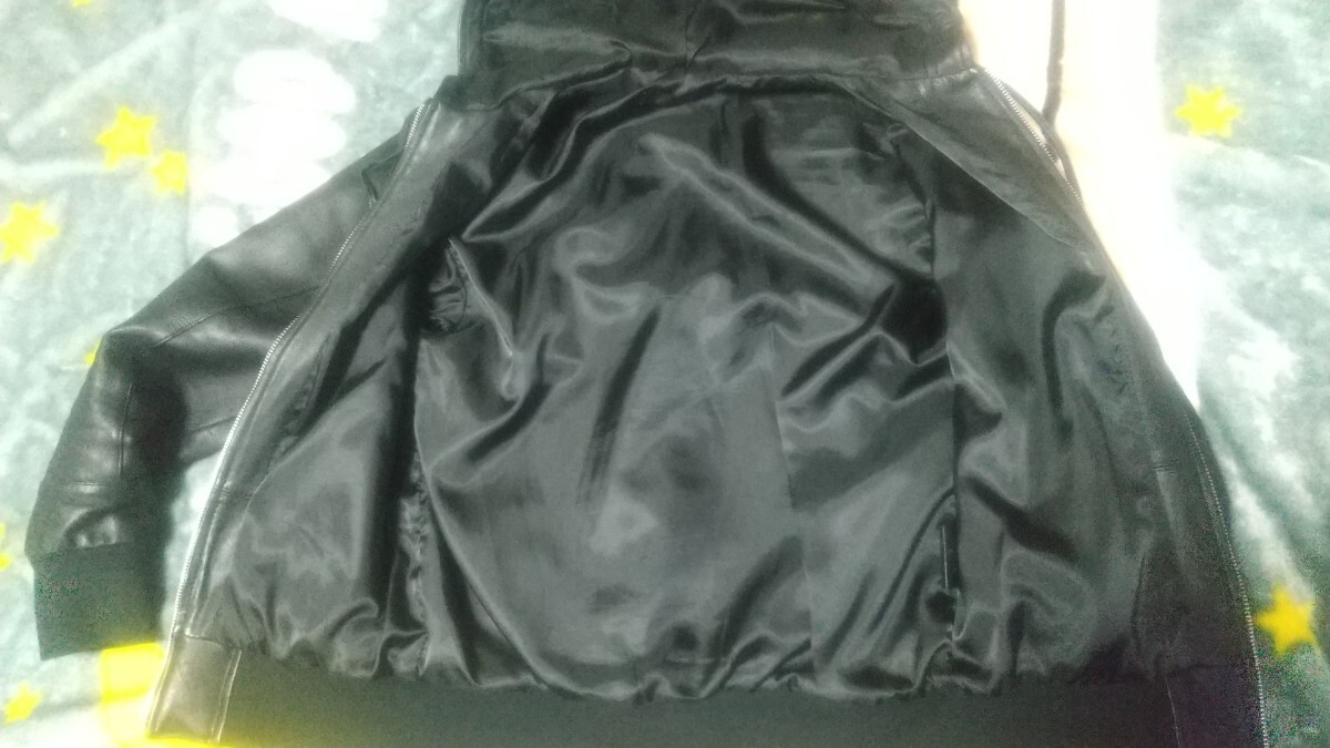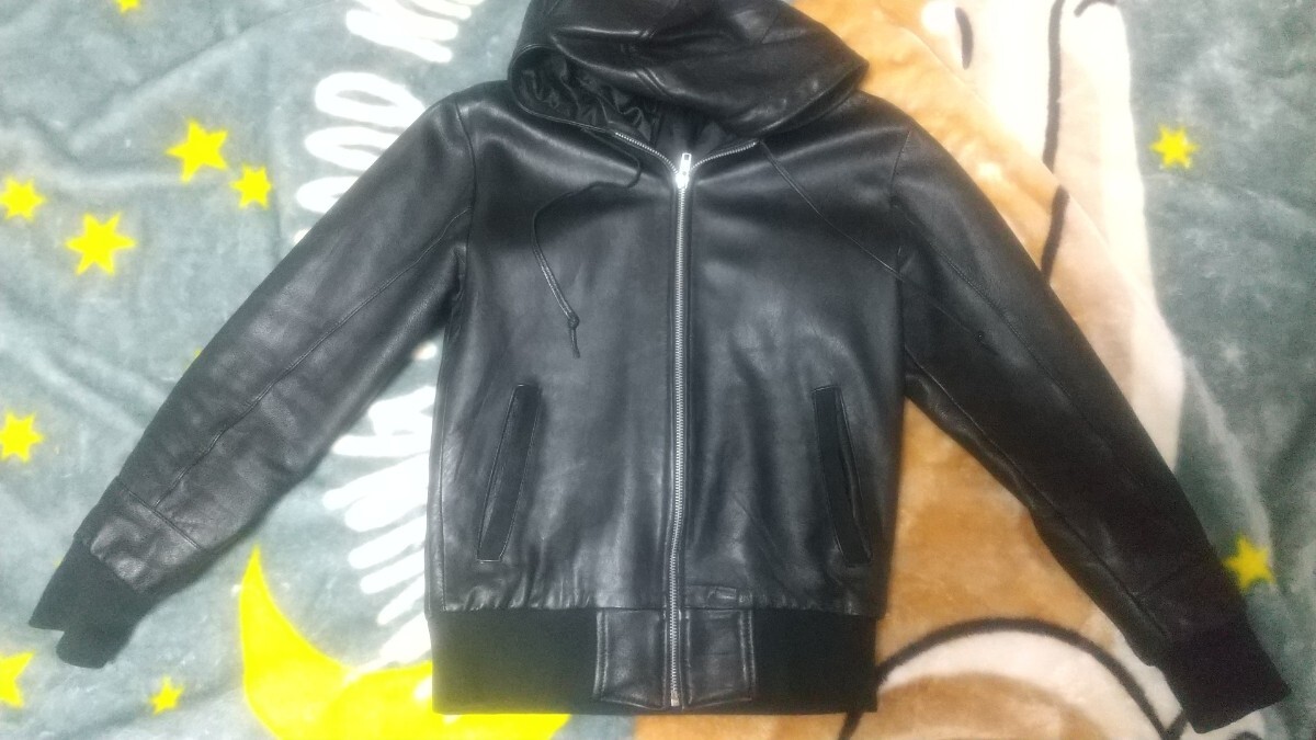 便利なフード付き黒革ジャンです。100%Genuine leather とタグに書かれております。