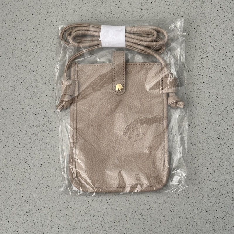 合成皮革製のベージュのスマホショルダでサイズは縦17cm、横13cm