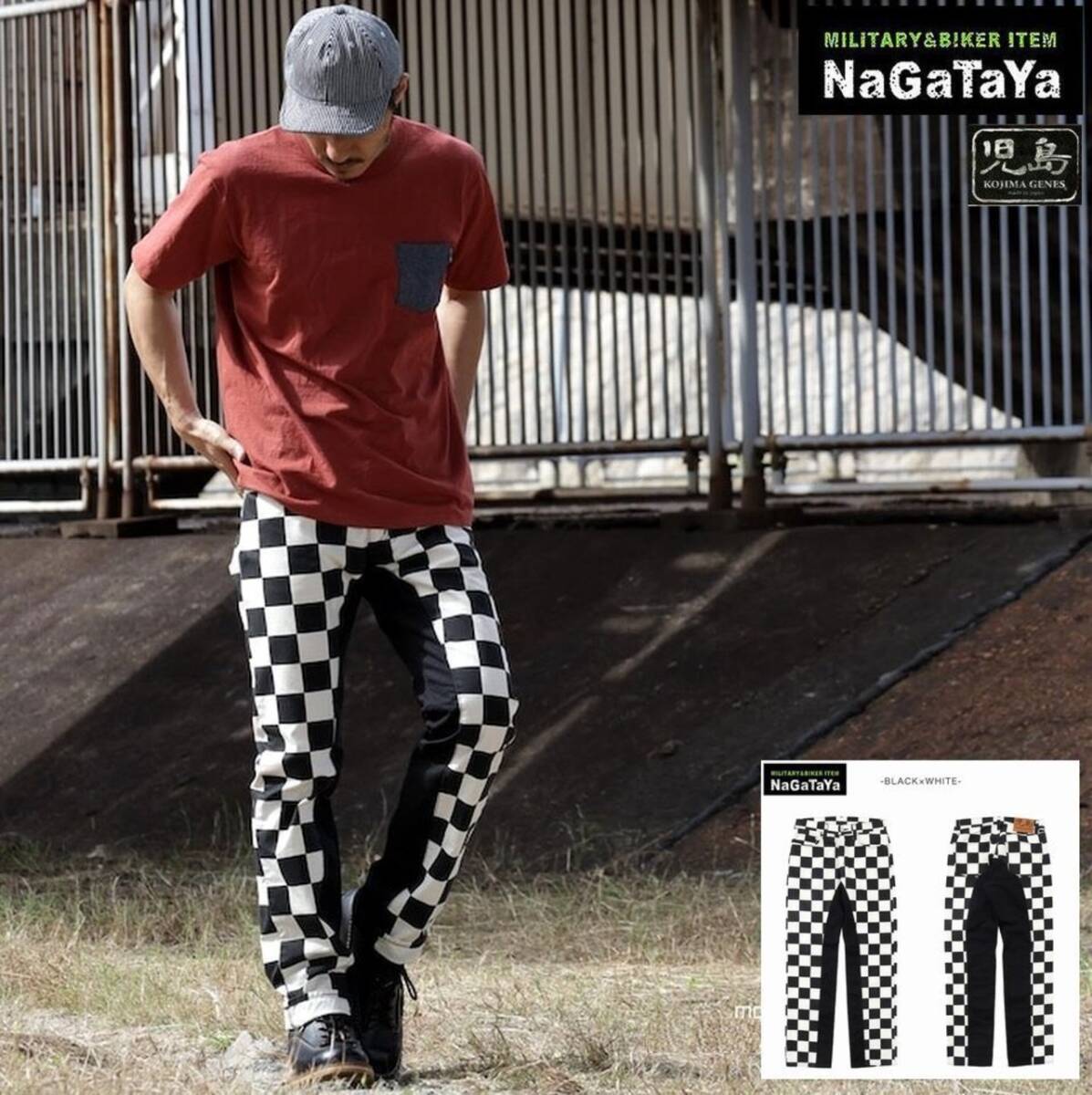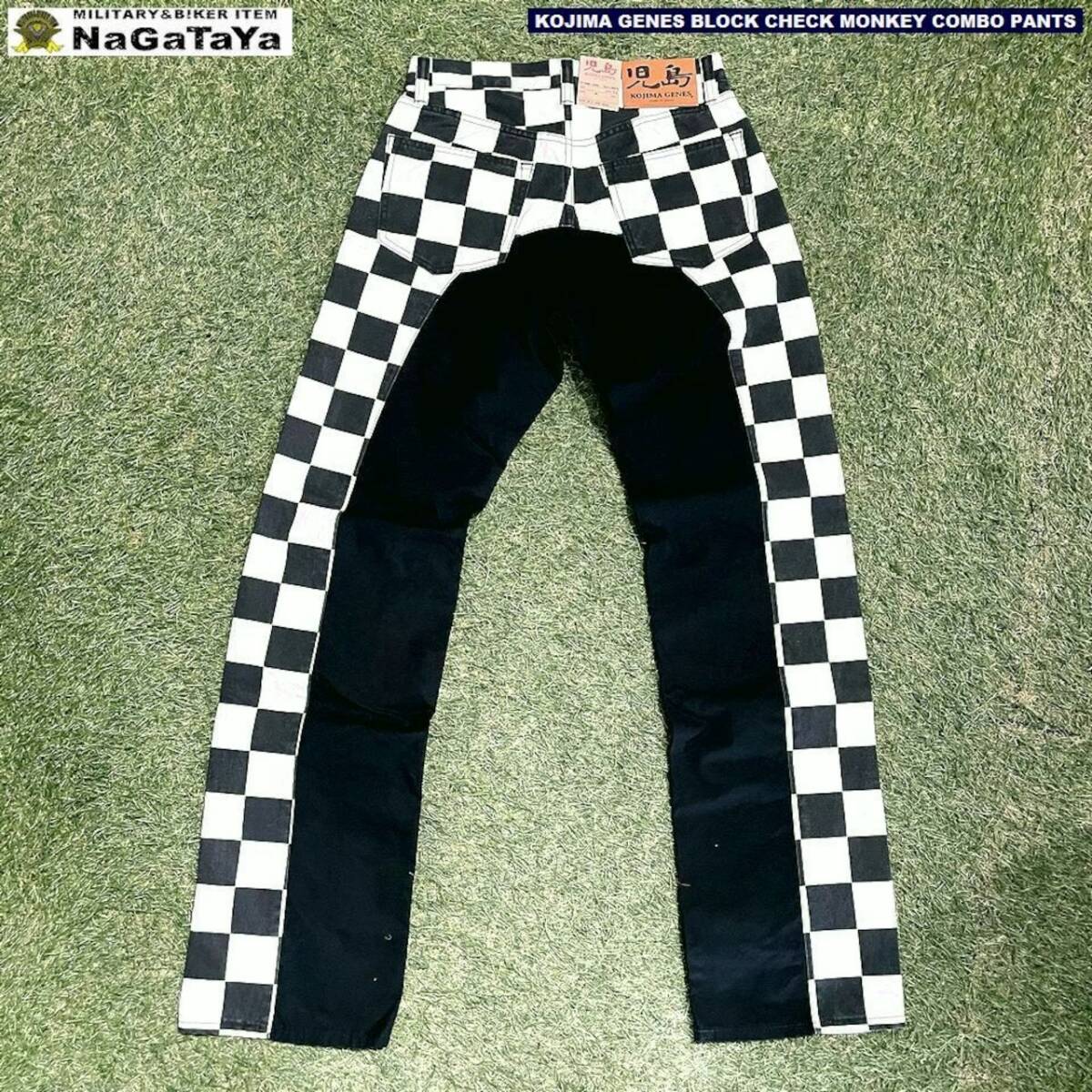 ■チェッカーフラッグ柄の生地をベースに股下部分をブラックの生地で切り替えたド派手な印象の5ポケットパンツ。