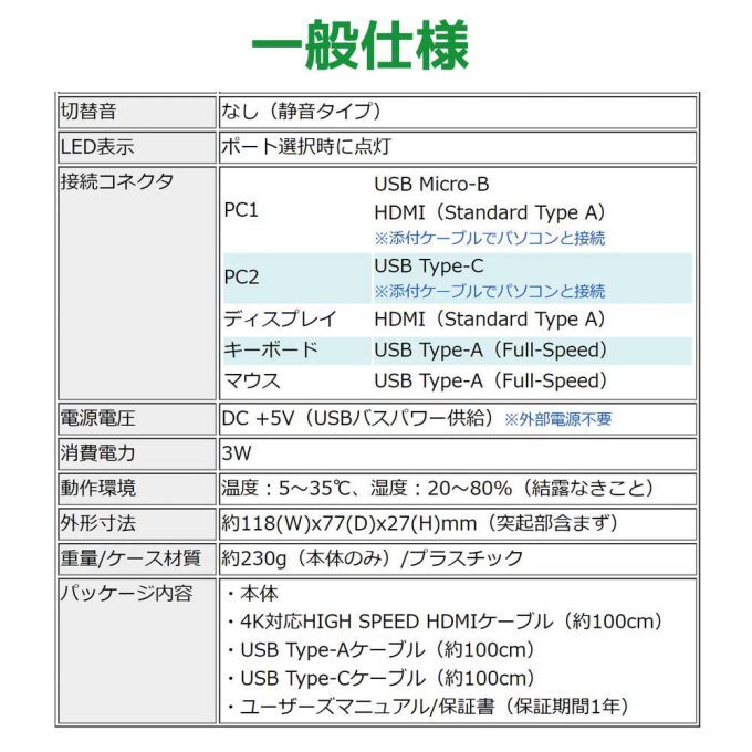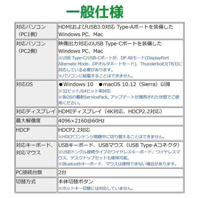 ●【対応パソコン】PC1側:HDMIおよびUSB3.0対応 Type-Aポートを装備したWindows PC、Mac PC2側:映像出力対応のUSB Type-Cポートを装備したWindows PC、Mac