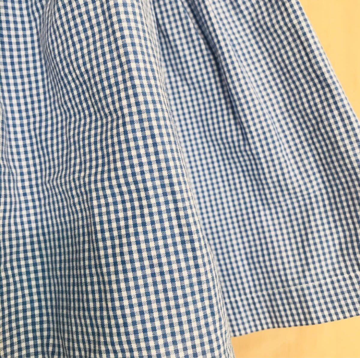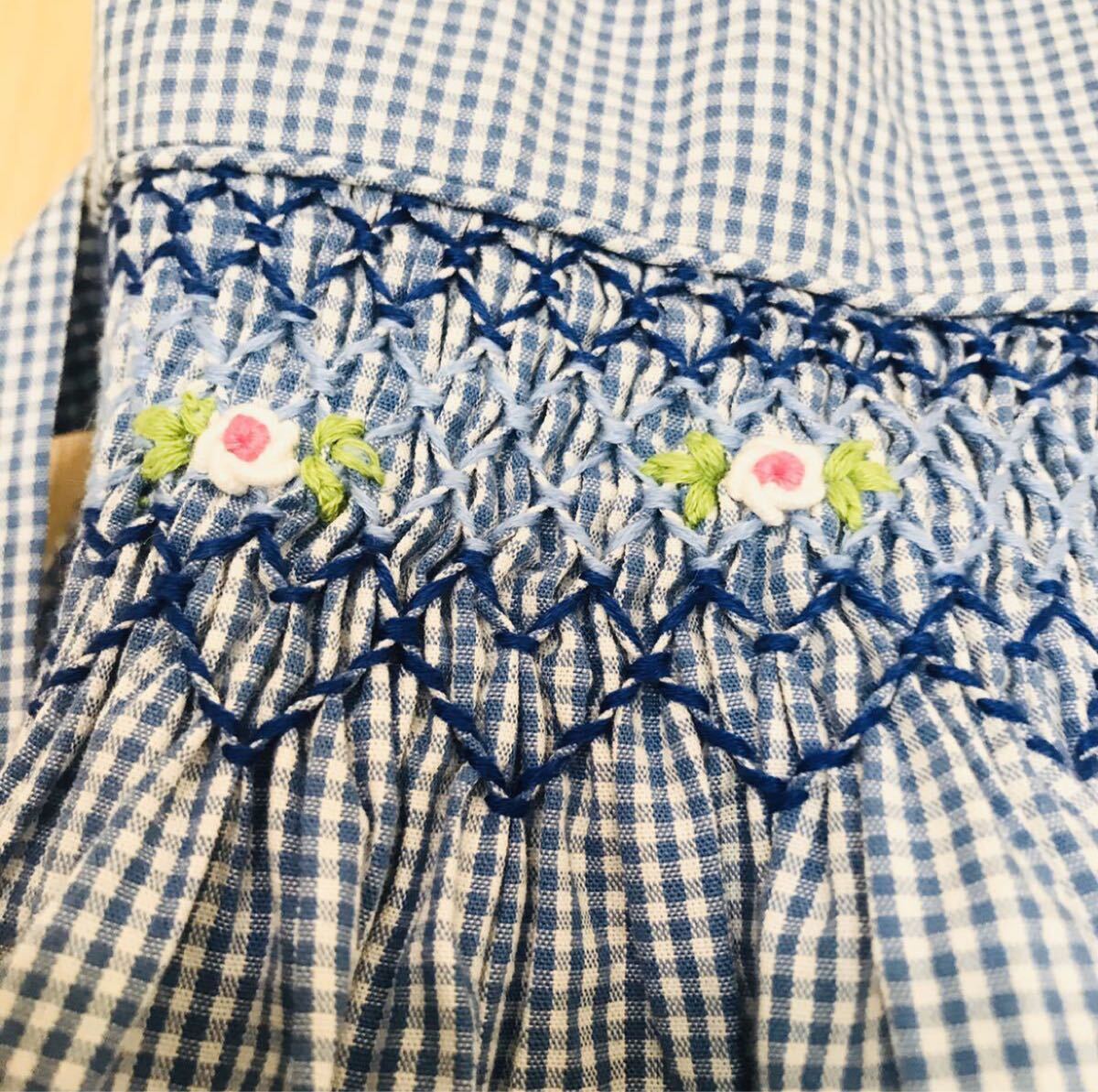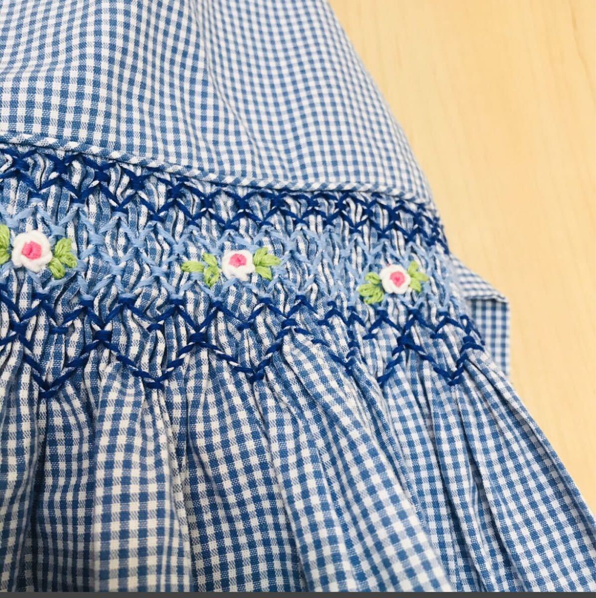 ブルーチェックのコットン生地にホワイトローズの手刺繍。貝ボタン。肩は結ぶタイプです。赤ちゃんのお出かけ服、出産祝いなどにも最適です。