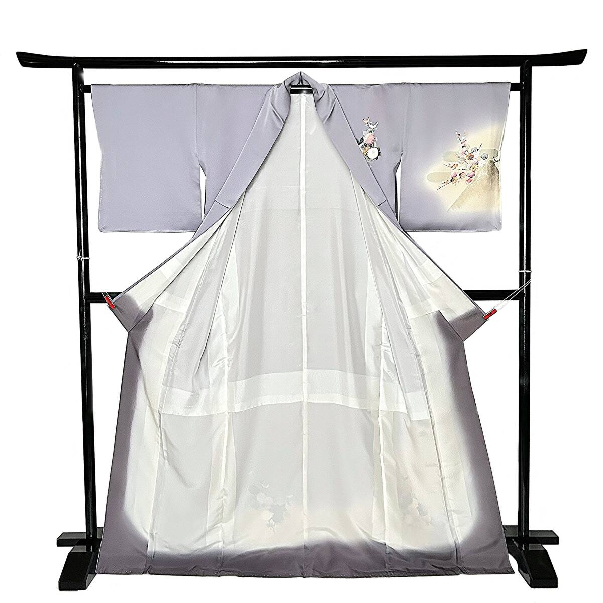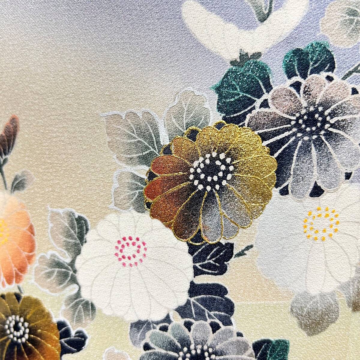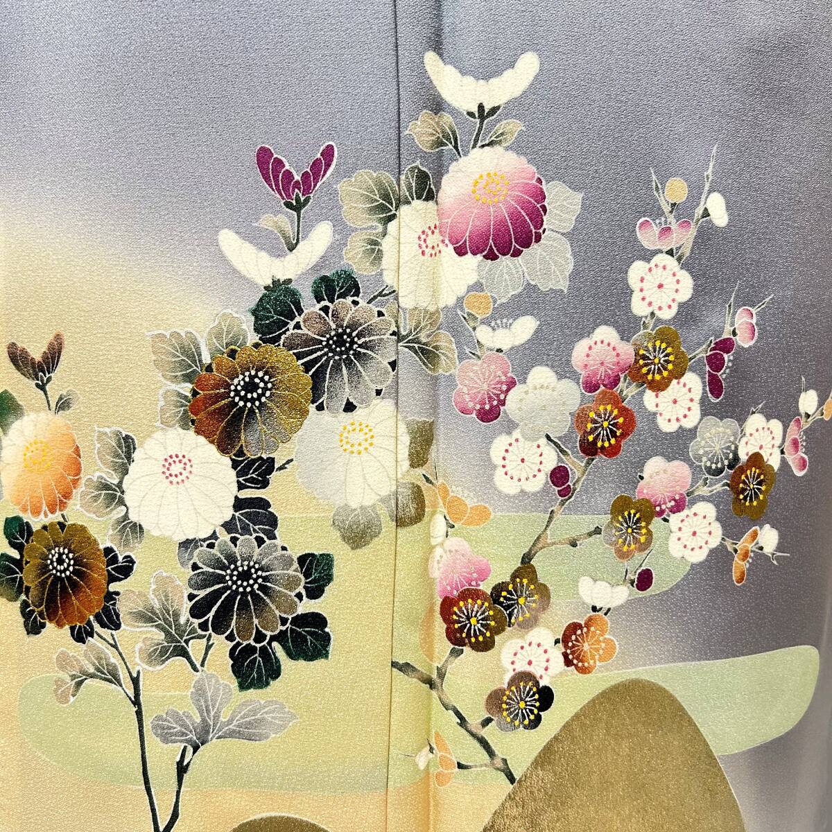 露草色をもう少し薄いパステル調にしたお色の地に、通山にエ霞、梅と菊が描かれており金銀彩加工が施されて鮮やかであるのに落ち着いた面持ちを見せてくれるお着物です。