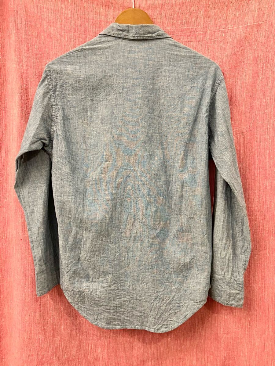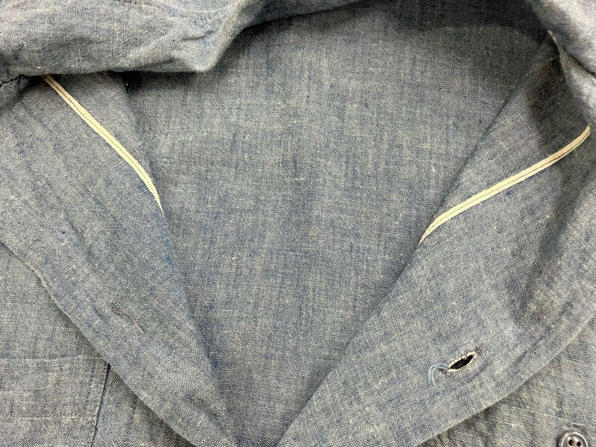 サイズ表記、コントラクトナンバーはスタンプ、セルビッチ付きのコットンシャンブレーが使用された60年代使用されたシャツです。