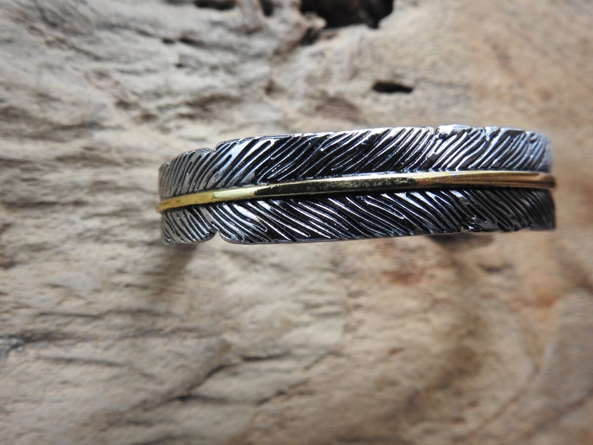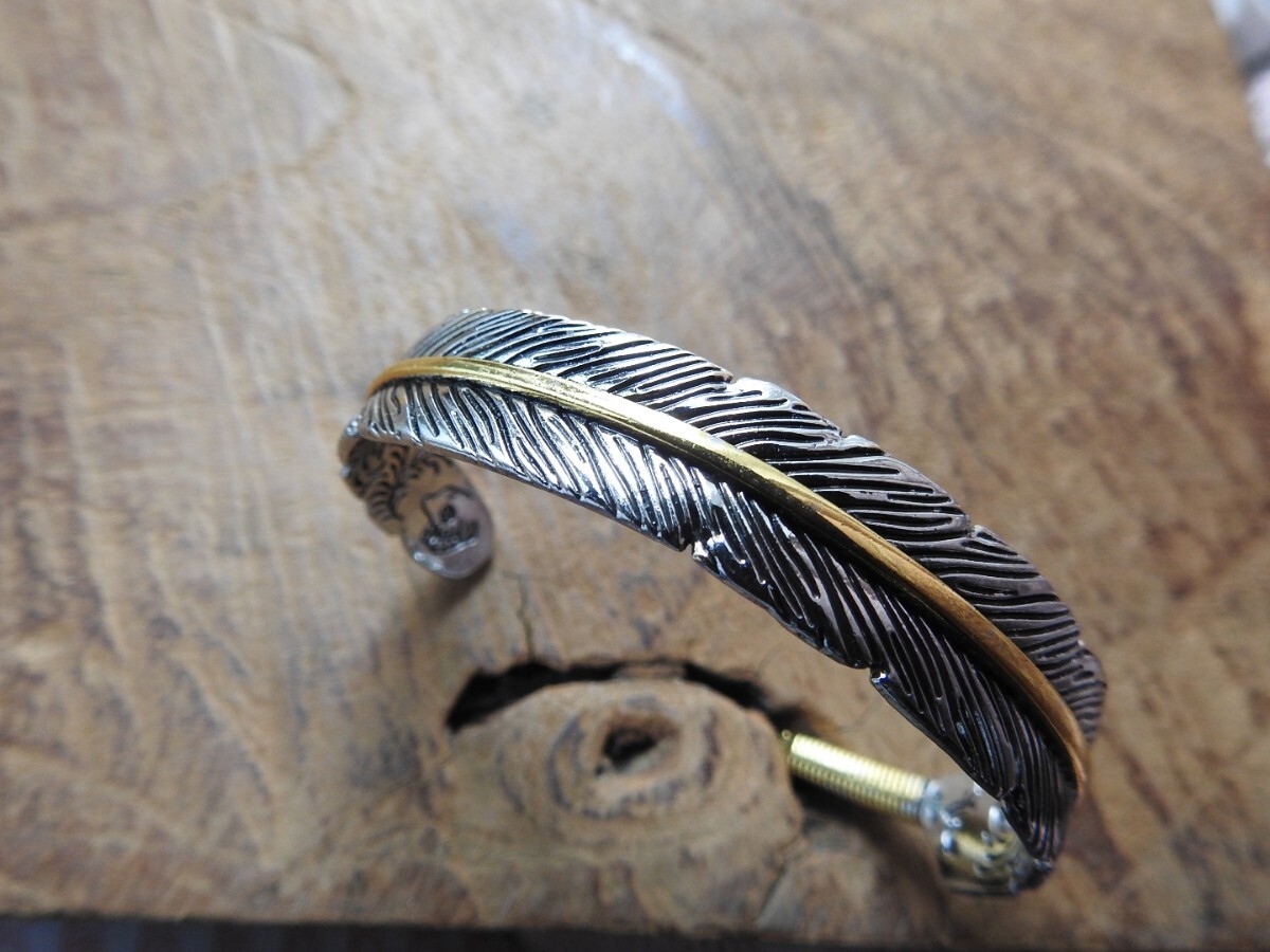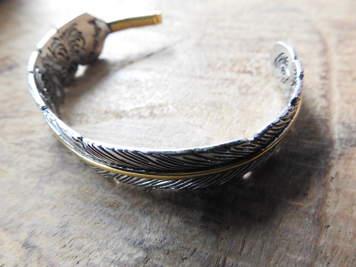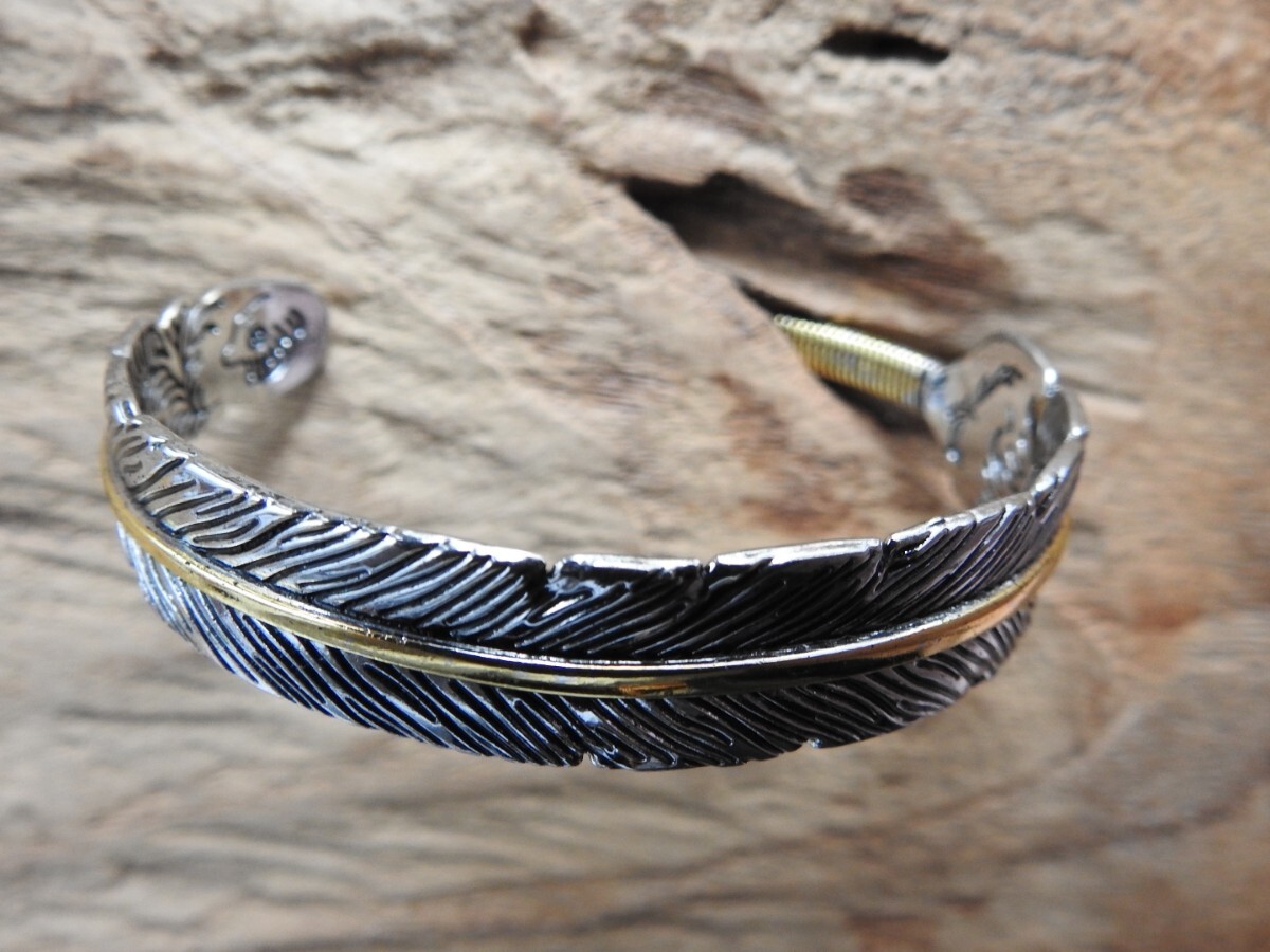 羽根モチーフのシルバーとゴールドのオープンバングル。