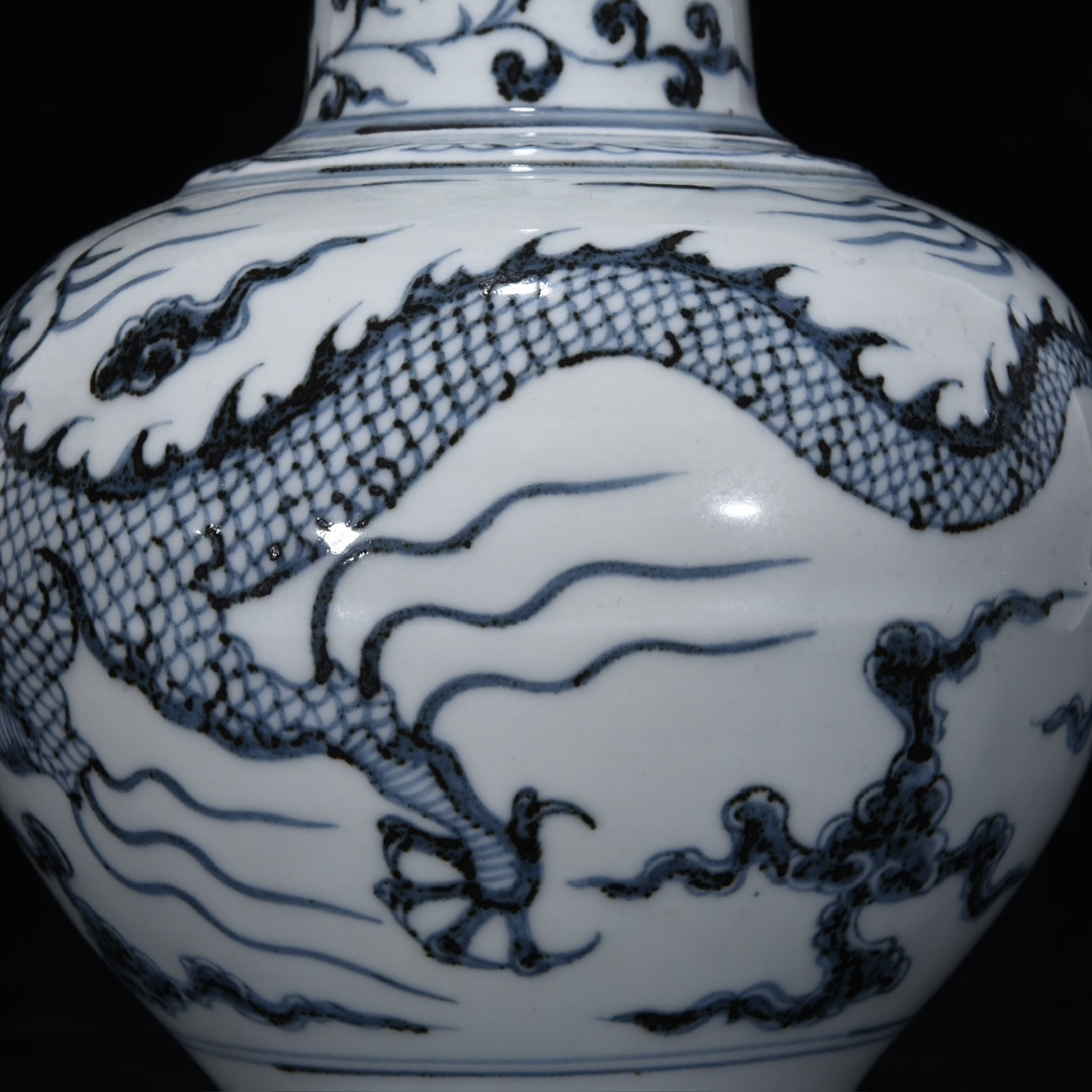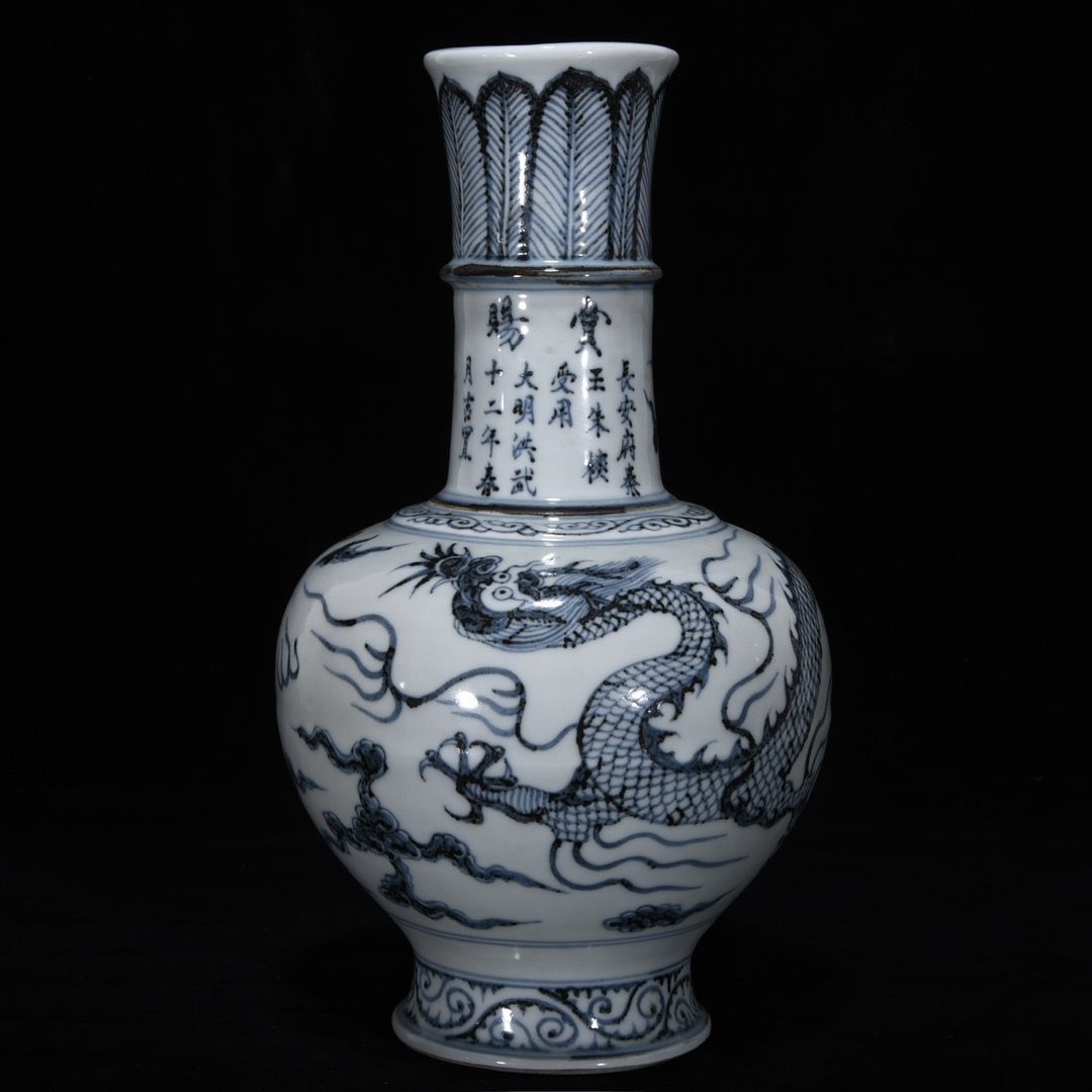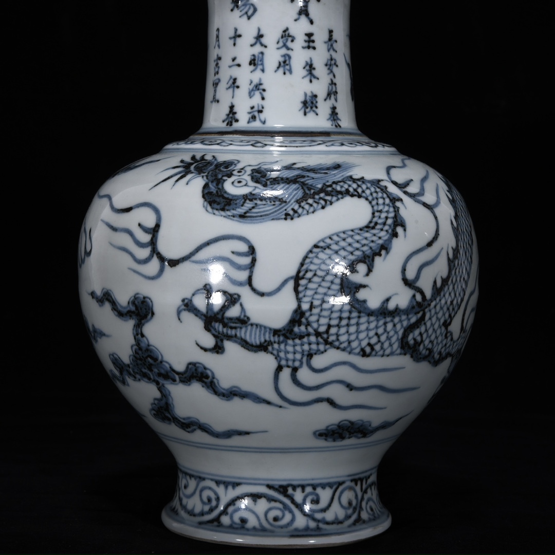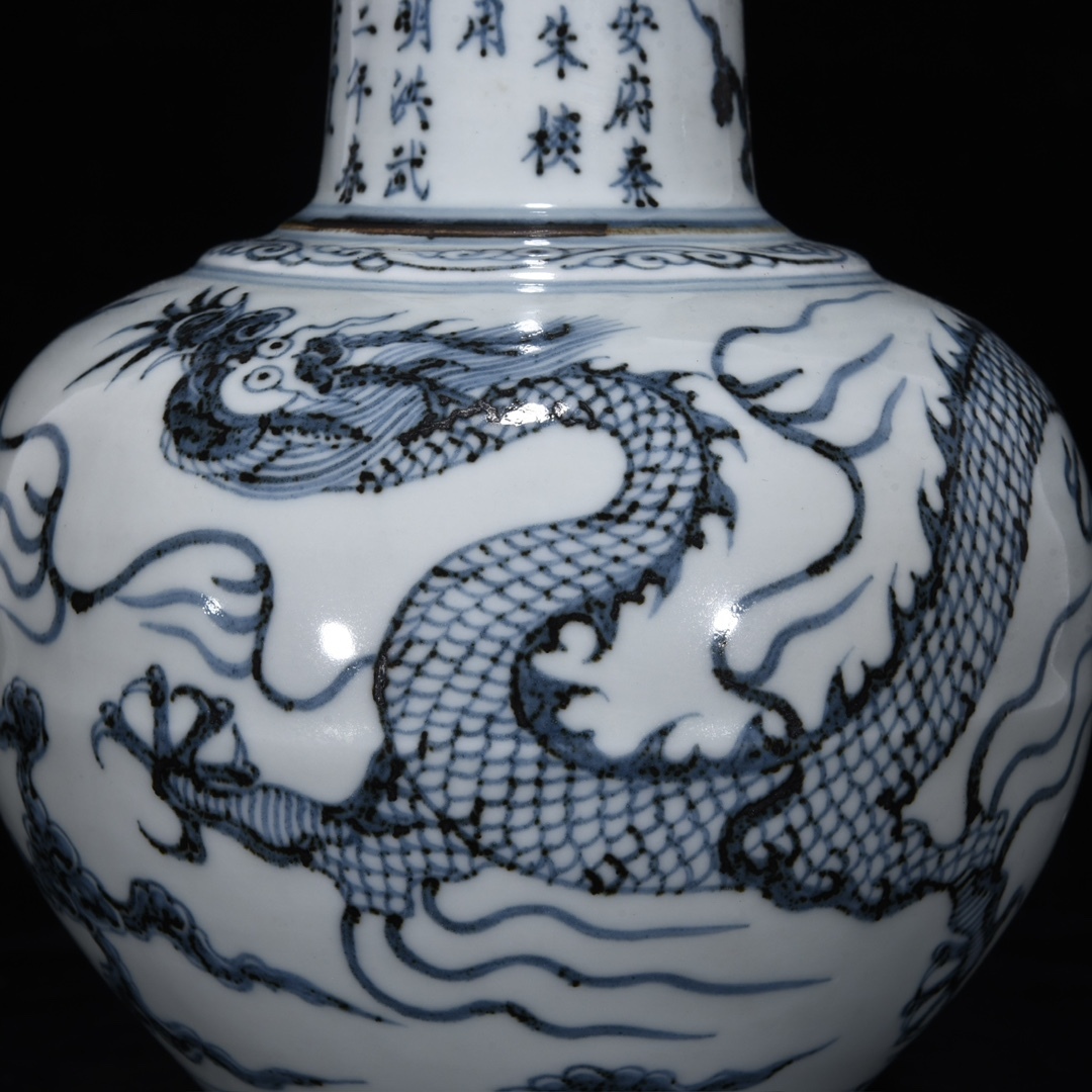 明 洪武年製款 古陶磁器 青花龍紋直徑瓶 花瓶 賞物 極細工 東洋彫刻 骨董品 古賞物 中国古玩 中国古美術