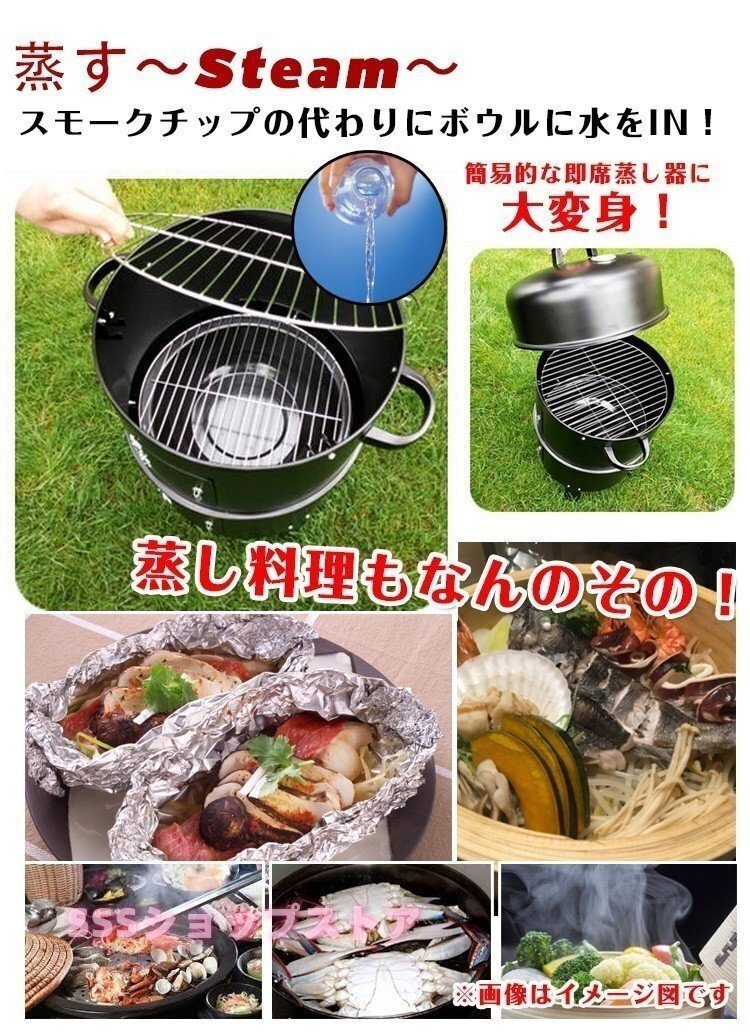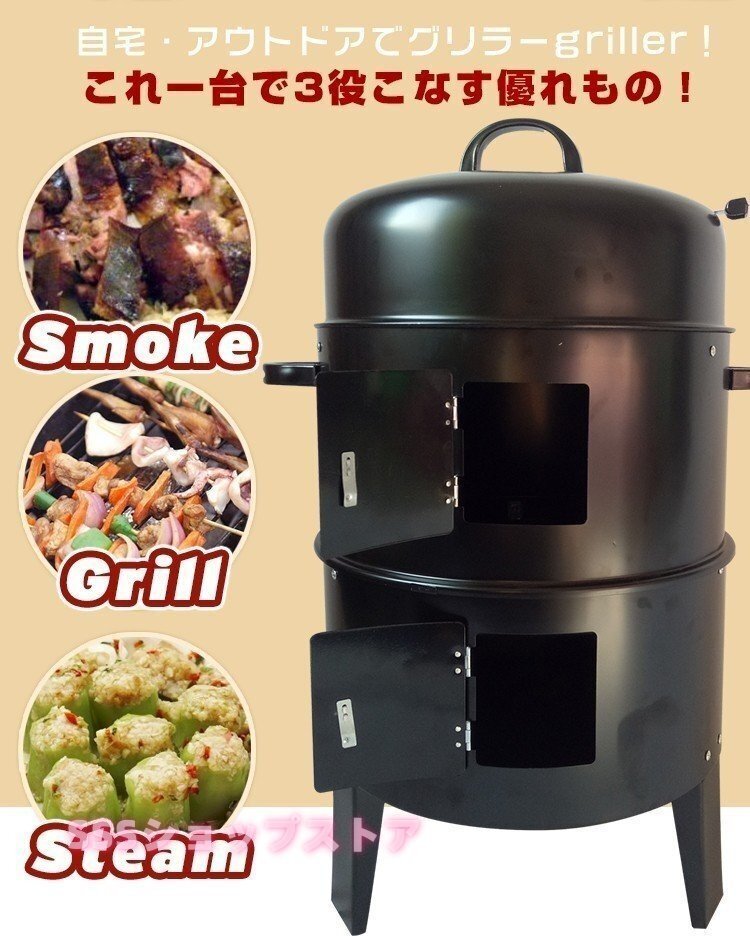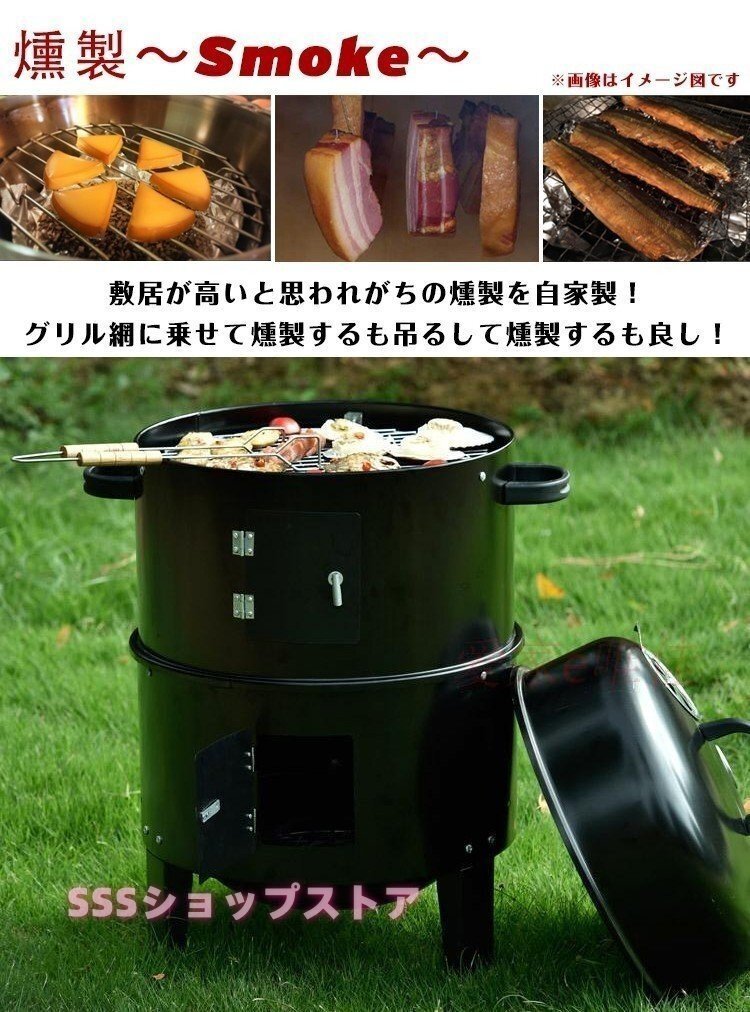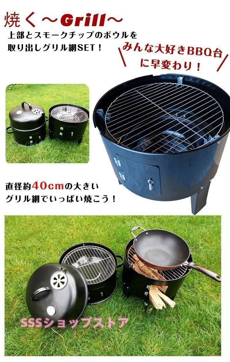 一台多役 焚き火グリル バーベキュー グリル 燻製器 BBQ グリラー 燻製 スモーク 焼肉 キャンプ 蒸す 野外 自宅 庭 組立 収納